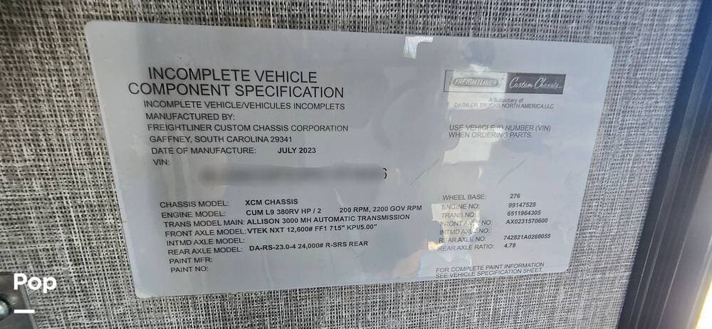 Built on the robust Freightliner Custom XCM chassis, this motorhome is powered by the formidable Cummins L9 380HP turbocharged diesel engine, which generates an impressive 1,150 lb-ft of torque and is paired seamlessly with the Allison 3000 MH automatic transmission. This proven drivetrain combination delivers confident acceleration, exceptional towing capability, and smooth, quiet highway cruising.