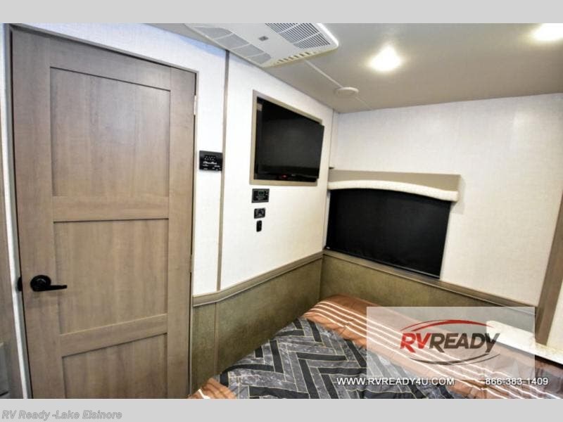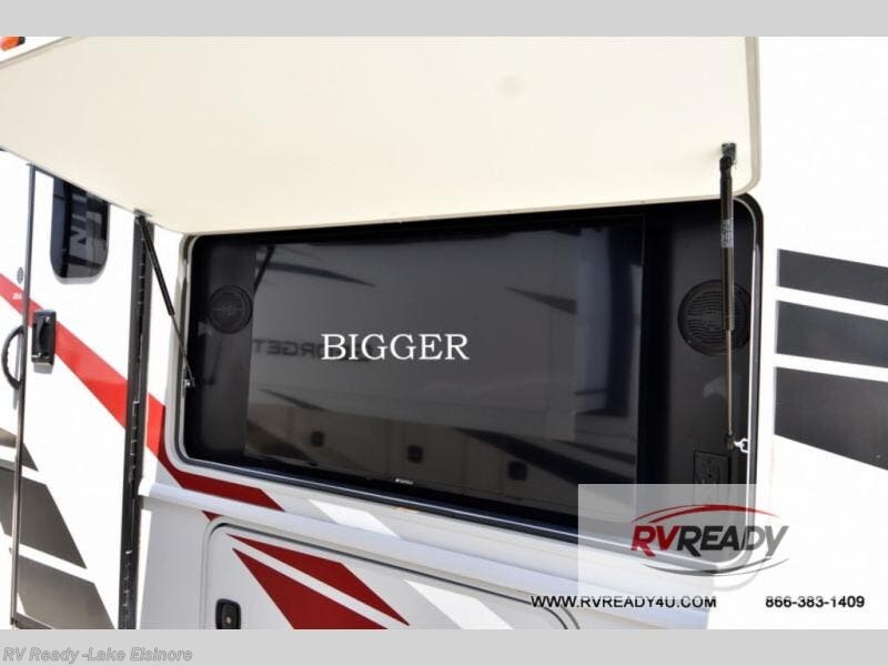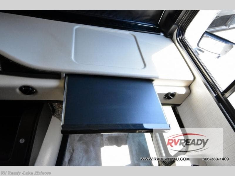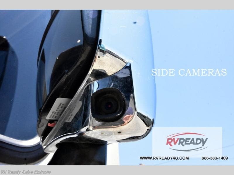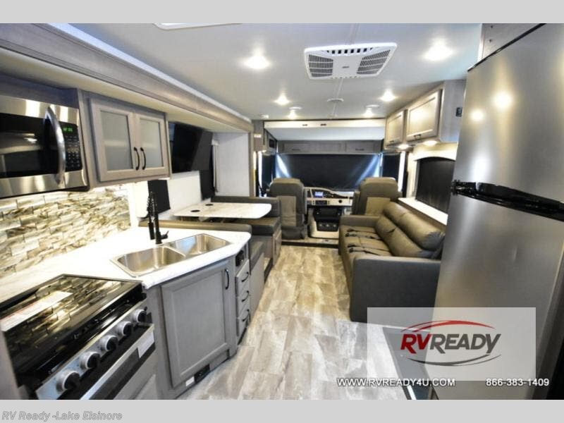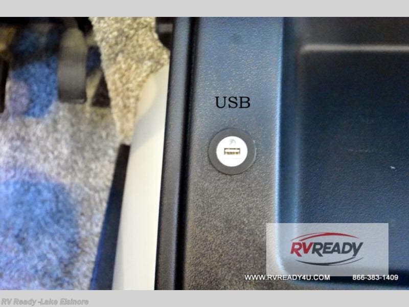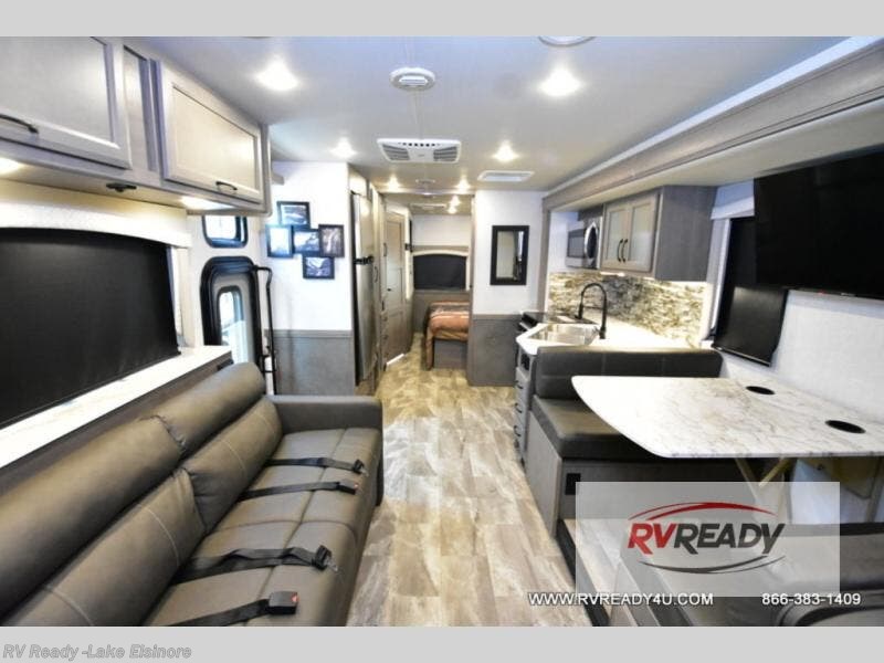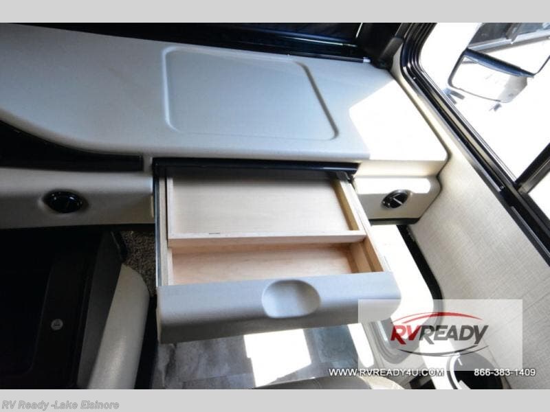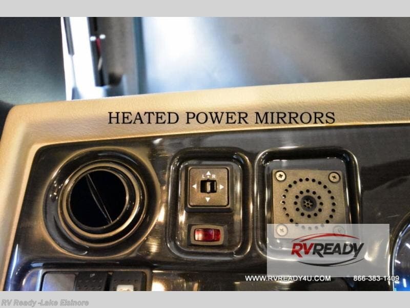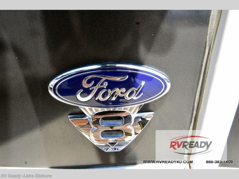 Step up your camping game by adding the Fleetwood Flair Class A gas motorhome to the line-up! The 7.3L 350HP engine with 468 LB/FT of torque forms the base, and the 8,000-LB towing capacity gives you the chance to bring a car with your coach. On the exterior you'll find an automotive, bonded one-piece windshield, exterior-mounted sideview cameras, and an exterior LED TV. The interior is decked out with a Sony dash radio, an all-new electronic instrument panel, a digital dash, and reclining/swivel cab chairs. There is also a workstation at the automotive-style dash, and the Bluetooth coach system in the bedroom has exterior speakers for fun party nights.