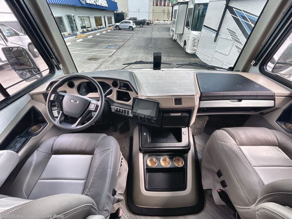 The Fleetwood Fortis Class A gas motorhome is a powerhouse of luxury and convenience, and it also is quite literally a powerhouse with its Ford 7.3L V8 350HP engine with 468 LB/FT of torque. The construction includes a Dryseal edge coating for all ceilings, walls, and floor, and the Powerlock System 2 has interlocking walls to the roof for stability. Automatic hydraulic leveling jacks make the set-up process easier, and the cab has excellent features, like a 9" stereo with AM/FM/Bluetooth, backup camera, reclining/swivel cab seats, driver/passenger center table, and an automotive-style dash with dual monitors and workstation. You will find vinyl tile flooring all throughout the interior, as well as full-extension drawer guides with latches, coordinating window treatments, and energy-efficient LED flush-mount ceiling lighting.