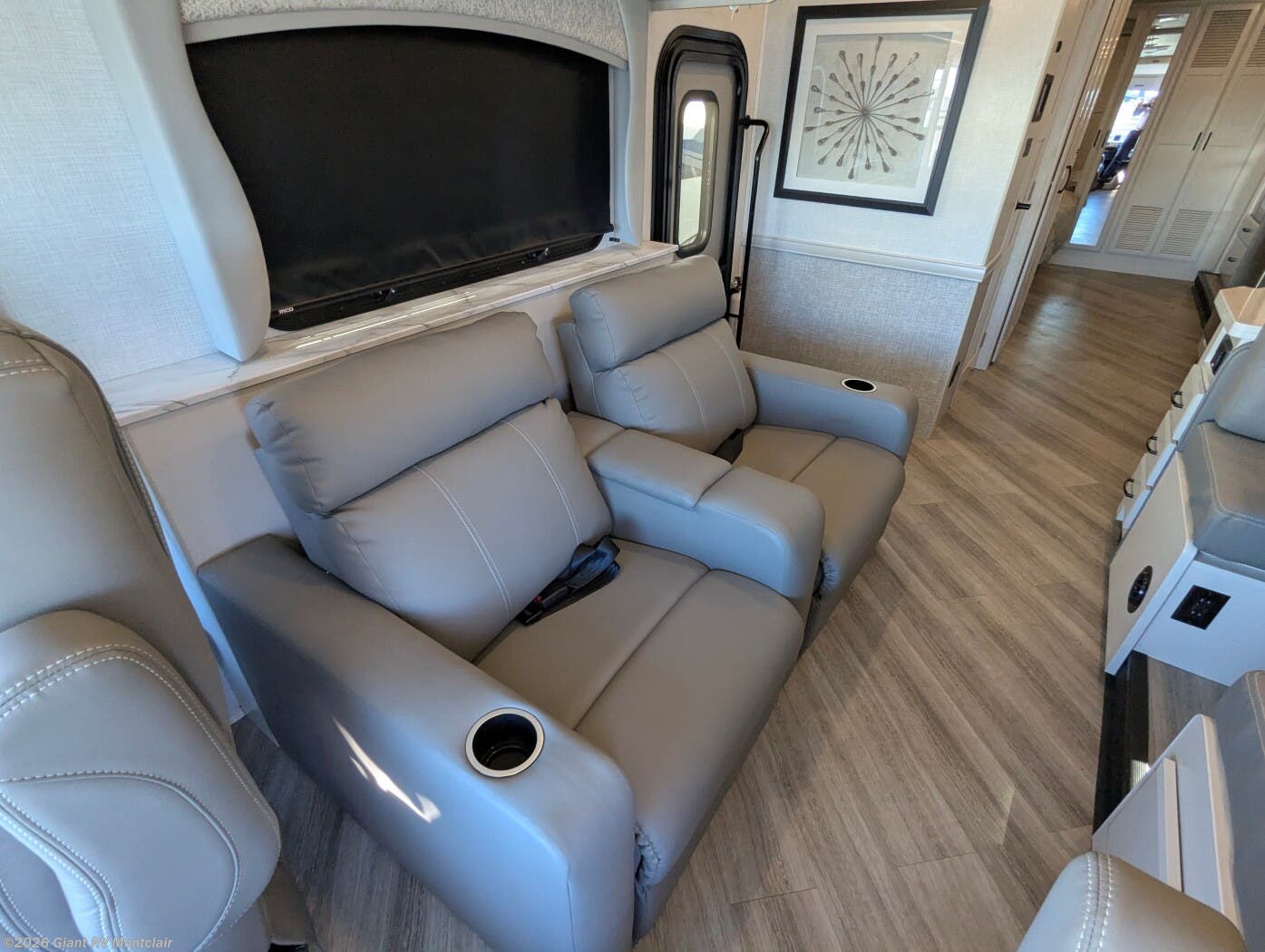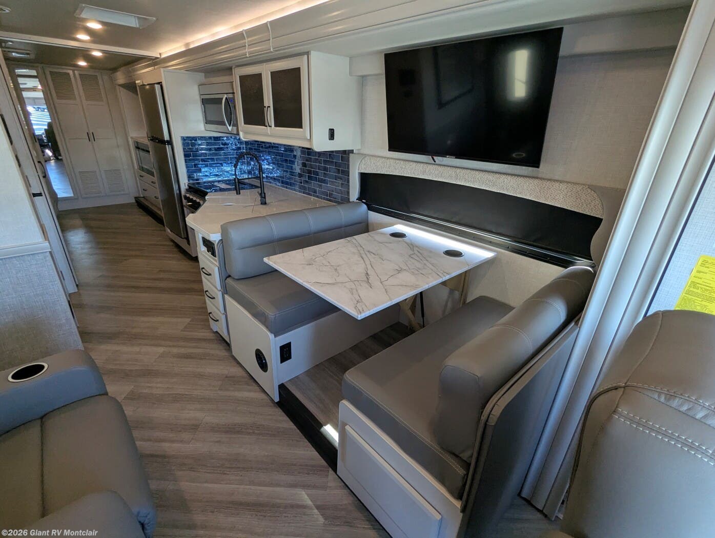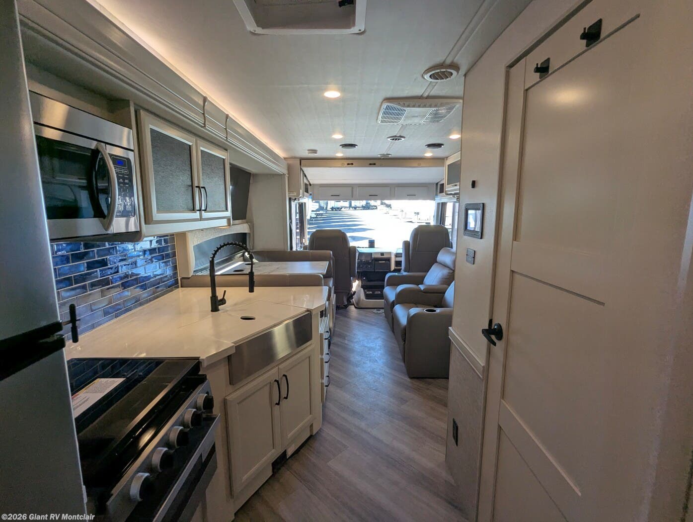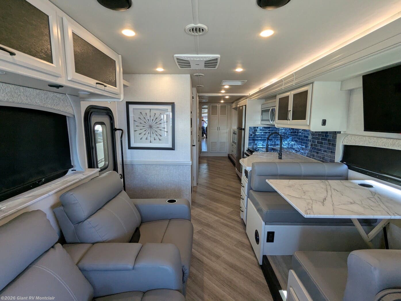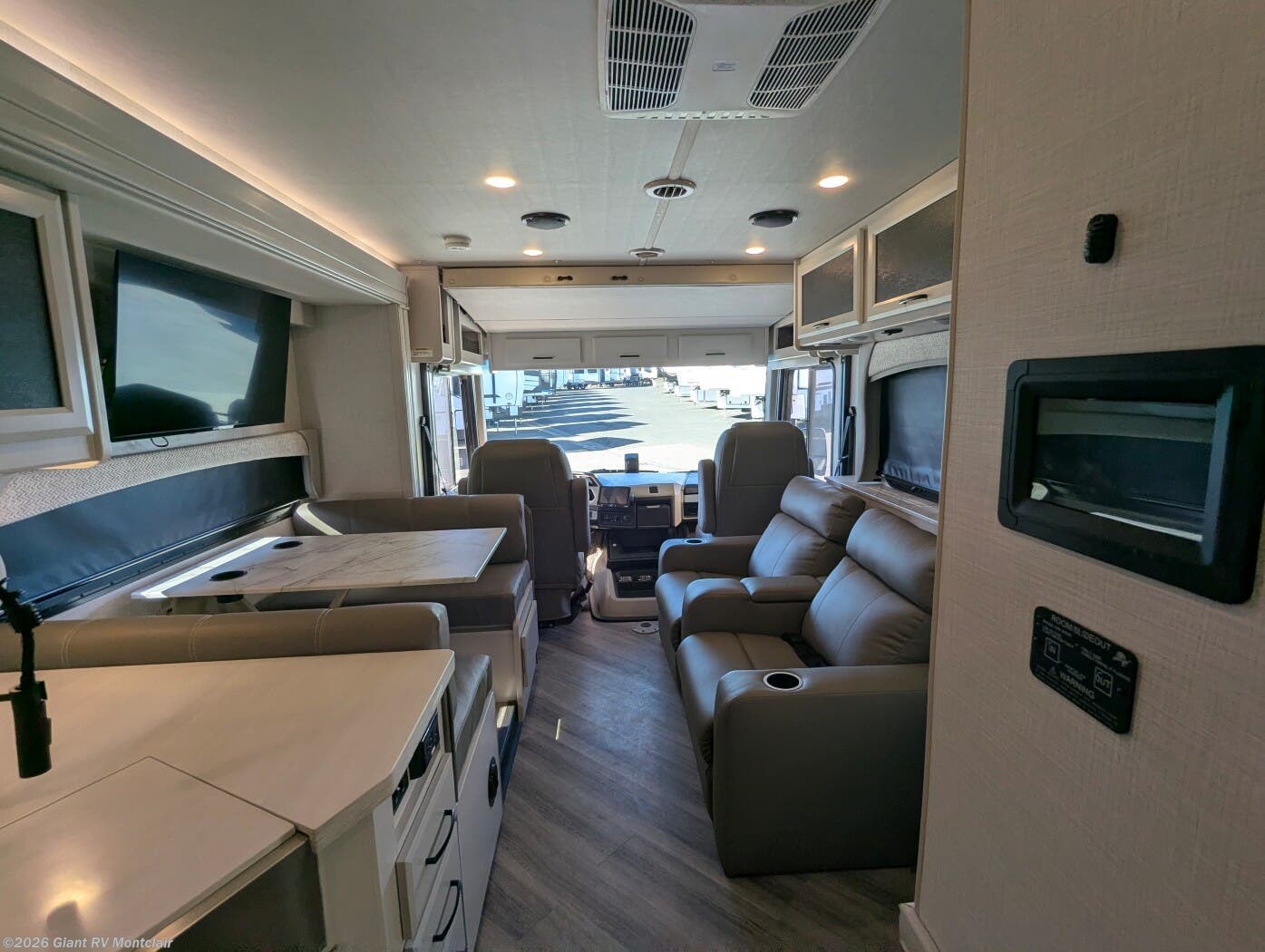 - Rear Living Layout with opposing slides, abundant seating, panoramic windows, and an entertainment center — creating a relaxing space for lounging or gathering after a long drive.