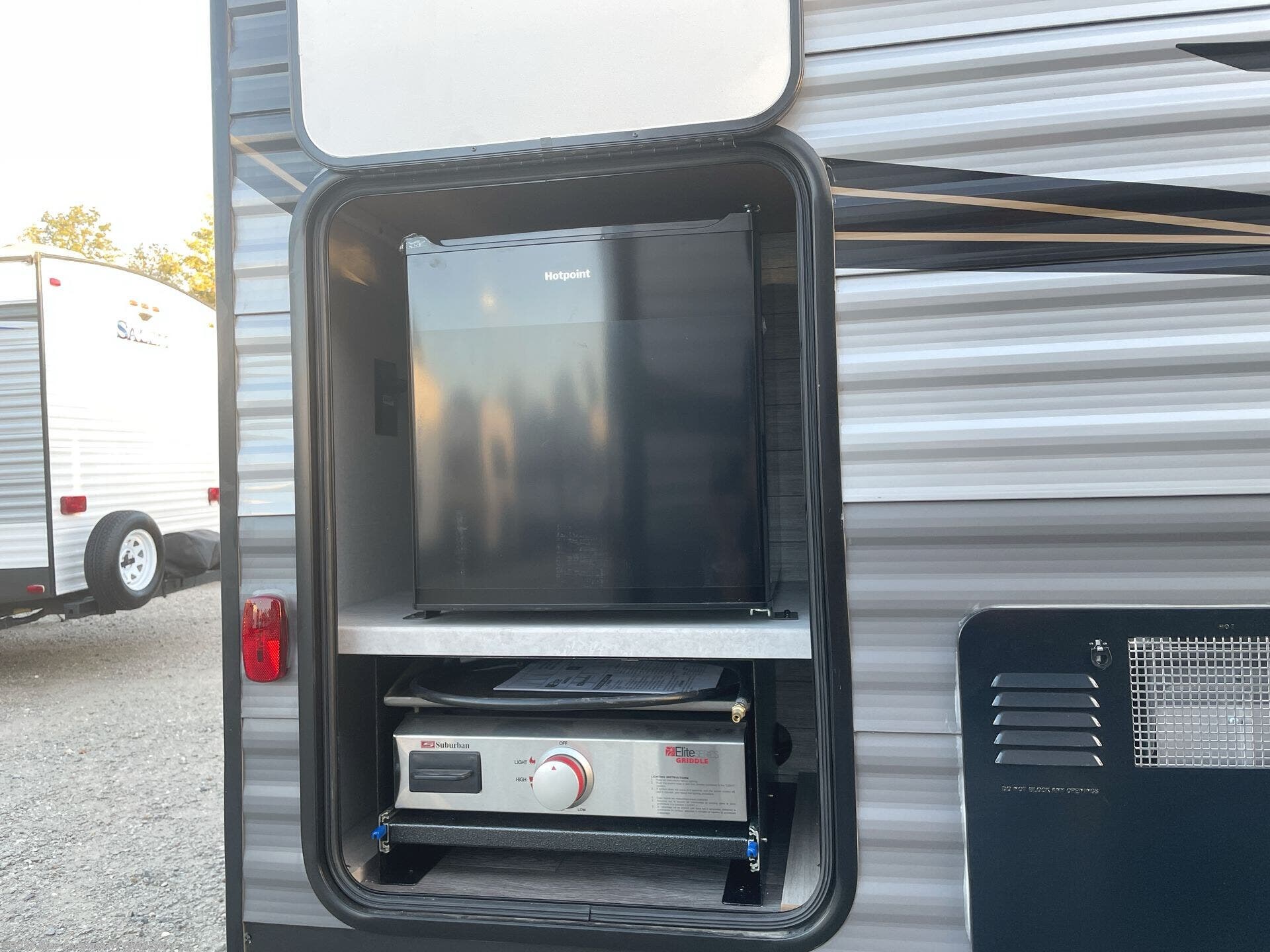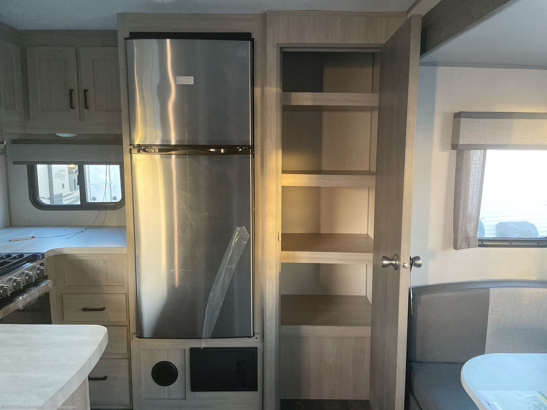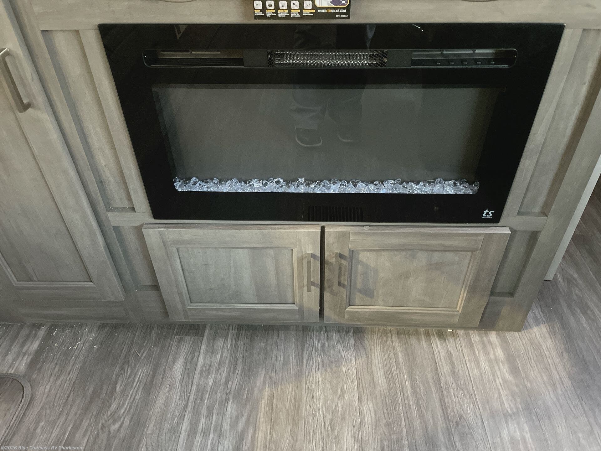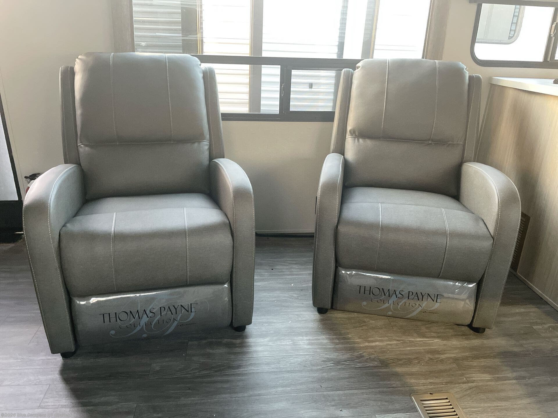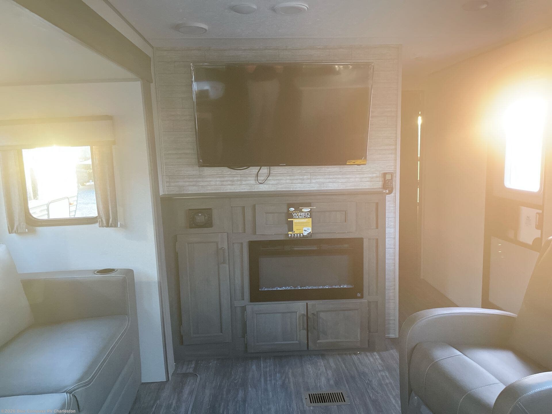 The chef will love cooking in the rear kitchen of this travel trailer! You will feel right at home in the front private bedroom with the 60" x 74" queen bed slide across from a dresser and a front closet that has an area prepped for an optional washer and dryer. There is an optional fireplace and entertainment center in the living area in by the two recliner lounge chairs and the 68" sofa next to the 45" booth dinette. Stay clean and fresh with the 36" x 30" shower pan with a skylight above for natural lighting as you get ready in the full bathroom. The 21' electric awning has multicolor lights for you to choose your favorite color as you enjoy a refreshing beverage from the mini fridge!