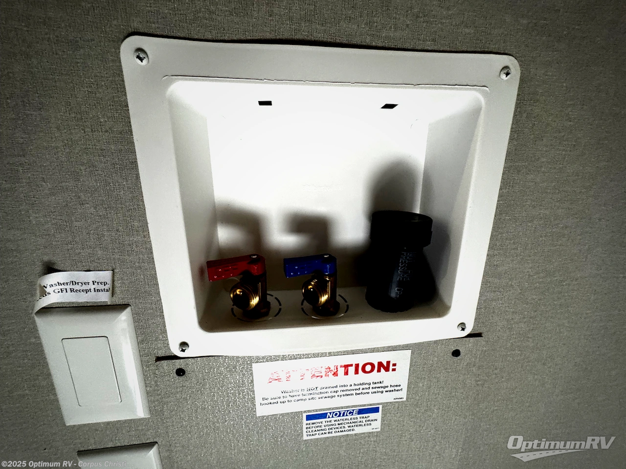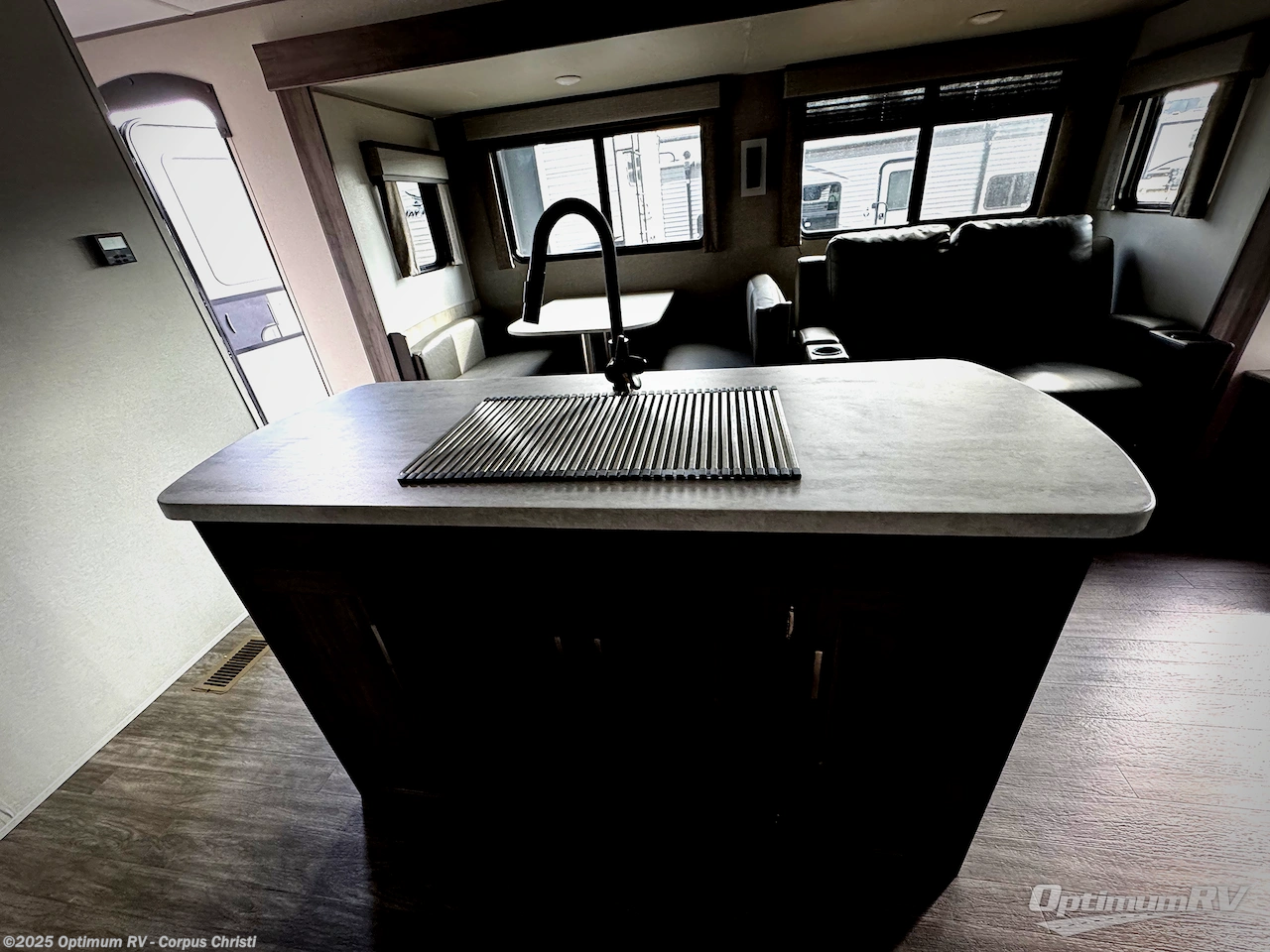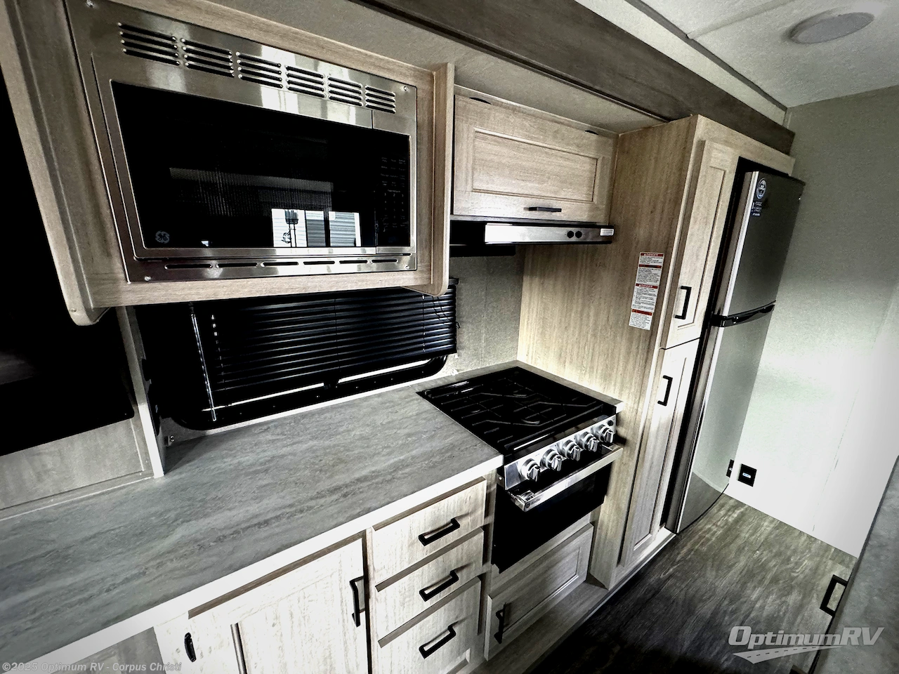 This travel trailer will feel a little more like home with its front private bedroom that includes a 60" x 74" queen bed, plus two closets for storage. And one of the closets includes washer and dryer prep if you choose that option. The rear living area will be a favorite hangout spot with its 68" sofa, theater seating, and entertainment center, plus there is a booth dinette for dining or game night. A kitchen island comes standard, along with a 12V 10.7 cu. ft. refrigerator, a three burner cooktop, plus a microwave oven; everything you need to make home-cooked meals!