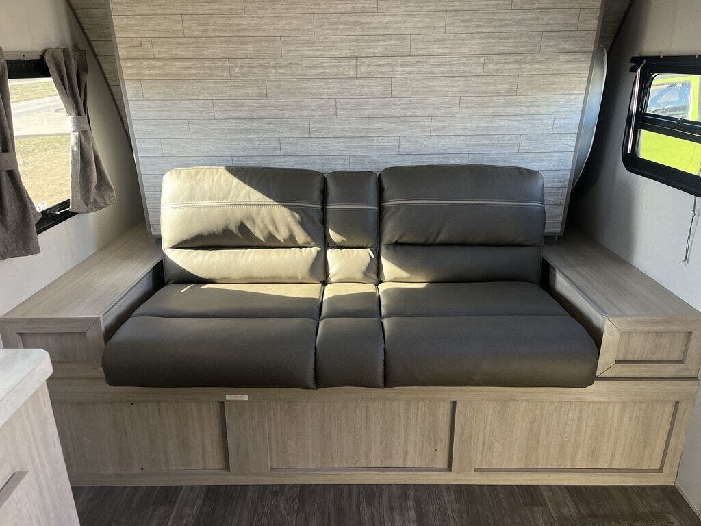 This value price point Aurora Light allows you versatility as you camp! You can sleep comfortably each night on the Murphy bed up front, then fold it away in the morning to relax on the sofa. There are dual nightstands for your things, plus overhead storage. This Aurora kitchen includes a 12V 10 cu. ft. refrigerator, a two burner cooktop, plus a microwave oven to easily make meals each day, and the full rear bath will come in handy after a day at the lake. After dinner, relax on the sofa, or head outdoors to relax under the 10' awning!