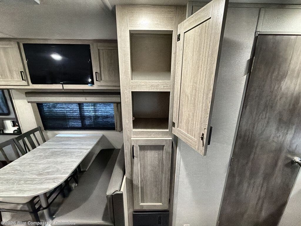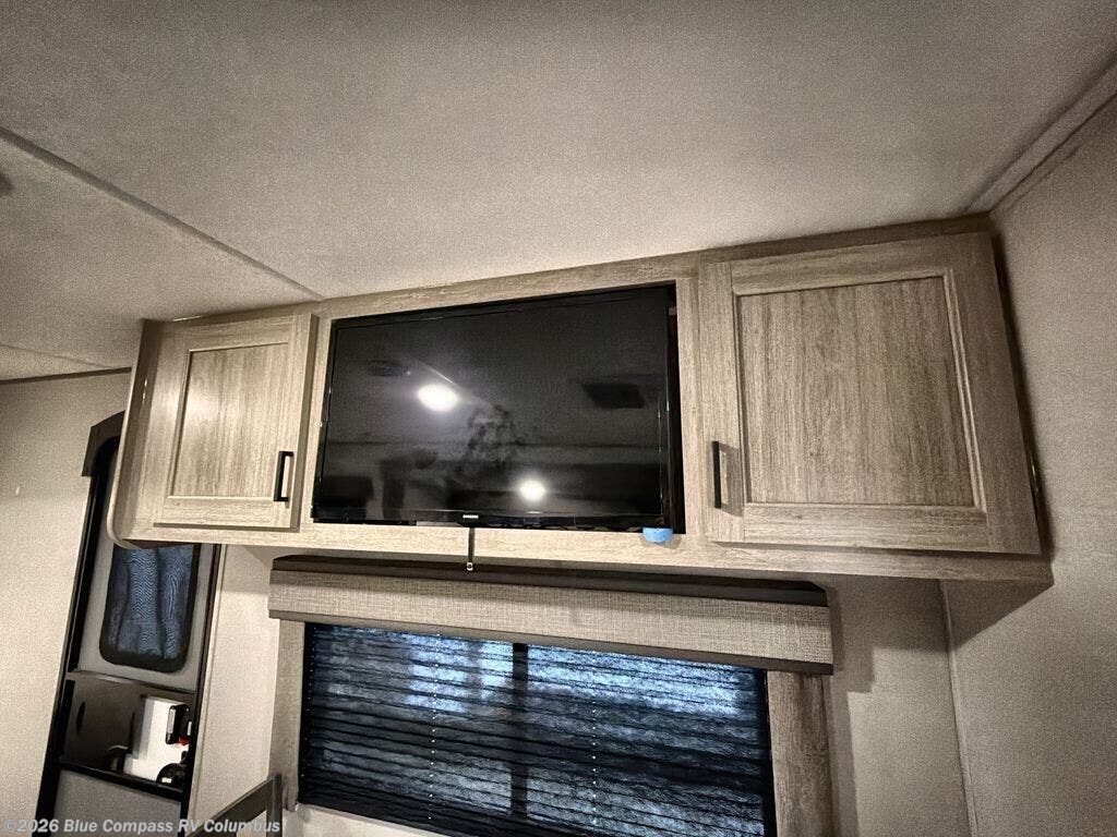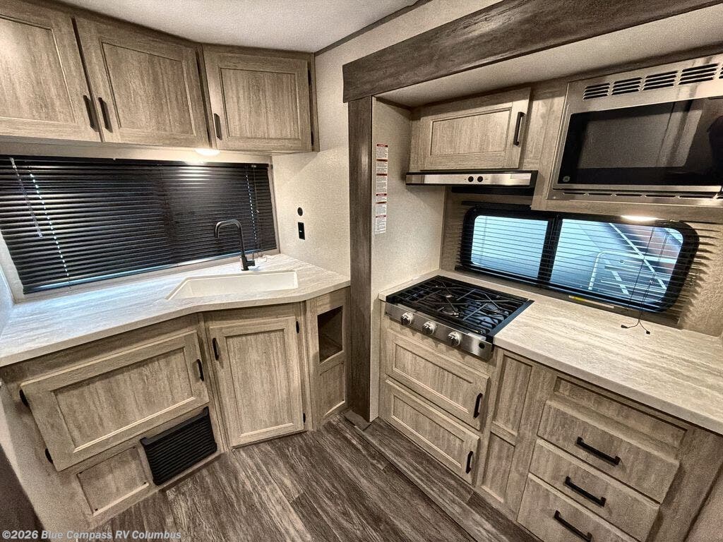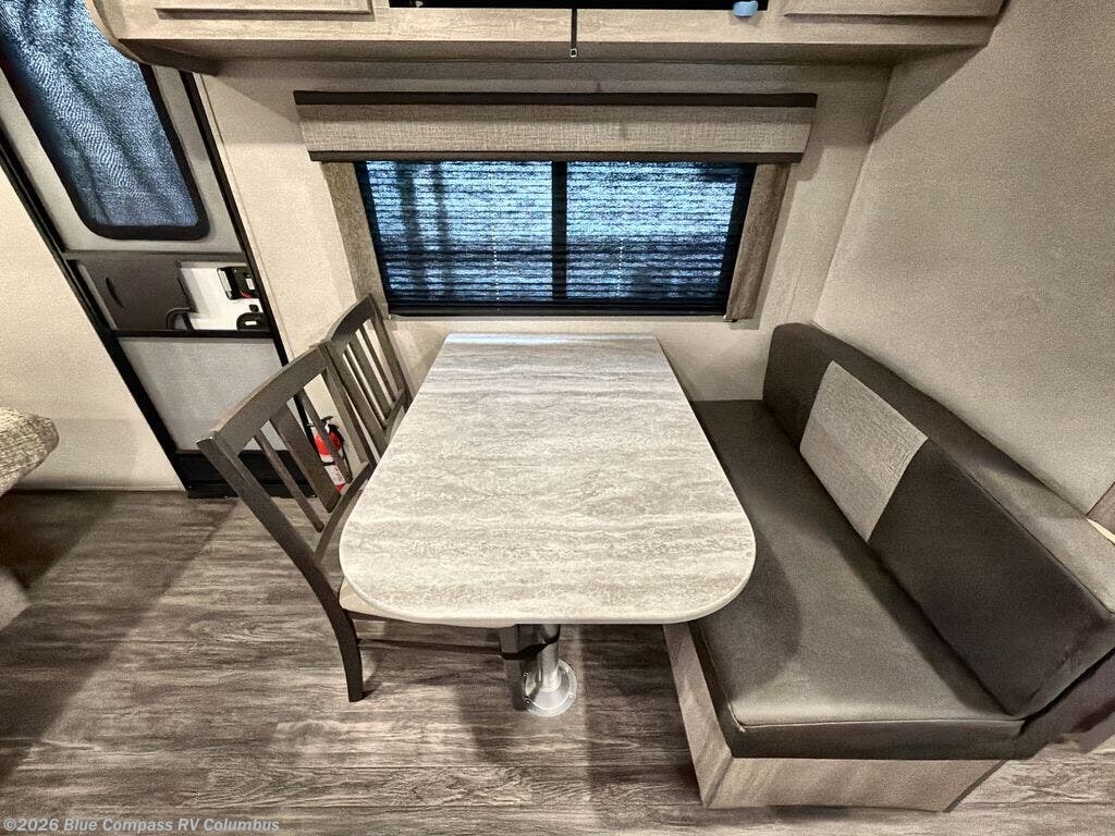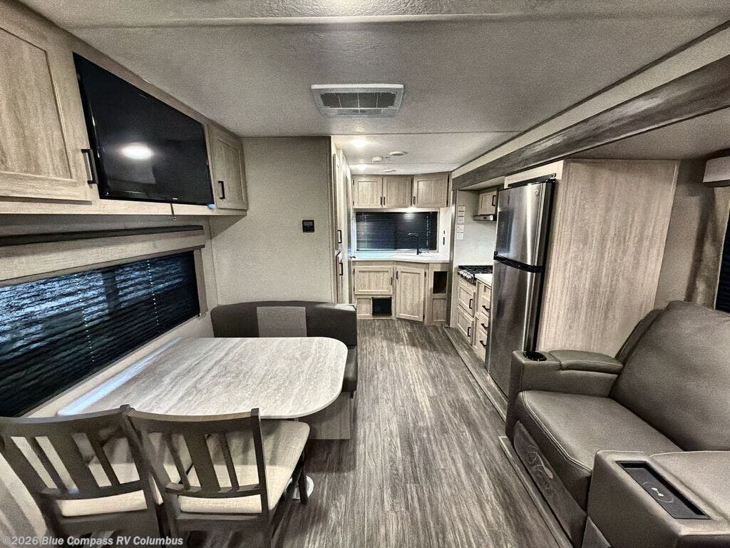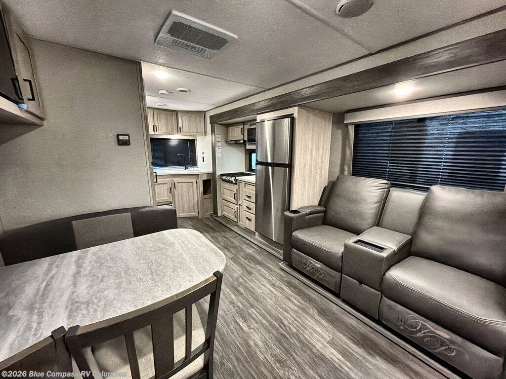 The chef will love cooking in the rear corner kitchen of this travel trailer! You will feel right at home in the front private bedroom with a 60" x 74" RV queen bed with dual bedside wardrobes and an overhead shelf for your personal items. There is a dinette with one bench seat and two chairs just to the left of the entry door for dining, and there is a TV mount above plus overhead cabinets for storage. Opposite, a slide out featuring a 68" theater seat, plus the kitchen appliances. Stay clean and fresh with the rear corner bath including a 36" x 30" shower featuring a skylight above for natural lighting as you get ready each morning. The 10' electric awning has multicolor lights for you to choose your favorite color as you enjoy an evening outside beneath it with family and friends. A nice pass-through storage compartment will hold your camp chairs and outdoor games, plus more.