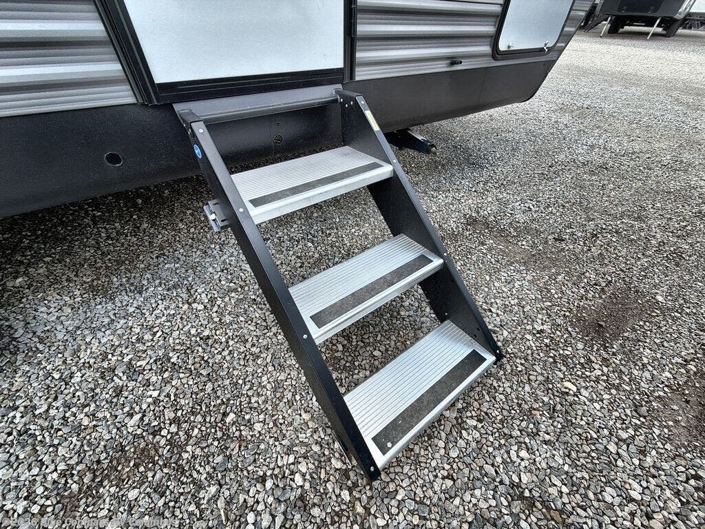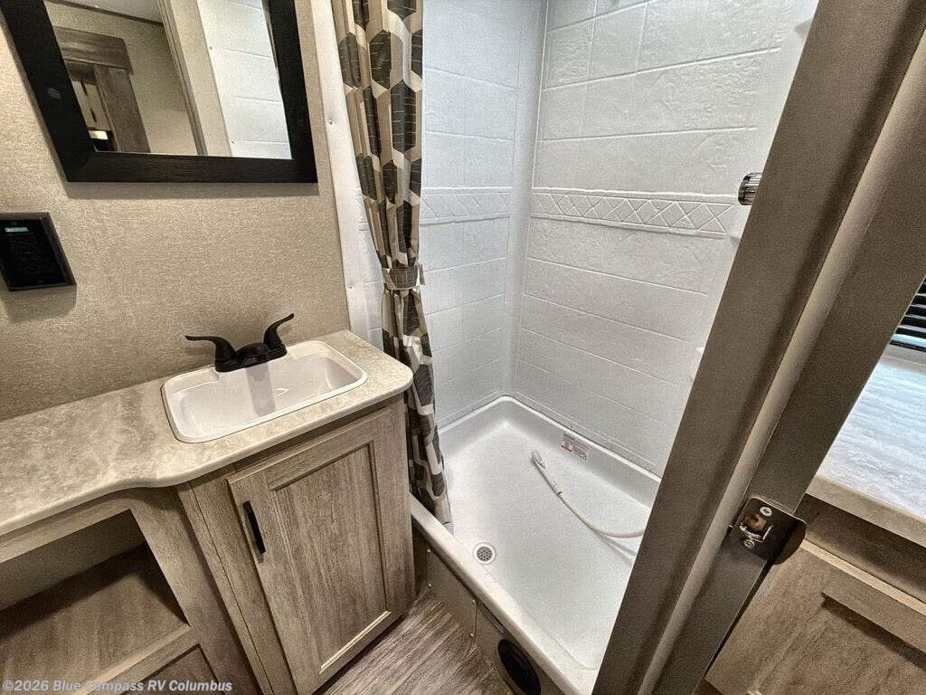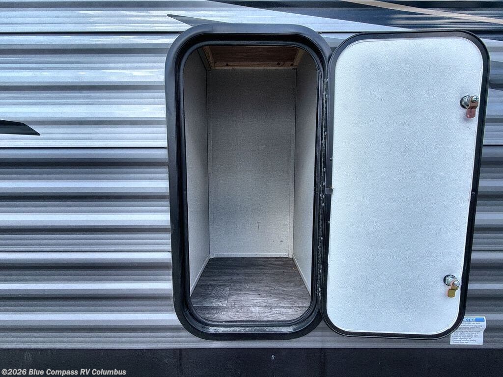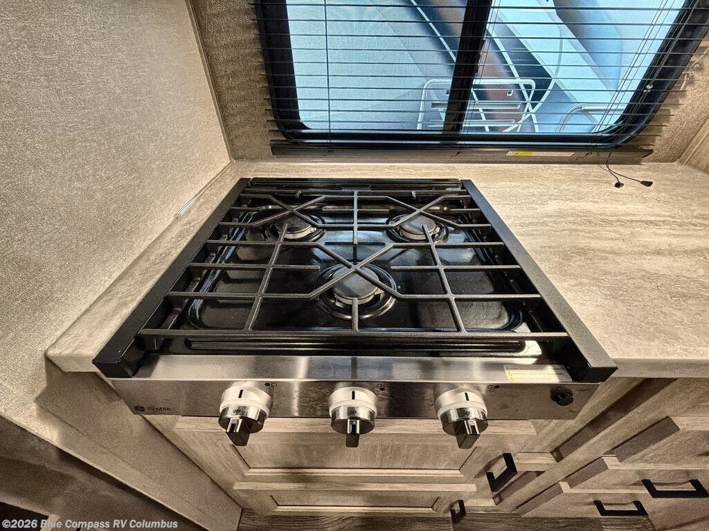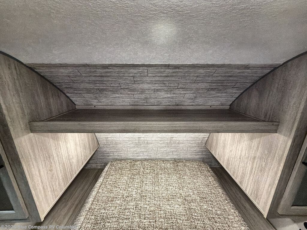 The chef will love cooking in the rear corner kitchen of this travel trailer! You will feel right at home in the front private bedroom with a 60" x 74" RV queen bed with dual bedside wardrobes and an overhead shelf for your personal items. There is a dinette with one bench seat and two chairs just to the left of the entry door for dining, and there is a TV mount above plus overhead cabinets for storage. Opposite, a slide out featuring a 68" theater seat, plus the kitchen appliances. Stay clean and fresh with the rear corner bath including a 36" x 30" shower featuring a skylight above for natural lighting as you get ready each morning. The 10' electric awning has multicolor lights for you to choose your favorite color as you enjoy an evening outside beneath it with family and friends. A nice pass-through storage compartment will hold your camp chairs and outdoor games, plus more.