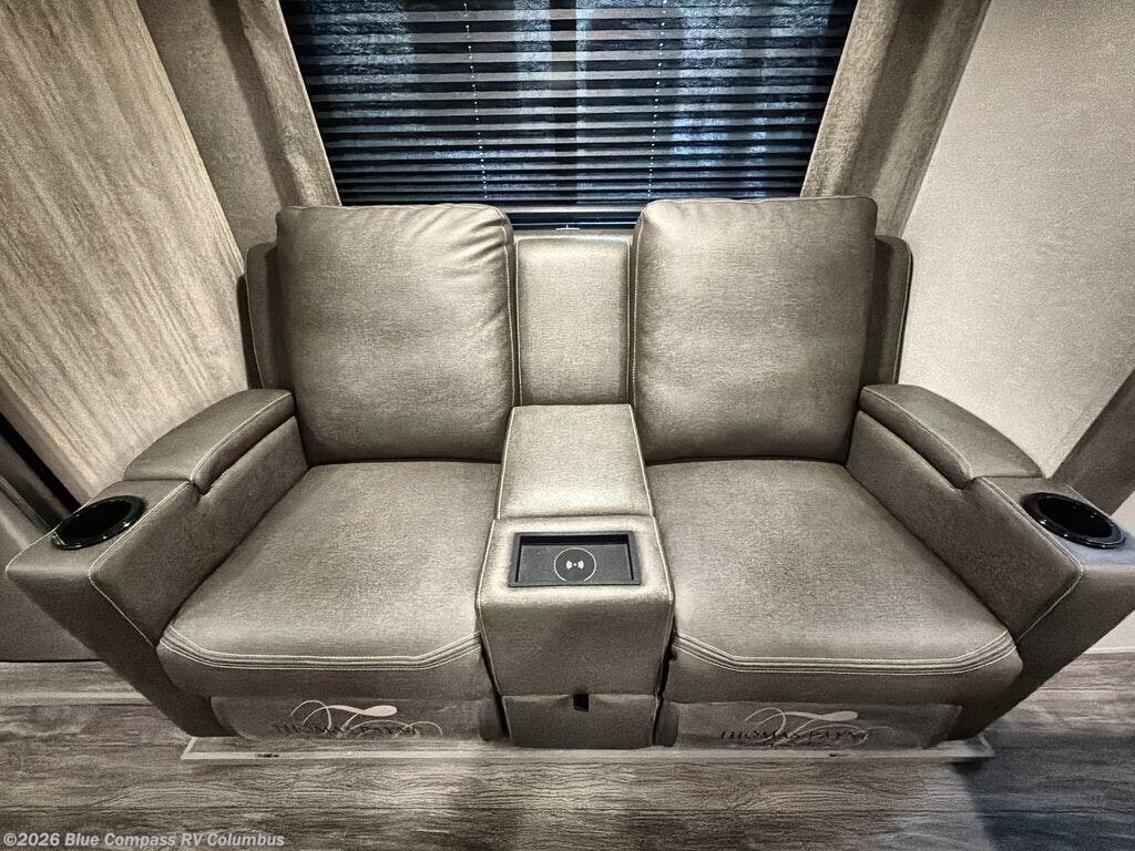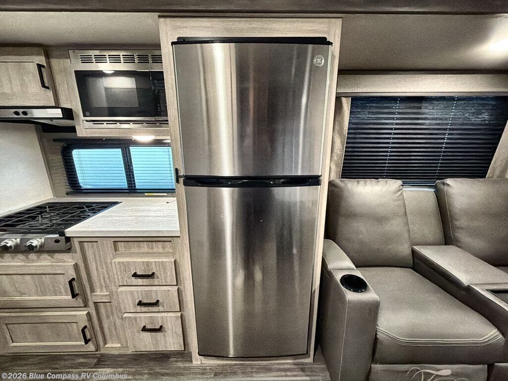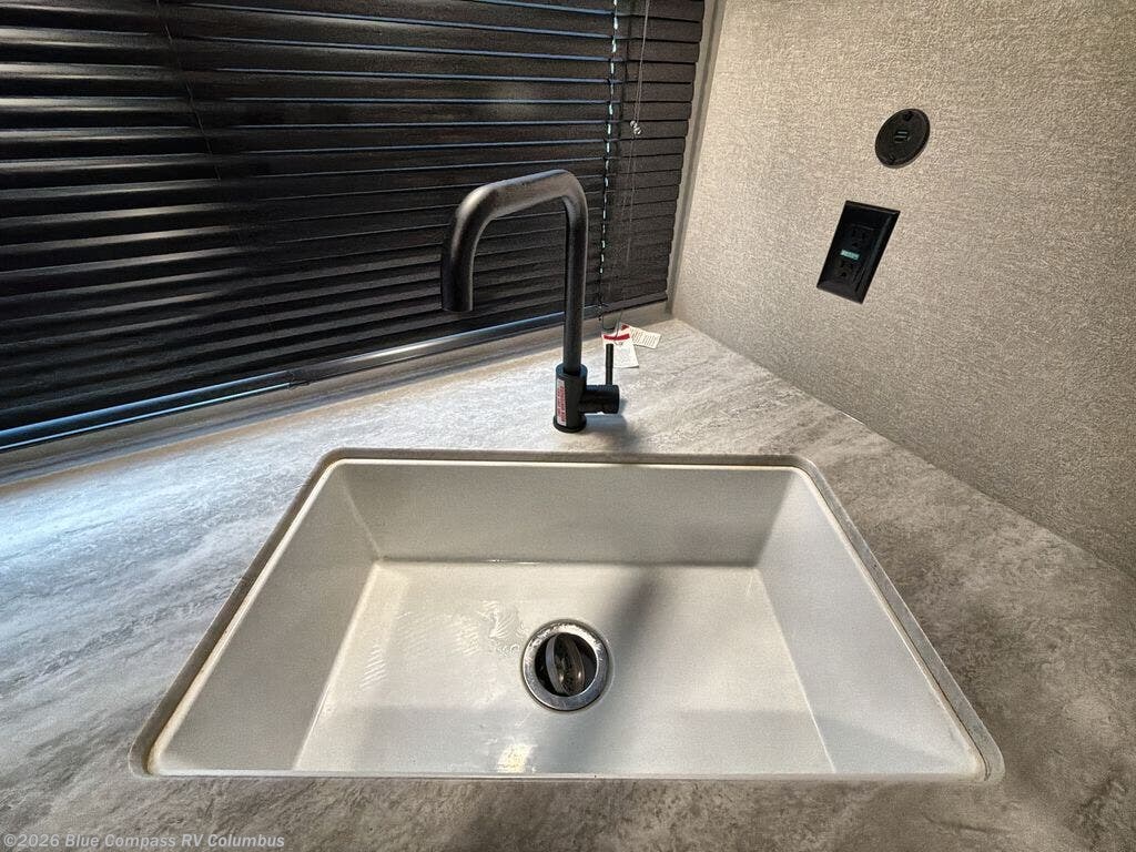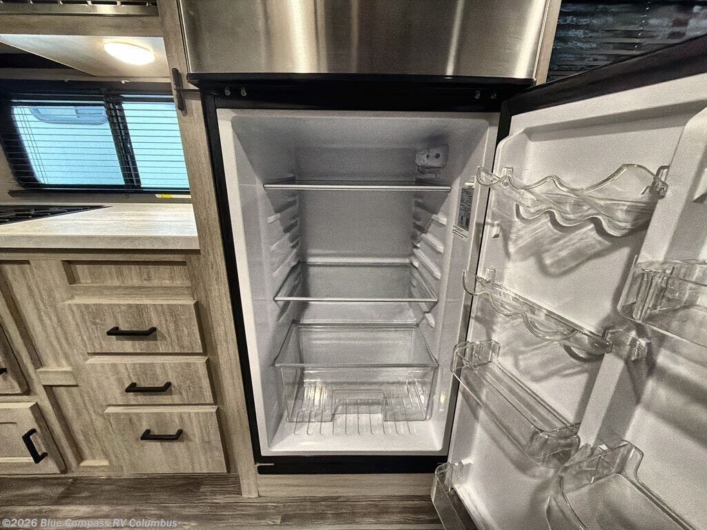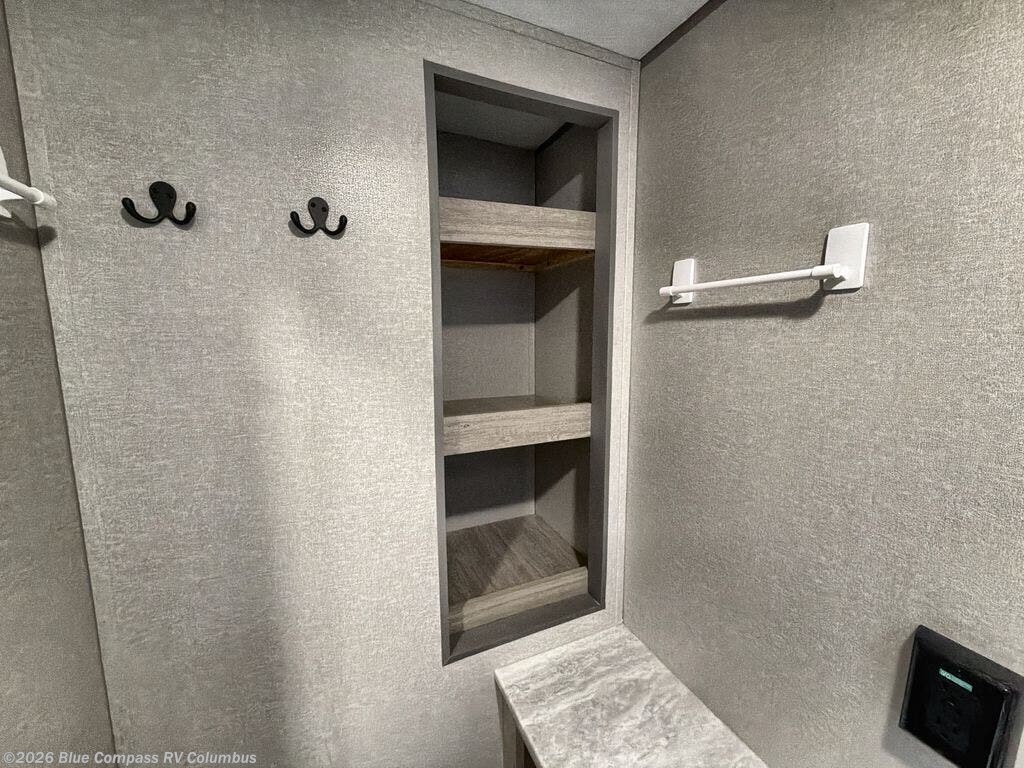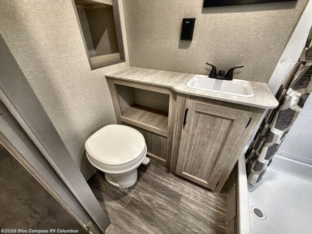 The chef will love cooking in the rear corner kitchen of this travel trailer! You will feel right at home in the front private bedroom with a 60" x 74" RV queen bed with dual bedside wardrobes and an overhead shelf for your personal items. There is a dinette with one bench seat and two chairs just to the left of the entry door for dining, and there is a TV mount above plus overhead cabinets for storage. Opposite, a slide out featuring a 68" theater seat, plus the kitchen appliances. Stay clean and fresh with the rear corner bath including a 36" x 30" shower featuring a skylight above for natural lighting as you get ready each morning. The 10' electric awning has multicolor lights for you to choose your favorite color as you enjoy an evening outside beneath it with family and friends. A nice pass-through storage compartment will hold your camp chairs and outdoor games, plus more.