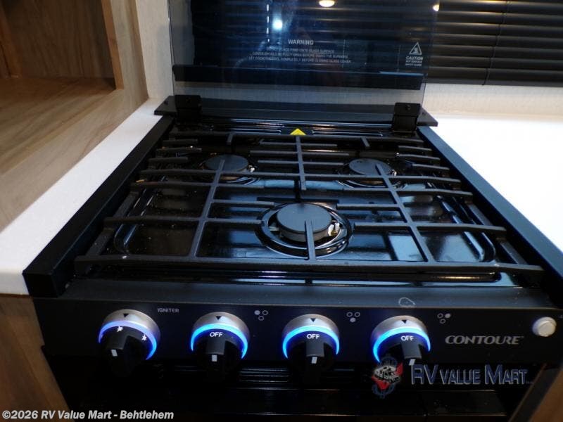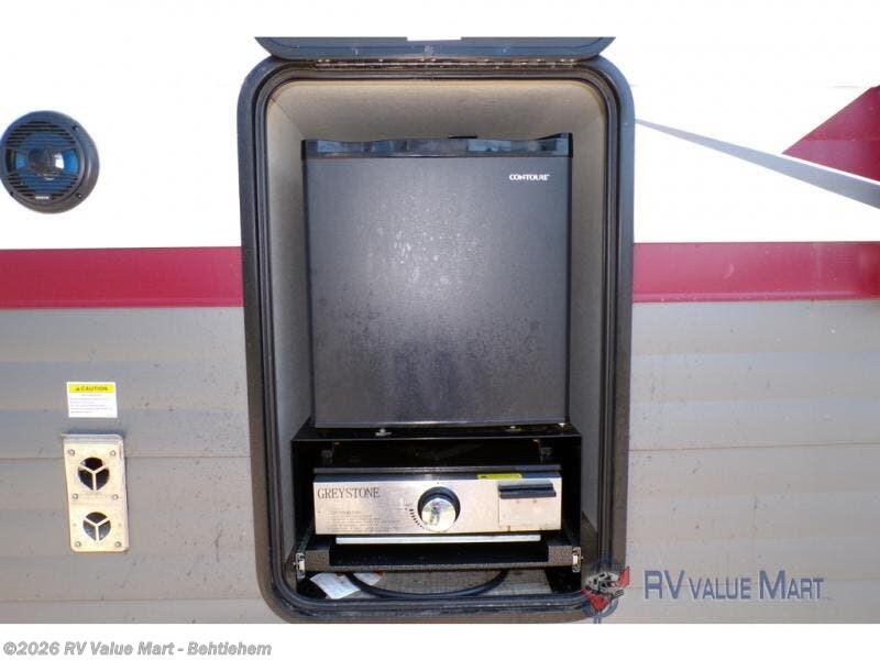 This model resembles the layout of model 23CC, but instead of a full rear bath, you'll enjoy double-size bunks and a full bath in the back of this unit. You will appreciate the extra deep storage under the bunks for your guests' belongings, and there is more storage found throughout for camp necessities. The chef will have their choice to cook at the outside kitchen or stay warm inside by the fireplace. After dinner, everyone can gather around the U-shaped dinette for game night, and the hidden shelves behind the entertainment center will be perfect for books, movies, or snacks! Having your own bedroom with a camp king bed will have you feeling right at home, and you can even bring a television along since there is a TV mount here!