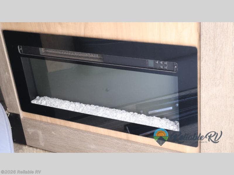 If you're looking for more interior space, this unit with a large slide out is sure to meet your needs! There is an extra thick cascade edge sofa and a booth dinette within the slide out plus panoramic windows for wide open outdoor views. The entertainment center with a fireplace will have your space feeling more like home, and the hidden shelves here can hold board games, movies, or books! After a day of exploring, you can clean up in the full rear bath that includes a shower skylight, then head to bed on the camp king bed in the front private bedroom. This model also includes an inside kitchen and an outside kitchen so you can choose where you want to cook each day!