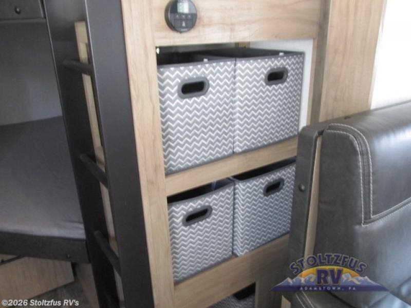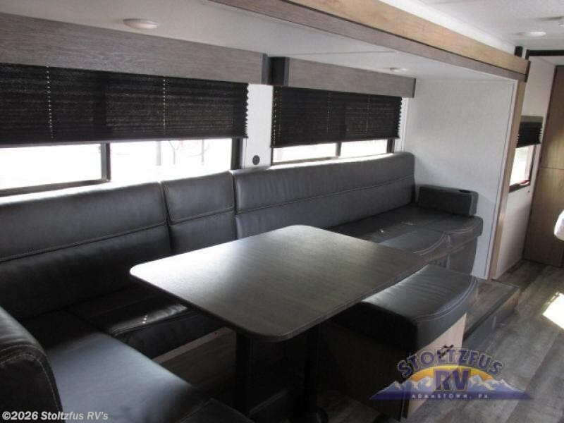 Camping with friends and family just got easier in this travel trailer that can sleep nine each night! The kids or your guest will love the double-size bunks with extra deep storage for their things, while you take the front private bedroom with a camp king bed. There is also a booth dinette and an extra thick cascade edge sofa for more sleeping and seating space. Panoramic windows give you wonderful views of your surroundings, and the fireplace inside will make your space feel more like home. There is an entertainment center with hidden shelves to store movies or books, plus a pantry for snacks galore. This model also includes a full bath with one of the dual entry doors for added convenience!
