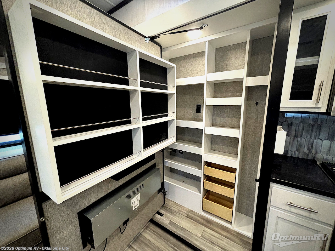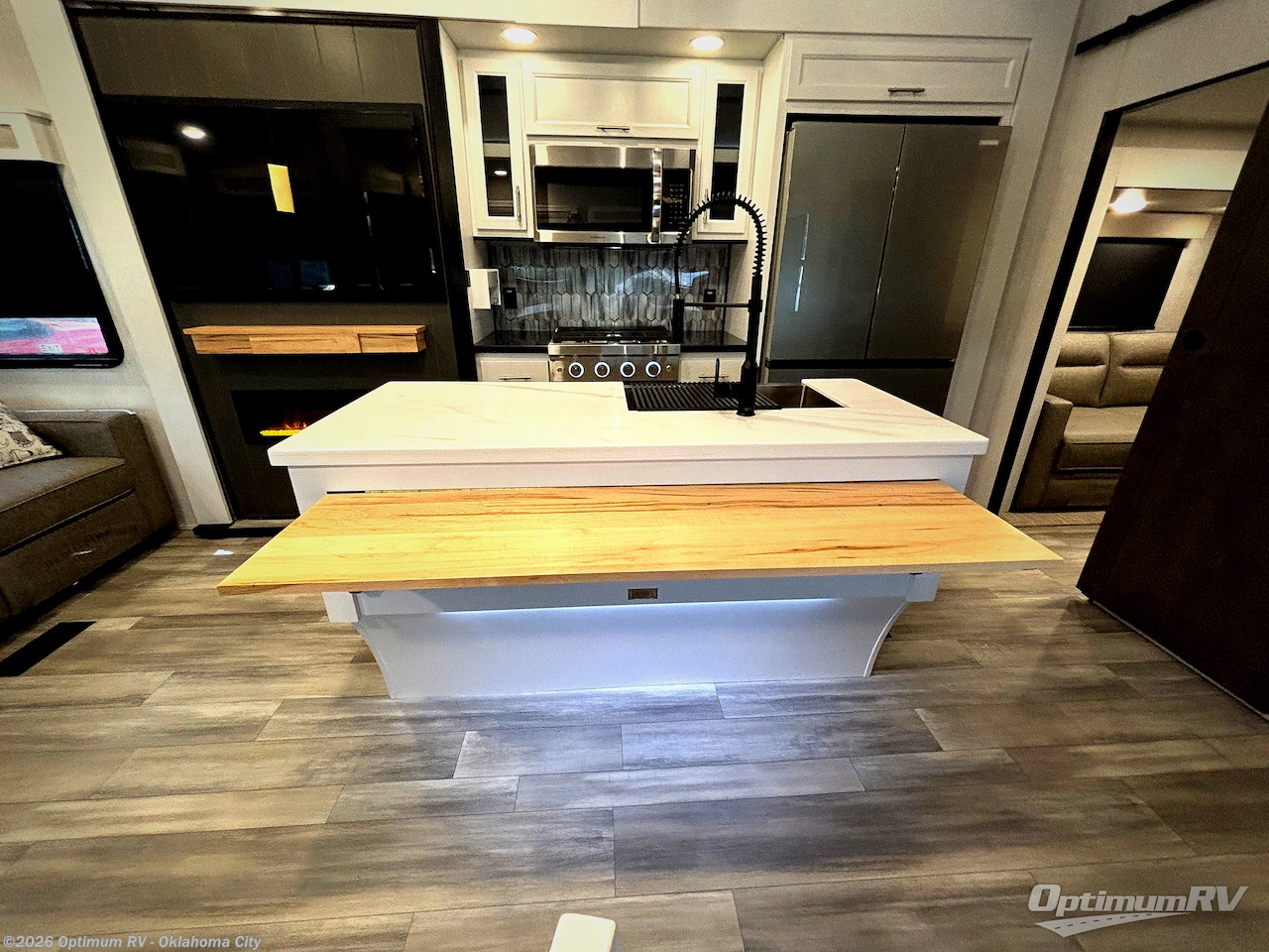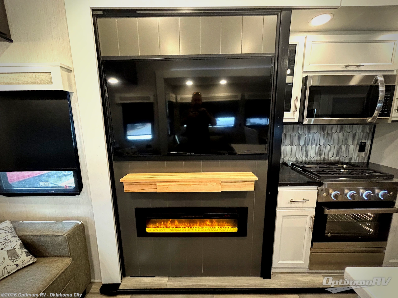 With two bedrooms in this fifth wheel, the whole family can camp together! The front private bedroom has a king bed slide to lay your head at night, a dresser with a TV, and a front wardrobe with storage shelves to keep your clothes looking nice. The second bedroom has a loft above a tri-fold sofa slide that is across from the TV and wardrobe, and you could even switch out the sofa for an optional 73" desk to get some work done while you are away. Everyone can freshen up in the full bathroom with a shower with a seat and their bellies full with a kitchen island and 20 cu. ft. 12V refrigerator . After a day in the sun, head to the rear living area and relax on either the hide-a-bed sofa or the power theater seating across from the fireplace and swivel mounted TV. You will also love the hidden Murphy pantry behind the TV for smart storage solutions!