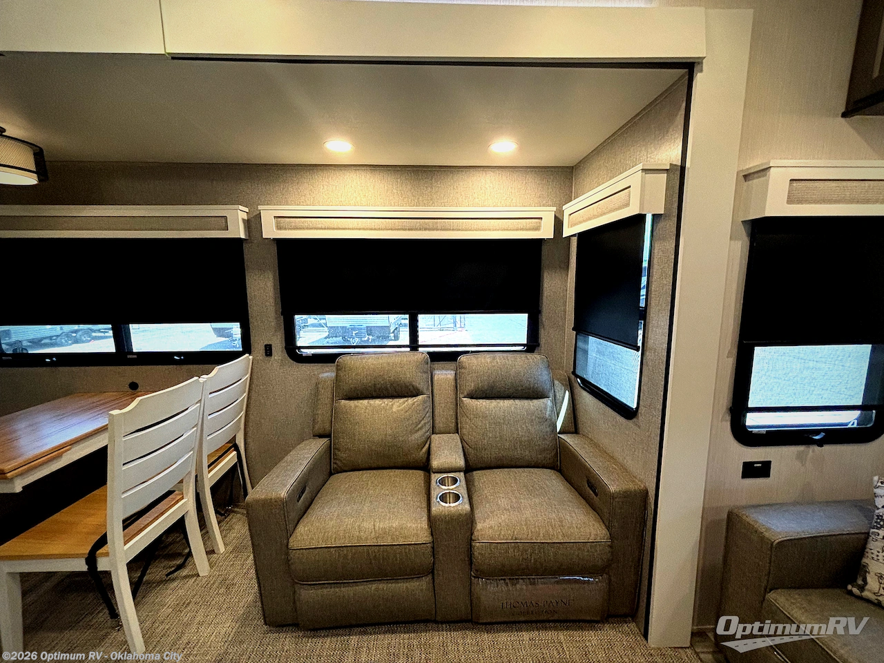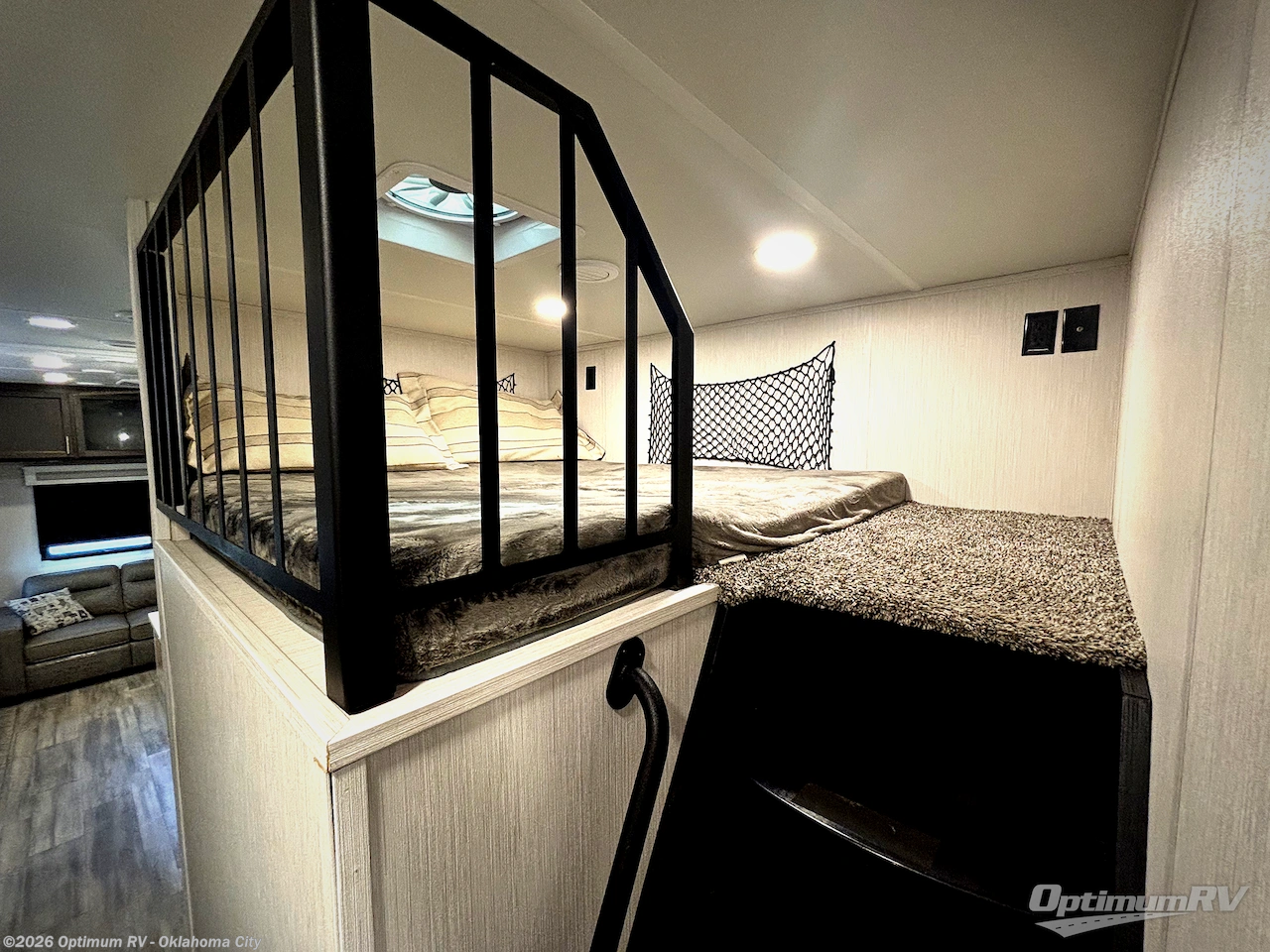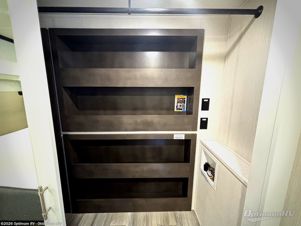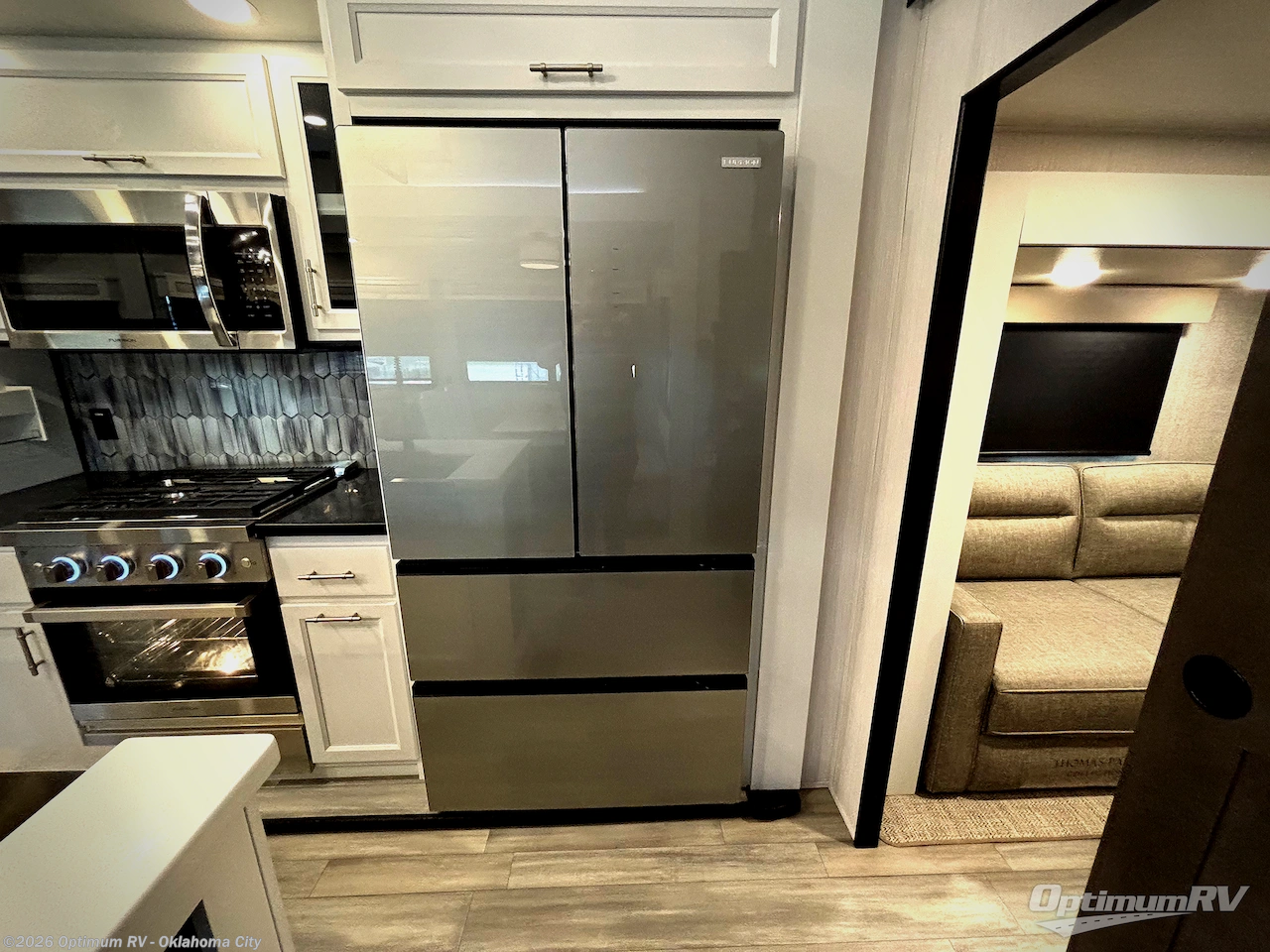 With two bedrooms in this fifth wheel, the whole family can camp together! The front private bedroom has a king bed slide to lay your head at night, a dresser with a TV, and a front wardrobe with storage shelves to keep your clothes looking nice. The second bedroom has a loft above a tri-fold sofa slide that is across from the TV and wardrobe, and you could even switch out the sofa for an optional 73" desk to get some work done while you are away. Everyone can freshen up in the full bathroom with a shower with a seat and their bellies full with a kitchen island and 20 cu. ft. 12V refrigerator . After a day in the sun, head to the rear living area and relax on either the hide-a-bed sofa or the power theater seating across from the fireplace and swivel mounted TV. You will also love the hidden Murphy pantry behind the TV for smart storage solutions!