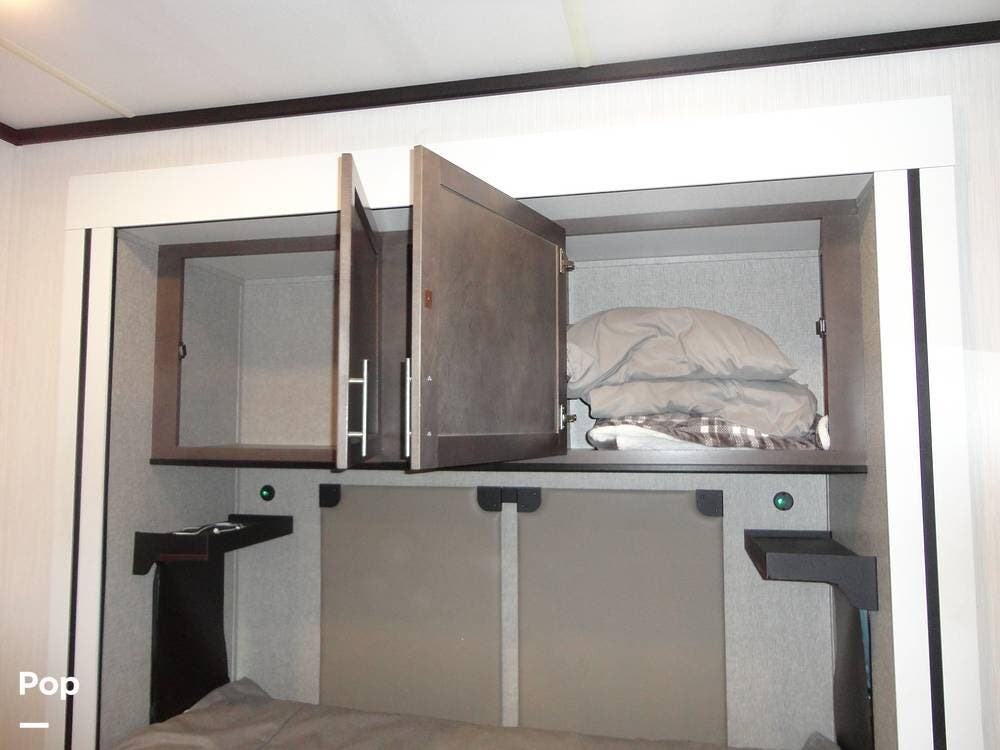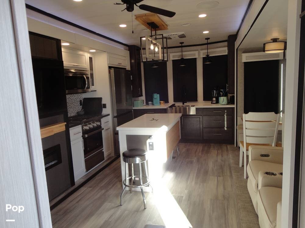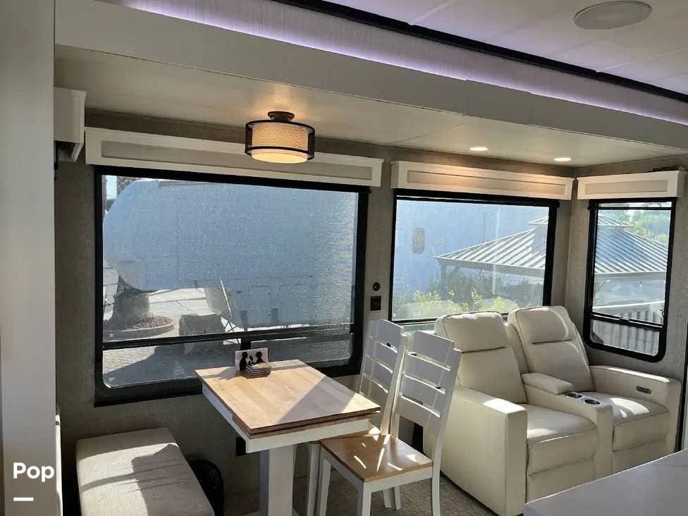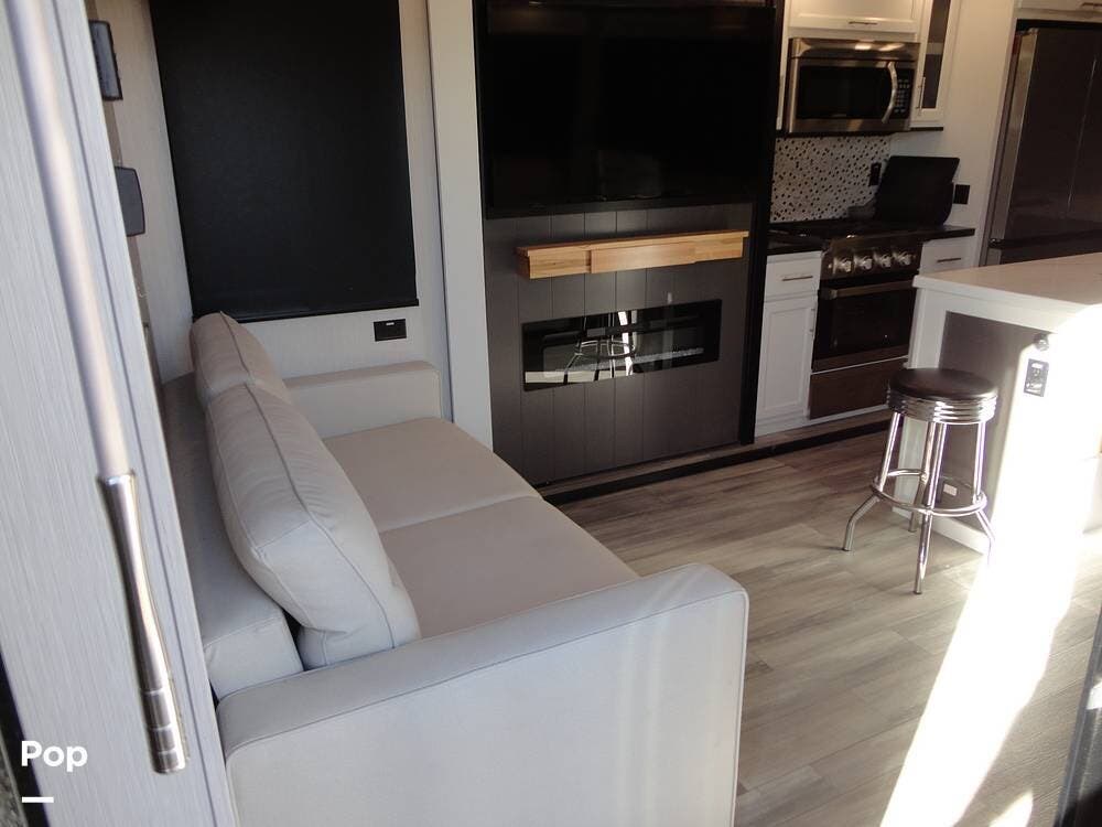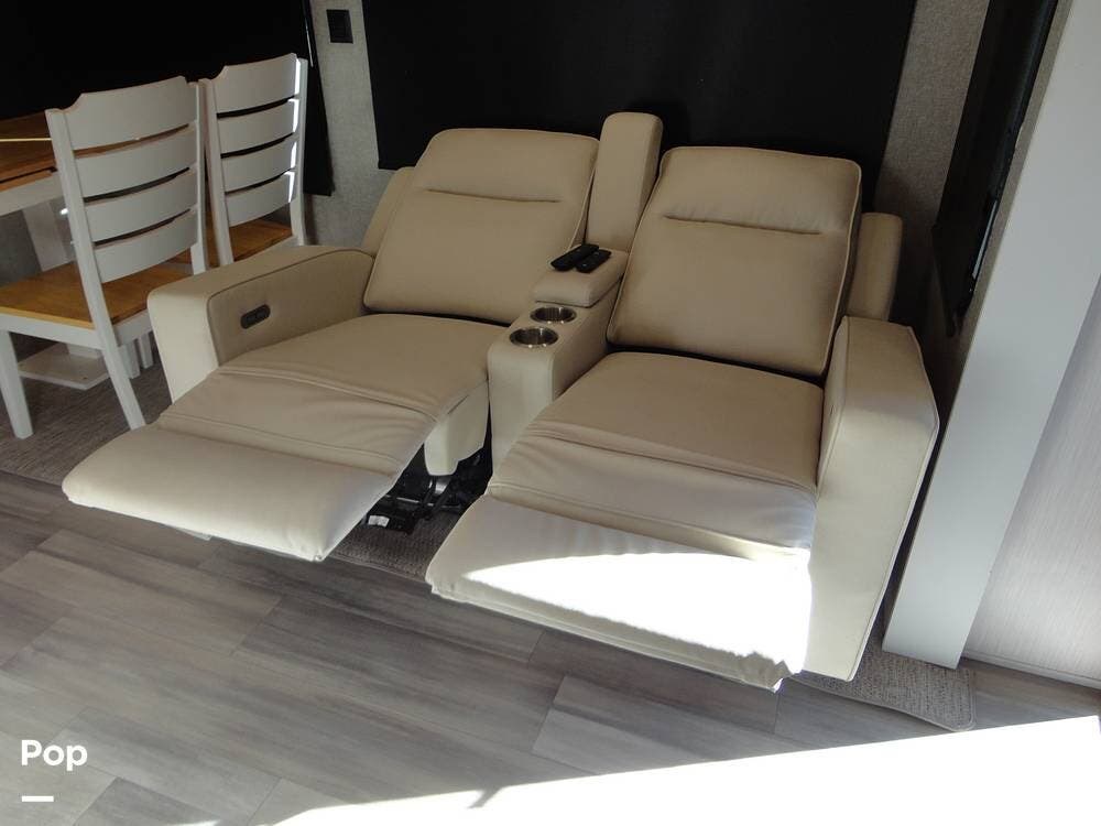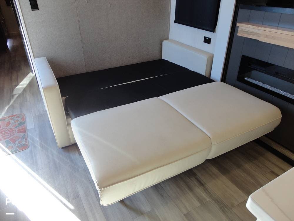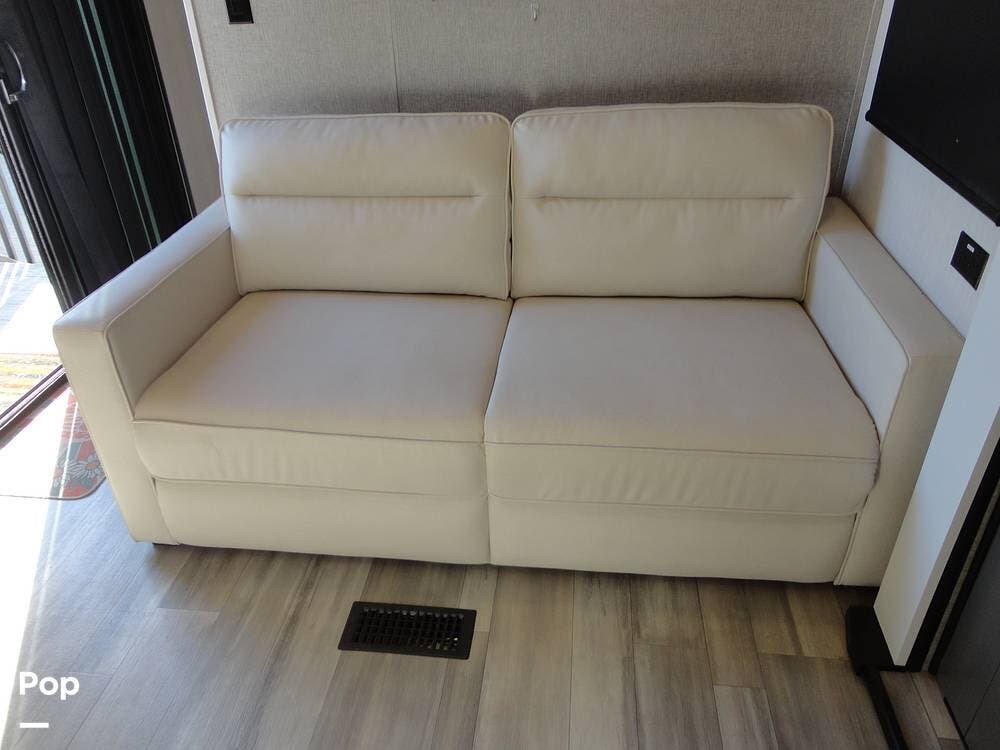 Seating consists a twin theater-style recliners and a sofa that also converts to a sleeper. Comfort is key with this 2024 Cottage, as the seller has added Micro Air upgrade that lets you control the interior temperature from your your phone. Turn on the heat or the air conditioning from anywhere.