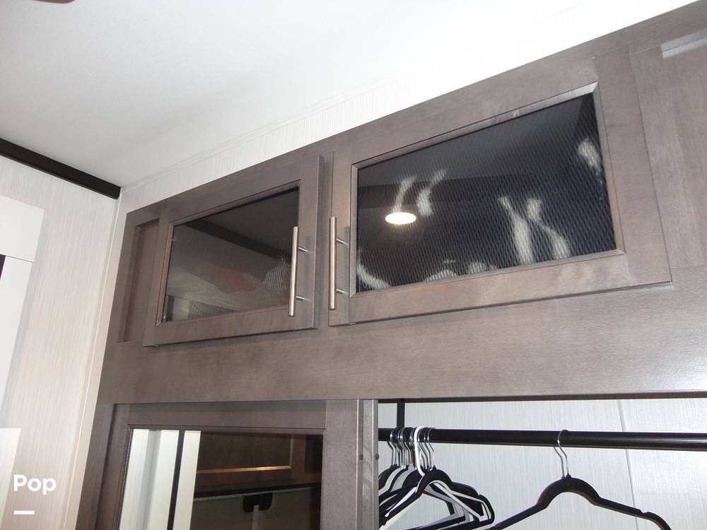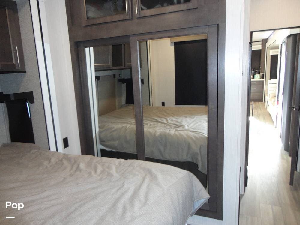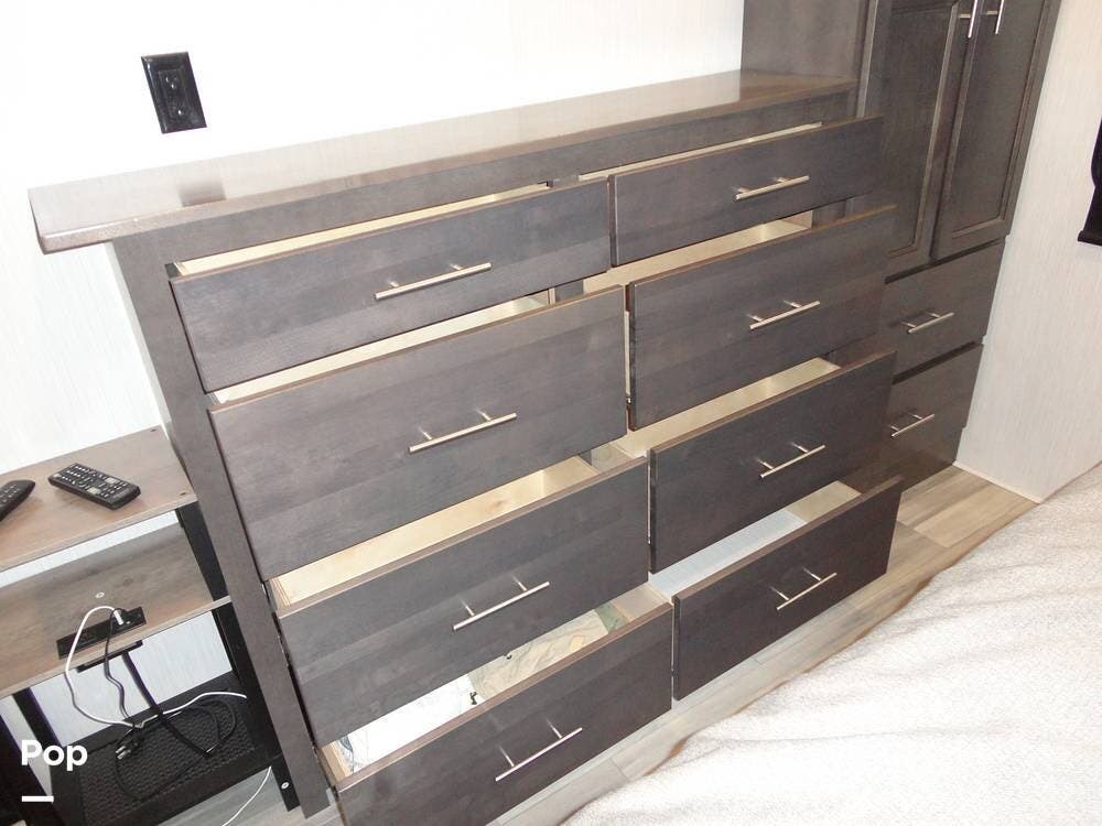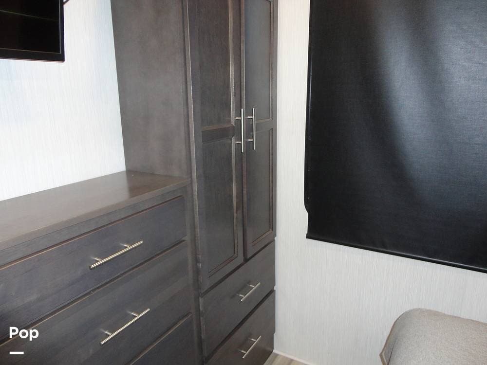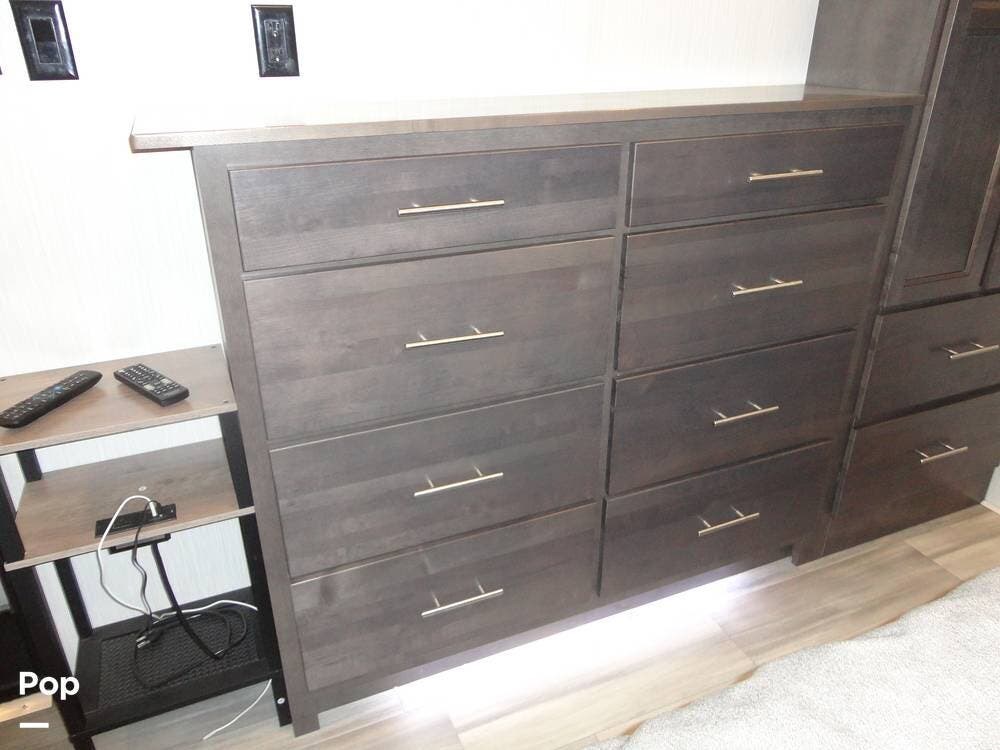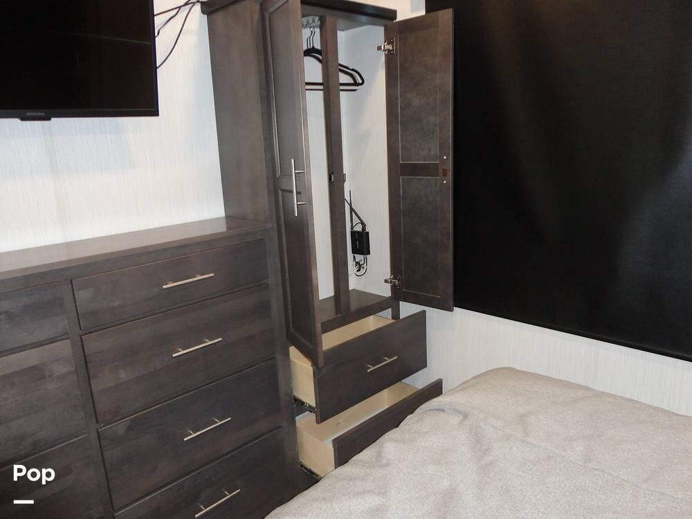 The rear portion of this 2024 Cedar Creek Cottage 40CFK2 houses the master bedroom. There's a king bed with loads of under-bed storage, a TV, overhead cabinets, a seven-drawer dresser, and a wardrobe closet. The bedroom also has an auxiliary wall heater to take the chill off on those colder mornings.