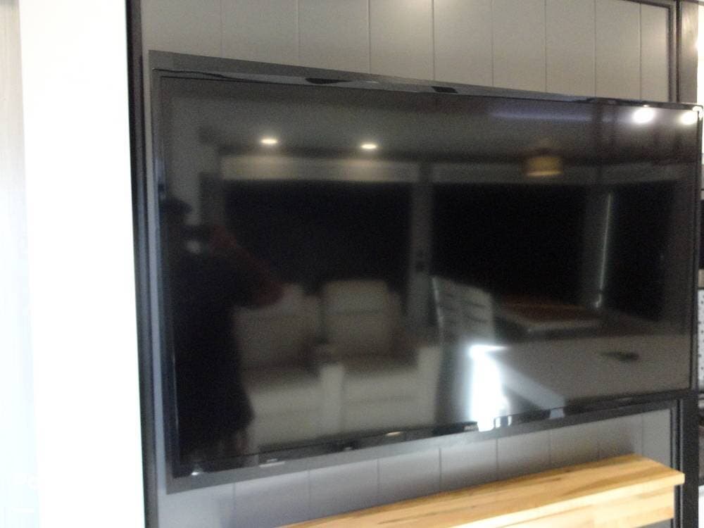 The living area is equipped with residential features, including a table, two chairs, and a bench seat. There is an entertainment center that houses a large screen TV and an electric fireplace. Hidden behind that entertainment center/fireplace wall is a "Murphy" style massive pantry closet.