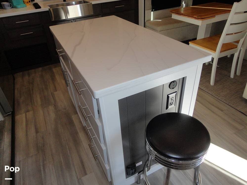 The Cottage's kitchen features an island with an expandable dining bar, a pair of stools, and a spacious hard-surface counter for food prep or serving. A full array of residential appliances includes a stove/oven, microwave, a 12V four-door refrigerator/freezer with ice maker, and a large farmhouse-style kitchen sink.