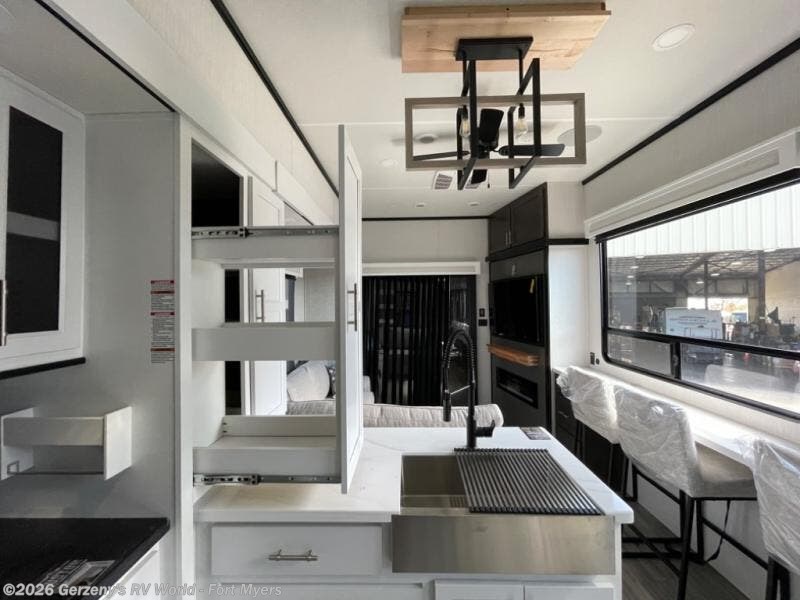 If you need more sleeping or storage space, this destination trailer is the one for you! There is a front covered porch with sliding glass doors that enters in to the front living area. Here, you'll enjoy relaxing on the sectional hide-a-bed sofa across from the entertainment center and fireplace. The spacious bar top with two seats will provide a place to dine, and the middle kitchen is any chef's dream with its two pantries, spacious 20 cu. ft. 12V refrigerator, and plenty of counter space! When you're ready for your own space, you can retreat to the rear bedroom where you'll find a king bed slide out, a wardrobe, a dresser, drawers, and even washer and dryer prep. The comfort doesn't stop there! There is also a loft above the full bath that includes a ladder and a mattress, so you can use this space for more sleeping or storage space!