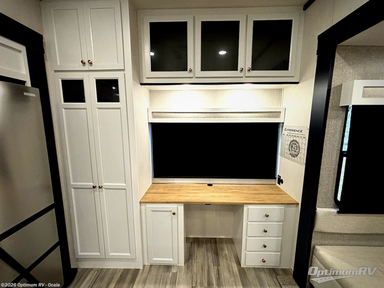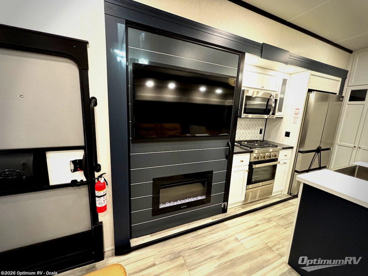 Get ready to work and play in this Cedar Creek Experience fifth wheel! The living area features a desk area with overhead storage so you can set up a dedicated work space and get things done while you're away. Of course you'll spend most of your time relaxing and having fun. The 15' power awning will allow you to set up an exterior space as well, to relax or set up some outdoor yard games. Inside you will love the front bedroom with king bed, the well-equipped kitchen, and the living area with both power theater seats and a hide-a-bed sofa for lounging. Three slide outs give you lots of floor space and a roomy feel for everything you might want to do, like watch a movie on the Smart TV or relax by the fireplace!