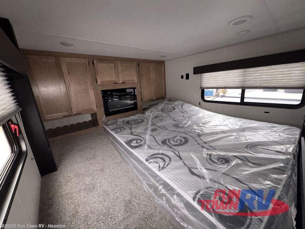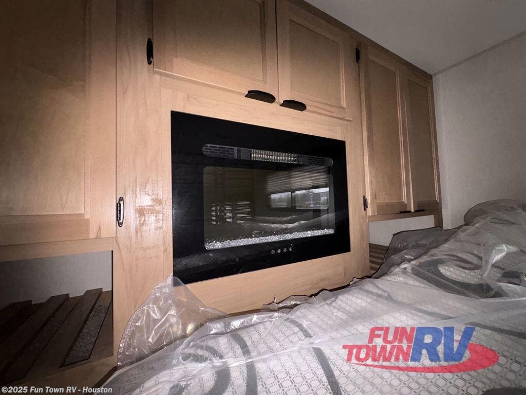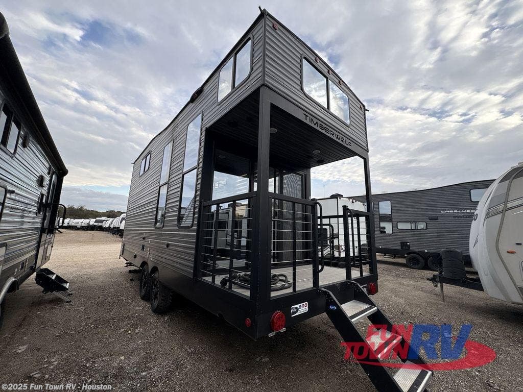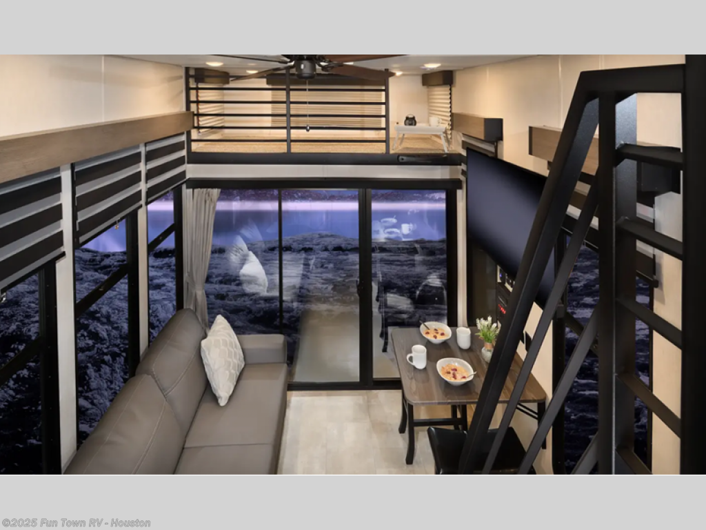 You will fall in love with this mini-loft Timberwolf that will feel more like a tiny home. There are steps leading up to the loft with a queen bed, cabinets, and even a fireplace! The kitchen includes a cooktop and a microwave oven to prepare meals, plus a refrigerator to keep perishables fresh. You'll enjoy relaxing on the 58" sofa, dining at the high top table, or reading a book on the lounge chair. There is also a rear deck with patio doors where you can spend your evenings together, and there is even a second loft above the deck for added sleeping or storage space!