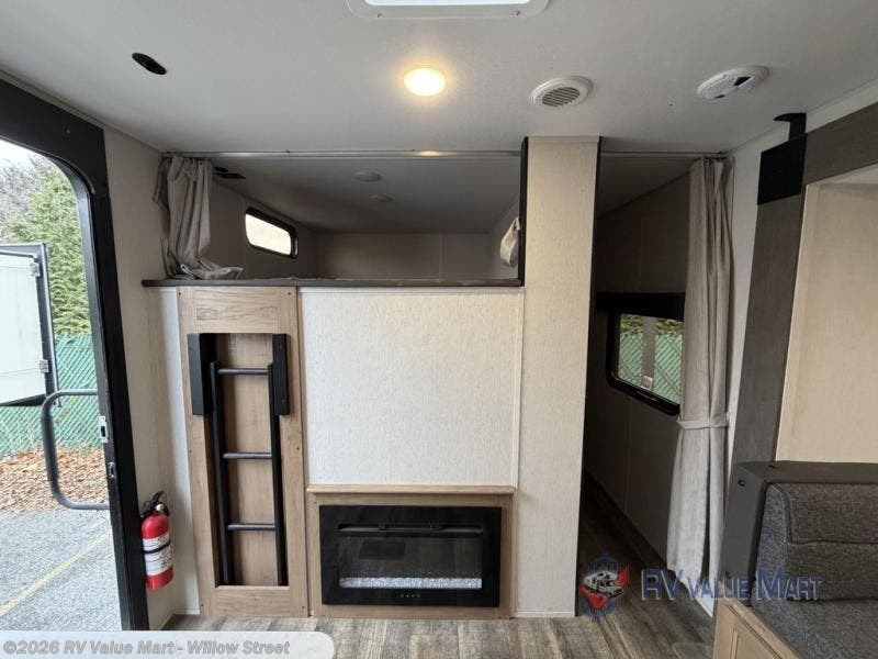 Escape your ordinary life with this innovative travel trailer! It features 64" top bunk bed above a 36" bottom bunk with wardrobes on either side of them, plus there is a wall at the foot of the beds with a fireplace on the other side. You will have your own privacy with the front private bedroom that has a walk-around queen bed with wardrobes on either side and an entrance into the dual entry bathroom which has a neo-angled shower to freshen up in each morning. The sofa and U-shaped dinette can also transform into extra sleeping spaces when you aren't using them to enjoy a meal or relax in front of the TV mount. The outdoor bar and grill comes with a 5.6 cu. ft. outdoor refrigerator and everything you need to prepare delicious meals outdoors. You even have a rear storage rack and outside storage areas to store your outdoor gear!