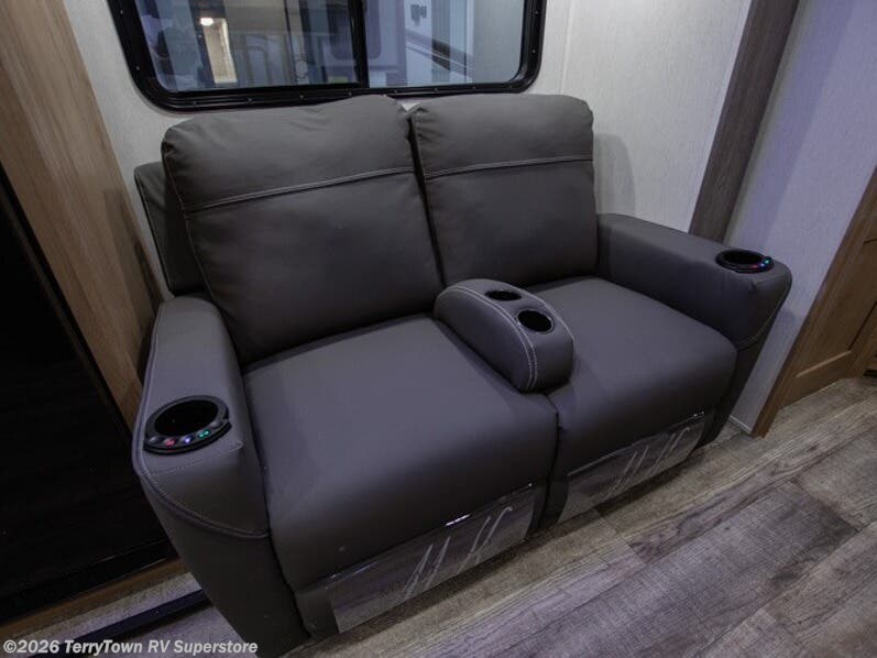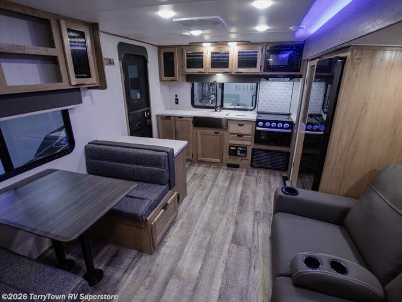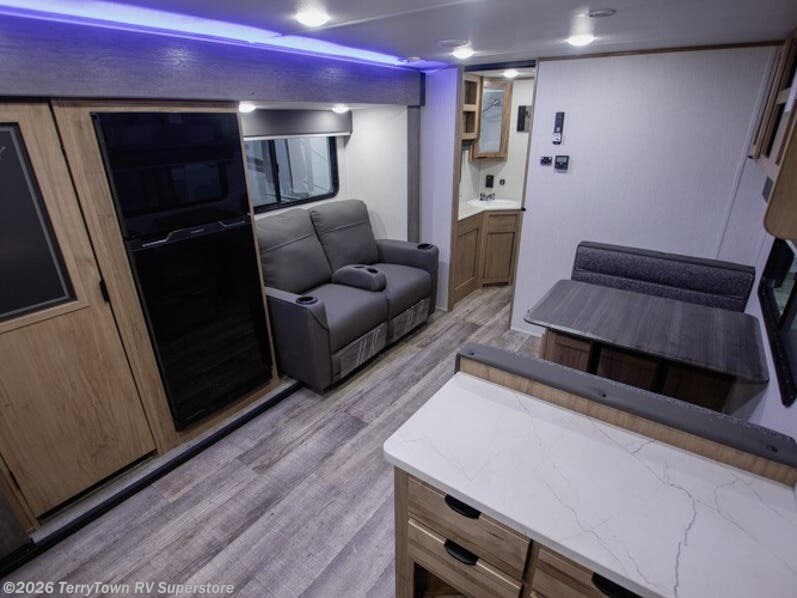 You and your spouse will have a comfortable time camping in this travel trailer! The front private bedroom has a queen bed with wardrobes on either side of it, plus one of the dual entry doors to the unit. As you leave the bedroom, you will enter the walk-through bathroom which has a shower with a skylight above and a removable clothes hanging rod to dry off your swimsuit after swimming in the lake. The chef can prepare their best home cooked meals in the rear kitchen and you can enjoy them at the booth dinette then store any leftovers in the 12V refrigerator. The theater seating has cupholders so you can enjoy a beverage while you read your favorite book!