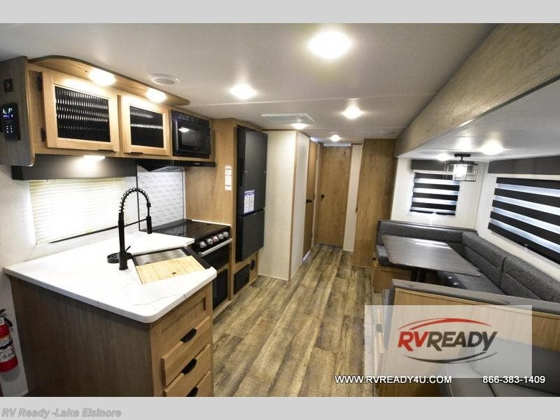 Looking for a spacious travel trailer to sleep nine or ten happy campers? You've found it in this Cherokee Alpha Wolf model with a handy outside kitchen, a bunkhouse with dinette, a front private bedroom, and a large slide out! The main living and kitchen area has a U-shaped dinette to utilize as a dining table, game table, work station, and/or an extra sleeping space. There is also a jackknife sofa for seating, TV watching, or sleeping. From any seating area you can easily view the entertainment center and fireplace which is centered in the unit with doors on either side to the front private bedroom. You will also find a nice pantry and full kitchen amenities including a farm-style sink, and residential refrigerator allowing you to easily create meals for your hungry crew. The exterior provides a 20' awning for an outdoor living area over the outside kitchen, and there is ample exterior storage for all of your camping gear like camp chairs, outside games, rugs, and more.