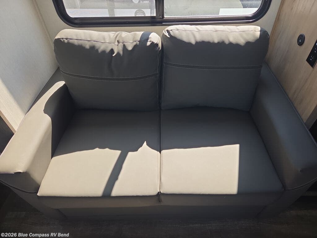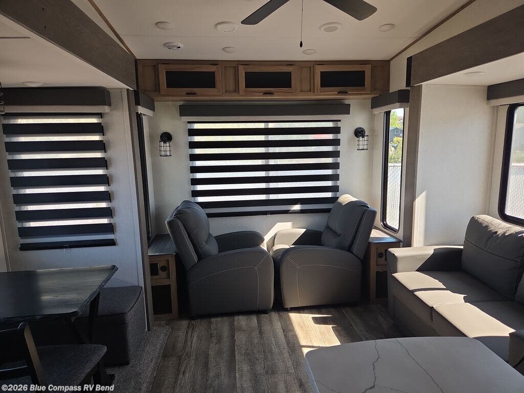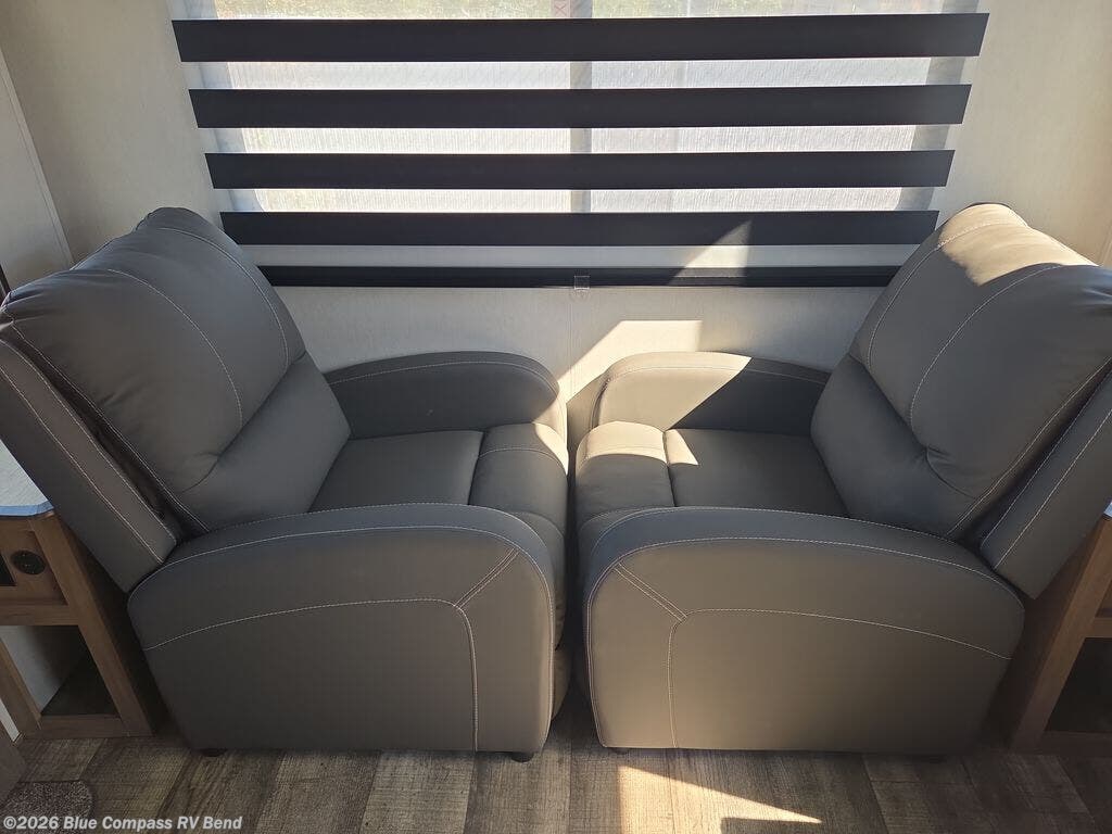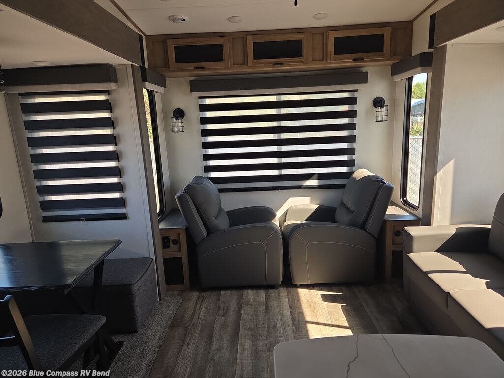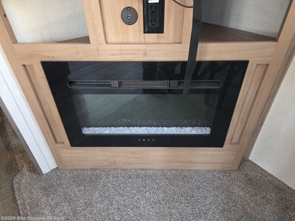 This fifth wheel is perfect for couple's but also has enough space for company too! The rear living area features two recliners with end tables on either side to set your cup of coffee, a tri-fold sofa that can transform into an extra sleeping space, and free standing table with chairs and storage ottoman seat to enjoy your meals by the electric fireplace. The fully equipped kitchen has everything you need including a convenient wine rack. After a fun-filled day at the beach, rinse off in the full bathroom with the shower and hang your swimsuit up to dry on the removable shower rod when you're done. The front private bedroom has a queen bed to lay your head on at night and there is even USB ports on either side to charge your electronics!