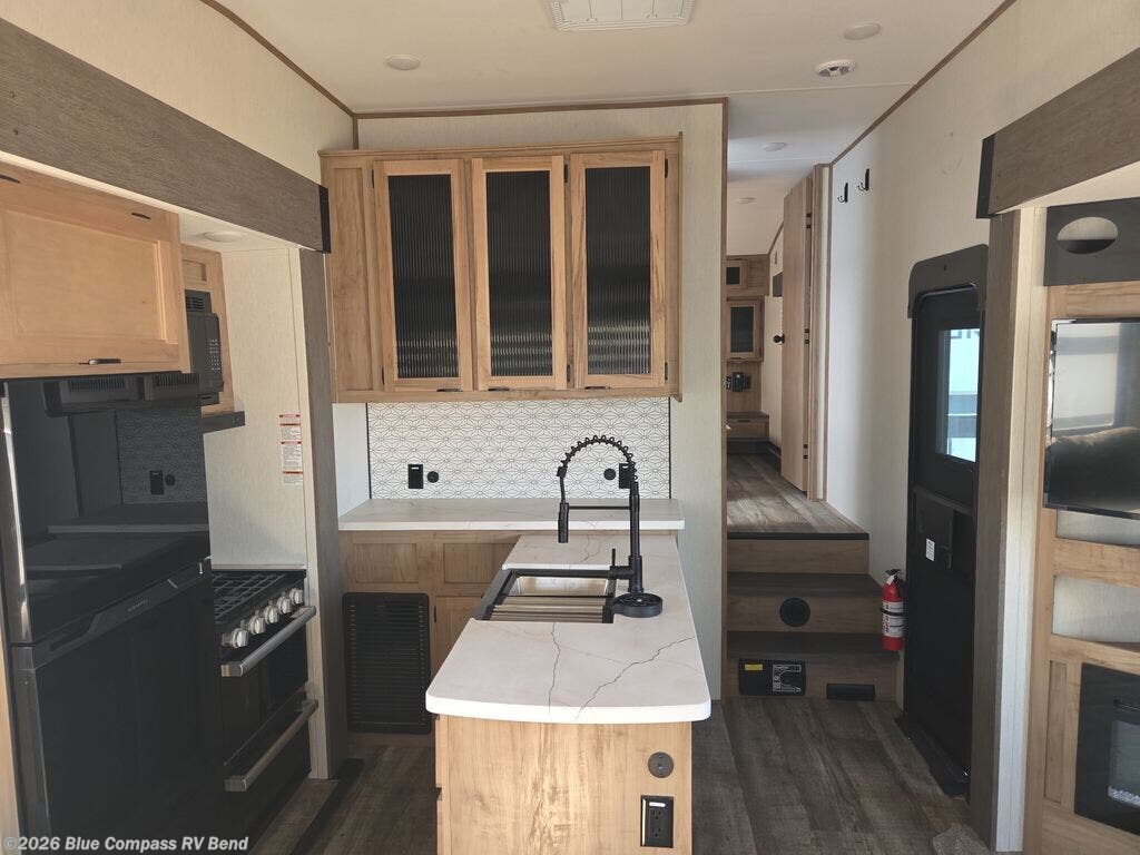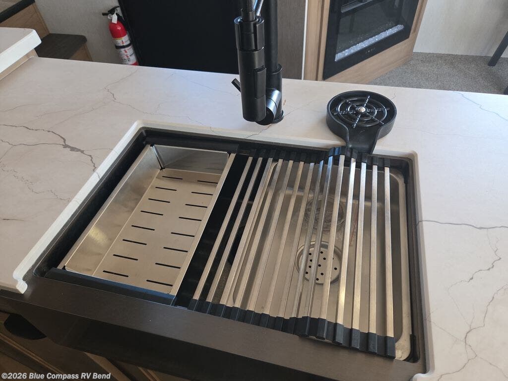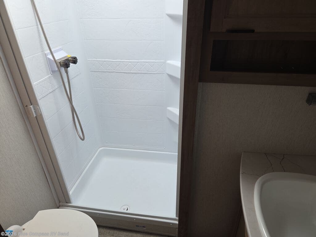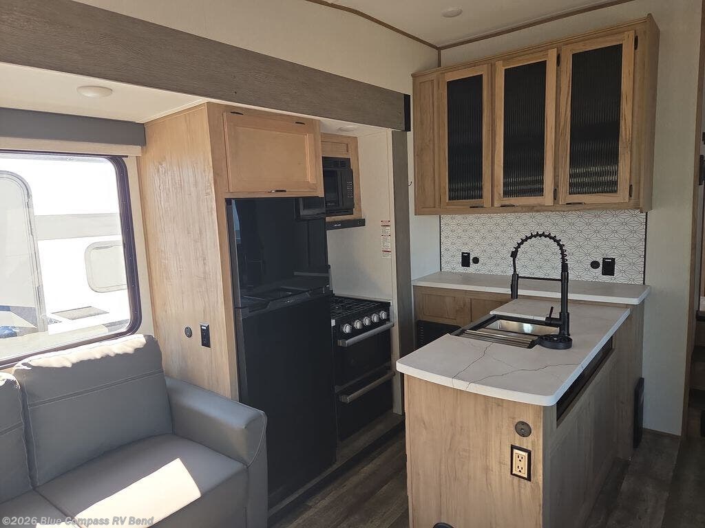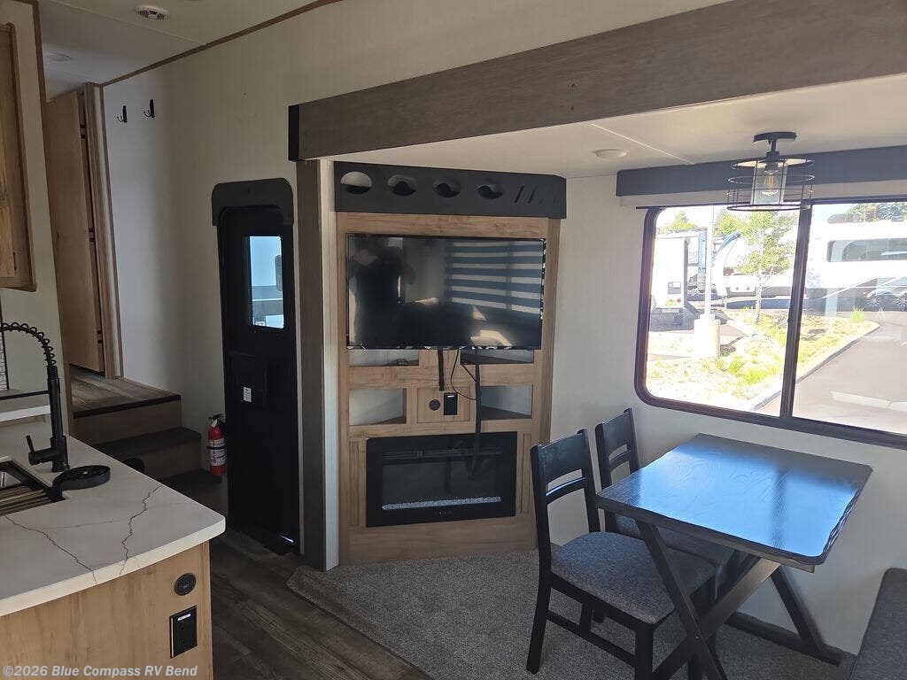 This fifth wheel is perfect for couple's but also has enough space for company too! The rear living area features two recliners with end tables on either side to set your cup of coffee, a tri-fold sofa that can transform into an extra sleeping space, and free standing table with chairs and storage ottoman seat to enjoy your meals by the electric fireplace. The fully equipped kitchen has everything you need including a convenient wine rack. After a fun-filled day at the beach, rinse off in the full bathroom with the shower and hang your swimsuit up to dry on the removable shower rod when you're done. The front private bedroom has a queen bed to lay your head on at night and there is even USB ports on either side to charge your electronics!