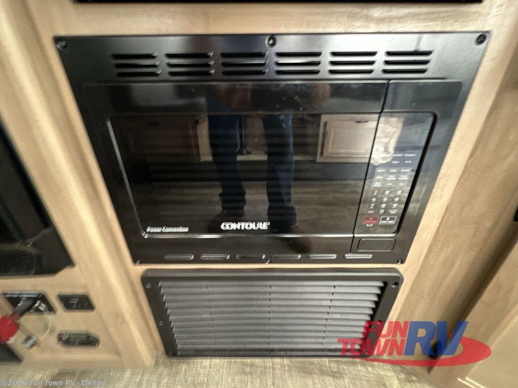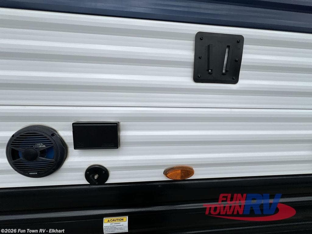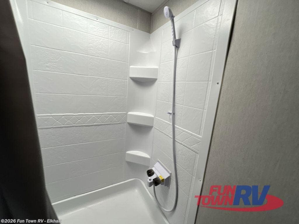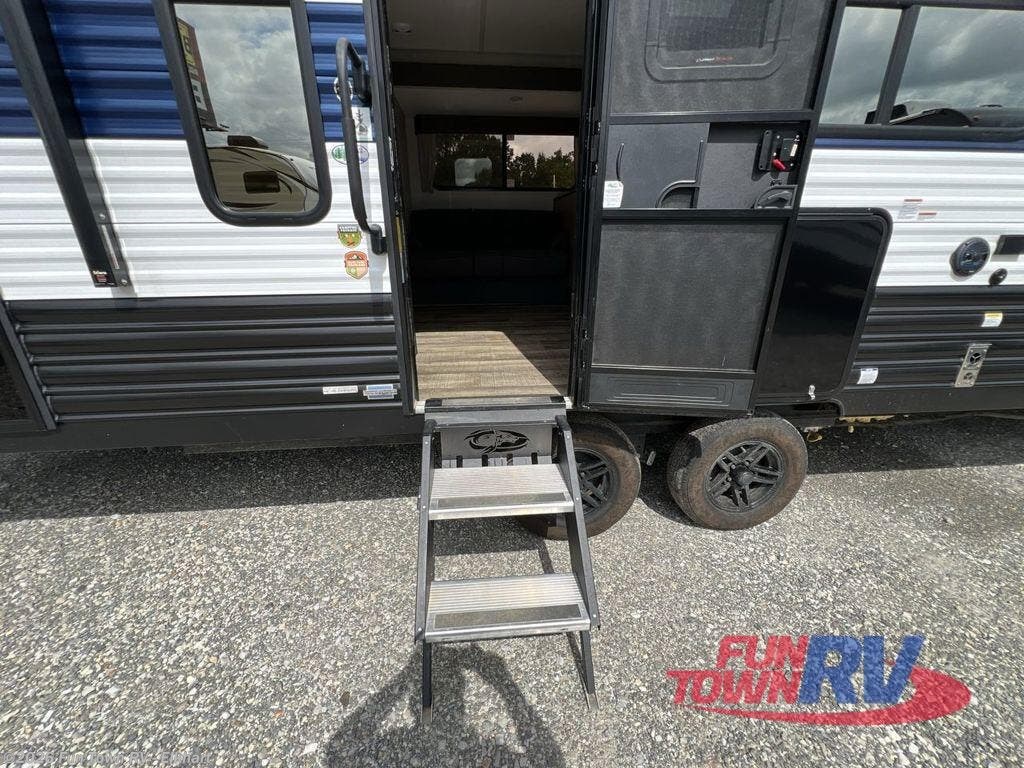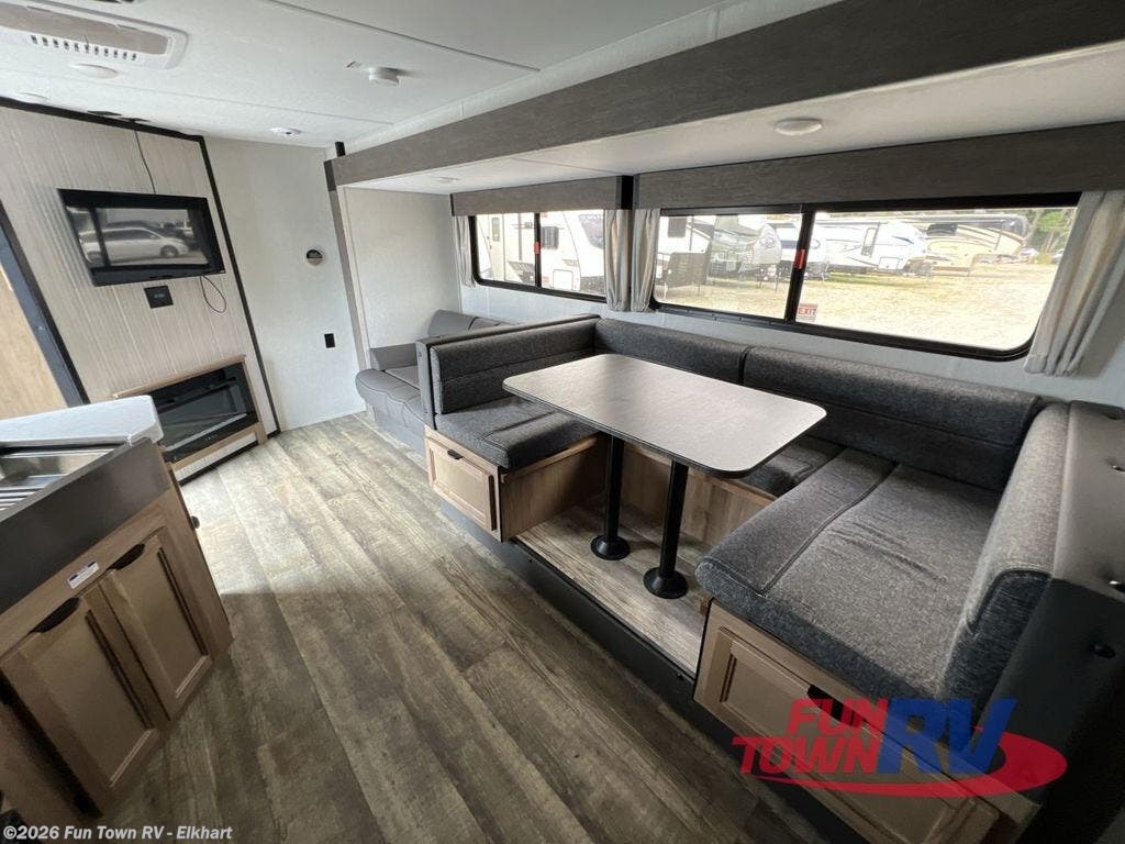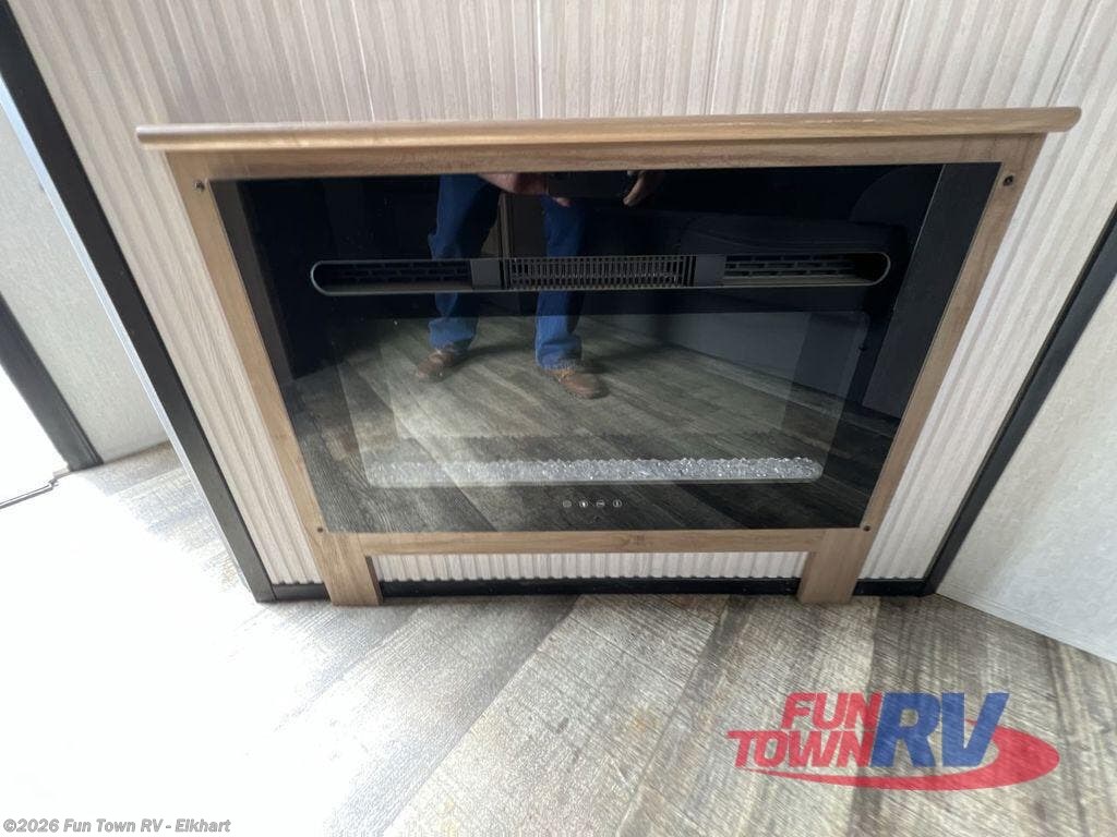 You will love how easy it is to enter/exit this travel trailer with dual entry doors! The rear door leads into the living/kitchen area where you will notice the large U-shaped dinette and the sofa which sit on the slide and create a spacious footprint for moving about, as well as great places to play games and socialize with your friends and family. Plus, there is an entertainment center with a fireplace and a fully equipped kitchen to keep everyone's bellies filled with delicious home cooked meals. At night, there is sleeping space for everyone between the bunks above the sofas with a table in the rear private bunkhouse and the queen-size bed in the front private bedroom, plus the furniture can convert into sleeping spaces. The walk-through bathroom leads directly into the bedroom too!