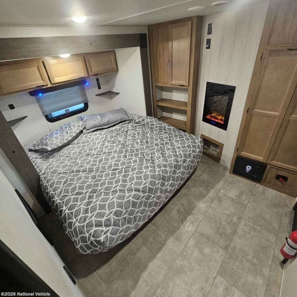The living area is designed for comfort in every season, anchored by two fireplaces that provide warmth and ambiance throughout the coach. An upgraded sofa, zebra blinds, and LED interior lighting create a modern, inviting atmosphere, while the super-sized central A/C ensures comfort even on the hottest days.