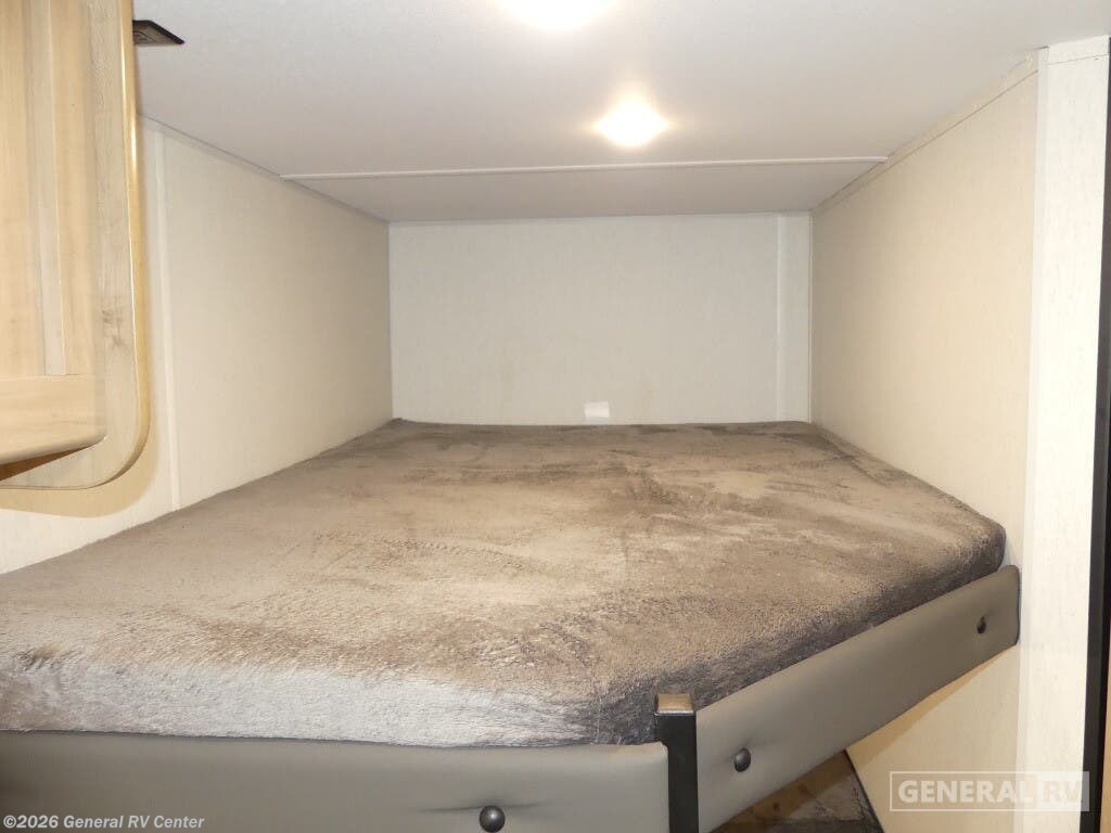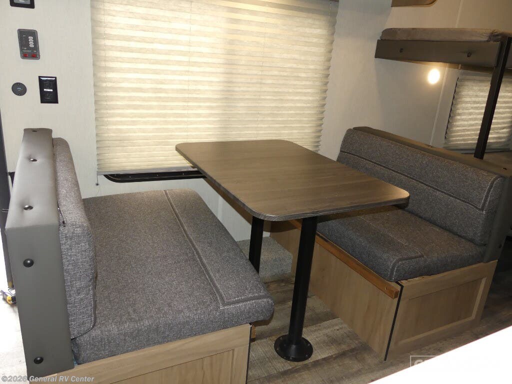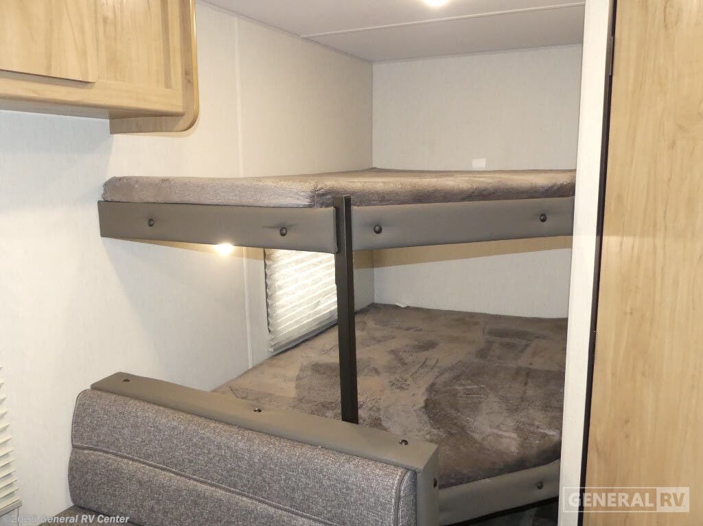 Discover the 2024 Forest River Cherokee Wolf Den 26EV, a marvel of design and functionality that promises to elevate your camping experience. This spacious RV, with a length of just over 29 feet, is perfect for families or groups, offering comfortable sleeping arrangements for up to 10 people. The interior is thoughtfully designed with a center kitchen and living area, complete with a mid-size electric refrigerator and a cozy sofa. The kitchen features a two-burner cooktop, ideal for whipping up meals on the road. The rear of the RV hosts a convenient bunkhouse, perfect for kids or guests, alongside a well-appointed bathroom with a tub/shower combination. The queen bed at the front provides a restful retreat, while the convertible dinette and sofa ensure everyone has a place to sleep. With a 12-foot powered retractable awning, you can enjoy the great outdoors in comfort, rain or shine. The ample storage, including outside compartments, ensures you can bring along all your essentials and more. Experience the open road like never before with the Cherokee Wolf Den 26EV, and for more details or to see it in person, visit your nearest General RV dealership.