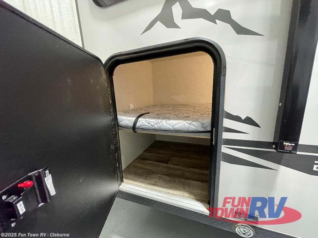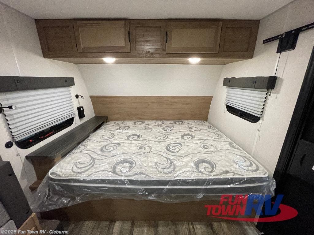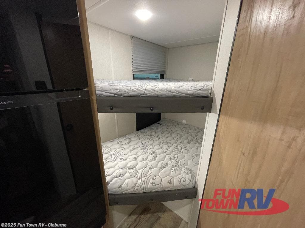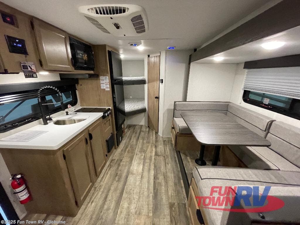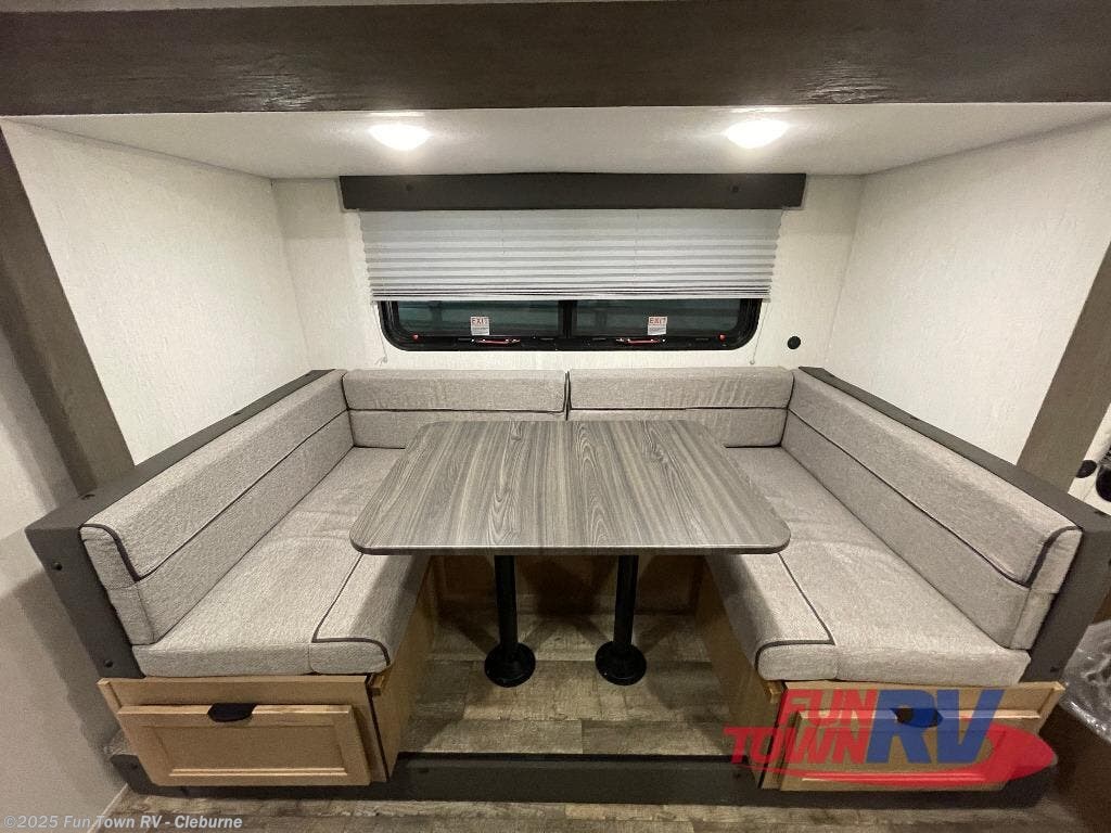 This family travel trailer is ready to head to the campground whenever you are! The kiddos can sleep on the set of double-size bed bunks and you can sleep on the front queen bed, plus the U-shaped dinette slide can also transform into an extra sleeping space when you aren't using it to enjoy a meal. You can prepare your delicious meals on the flushmount range or at the outside mini kitchen and stay protected by the power awning. The exterior not only has outside storage and an outside TV mount, but also features an outside storage plus door for access to the storage space underneath the bottom bunk bed. The rear corner bath allows everyone to stay clean and refreshed while you camp.