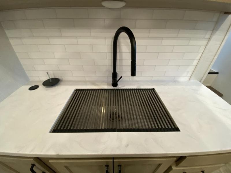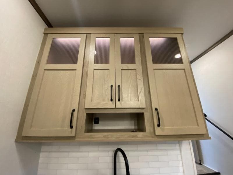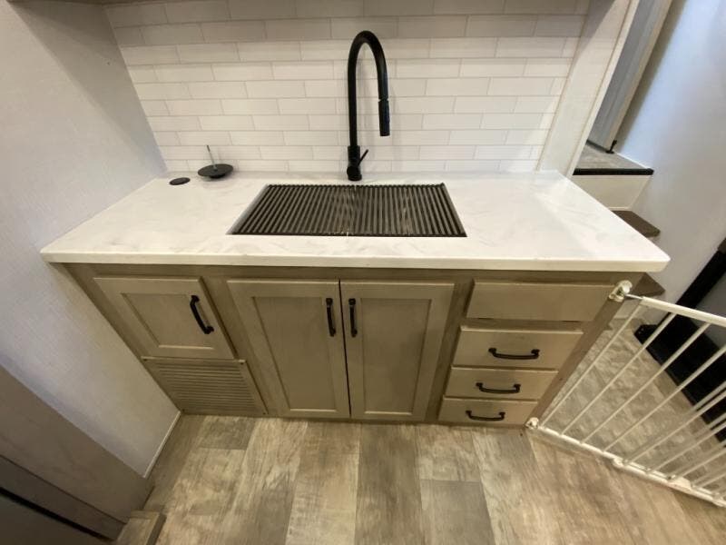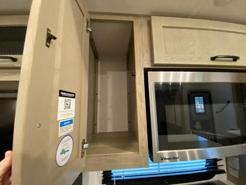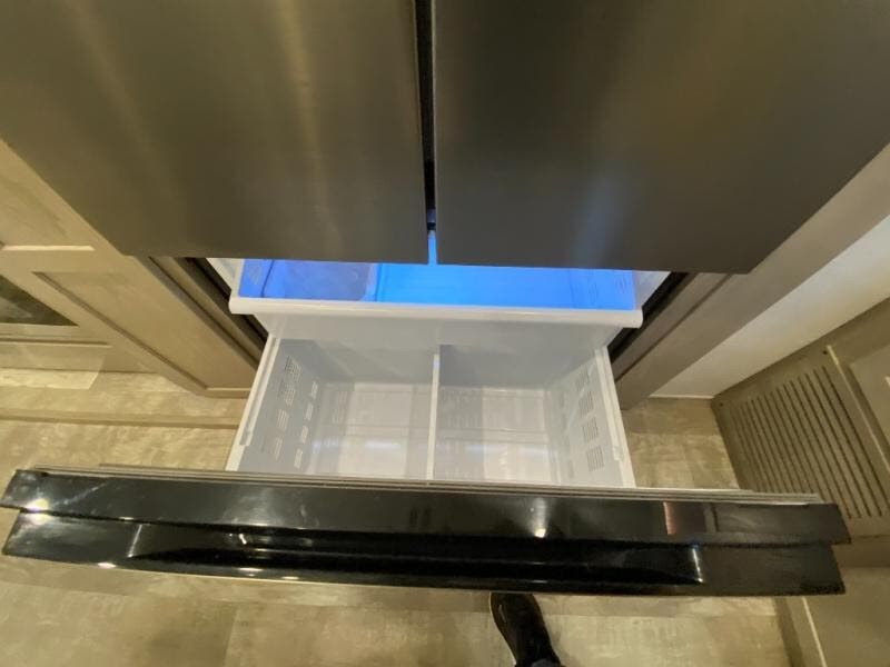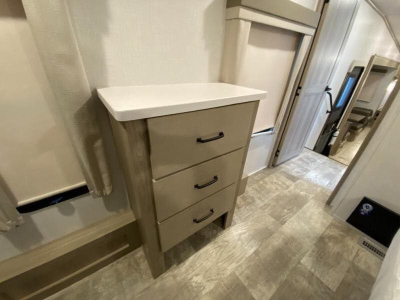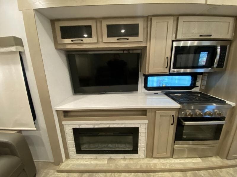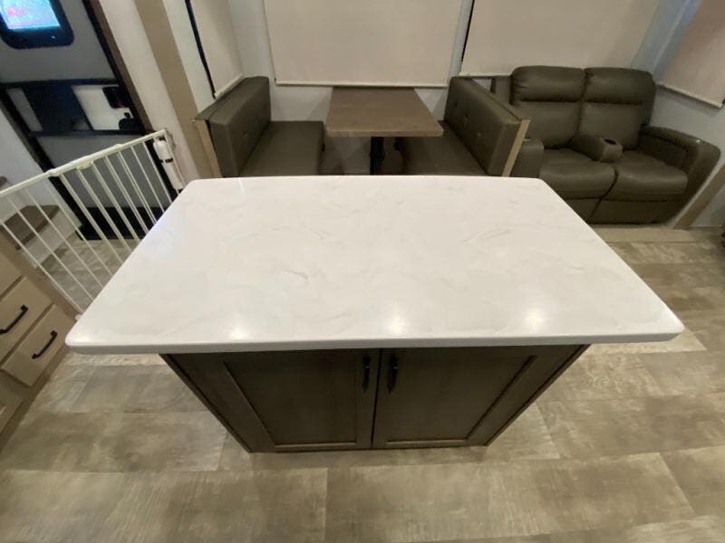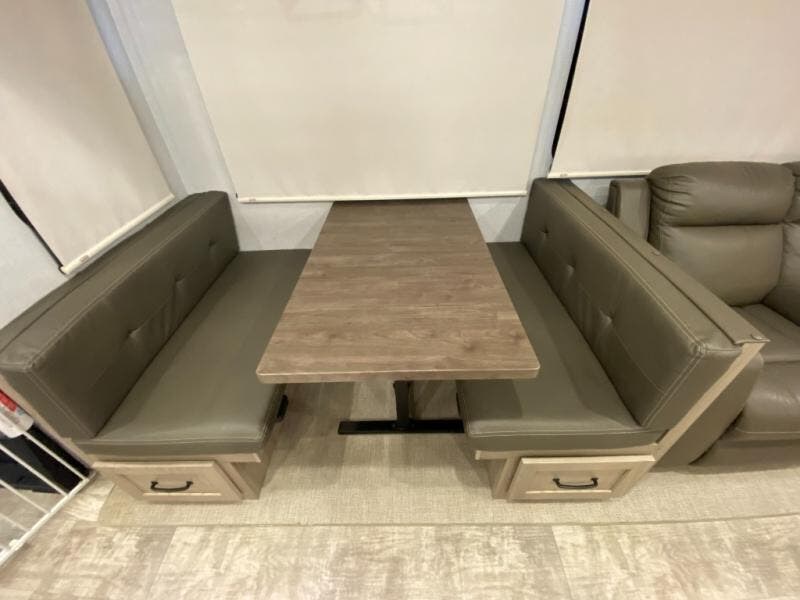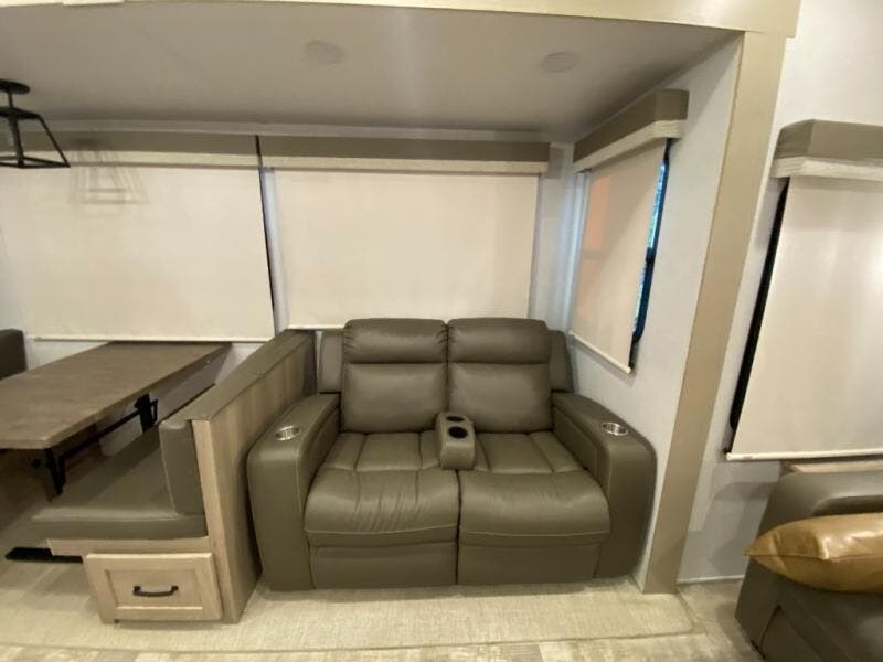 Get ready to enjoy the outdoors while inside with the enormous windows in both the rear and the door side slide of this fifth wheel. The spacious main living area offers dual opposing slides giving you a great place to invite other RVers over to visit, eat, and even play cards. There is seating for nine from the booth dinette, the theater seats, and the rear hide-a-bed sofa. The cook will have a large refrigerator to store lots of drinks and cold food, plus a pantry, and the center island offers extra counter space plus seating. After everyone has left, retire to the front bedroom with a queen bed slide, a shirt closet, a wardrobe with washer/dryer prep, plus more storage and a TV option. You might even like to choose a king bed option as well.