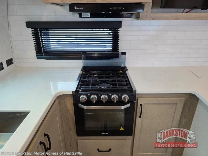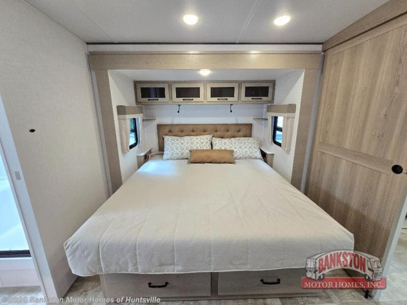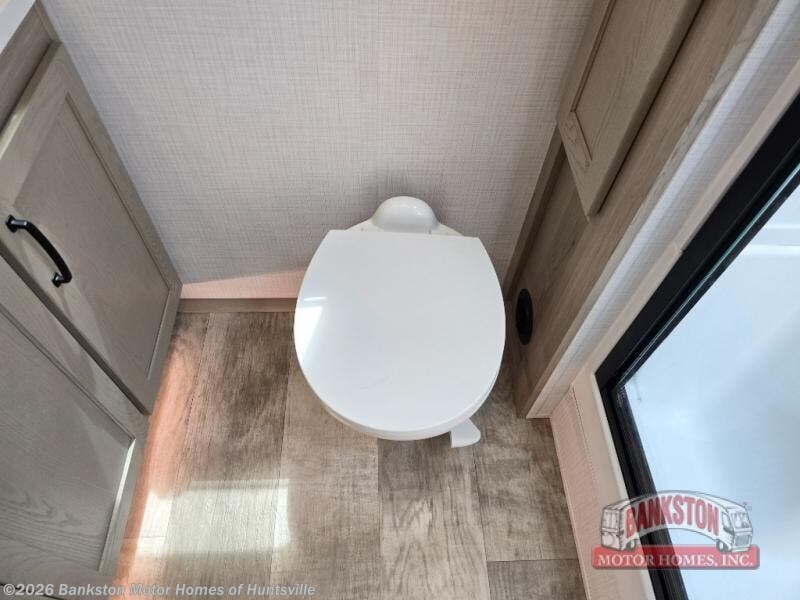 You will love how open this travel trailer will feel with the large front window that you can look out from the two-person bar top seating! The front kitchen has plenty of countertop space for you to prepare your best meals. Your nights will be spent in true relaxation with a 67" theater seating and king bed slide in the bedroom for a great night's rest. The full rear bathroom has a shower with a seat to take a nice, hot shower before bed, and a dual-sink vanity for two to get ready at once in the mornings!