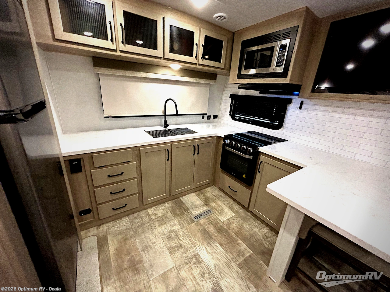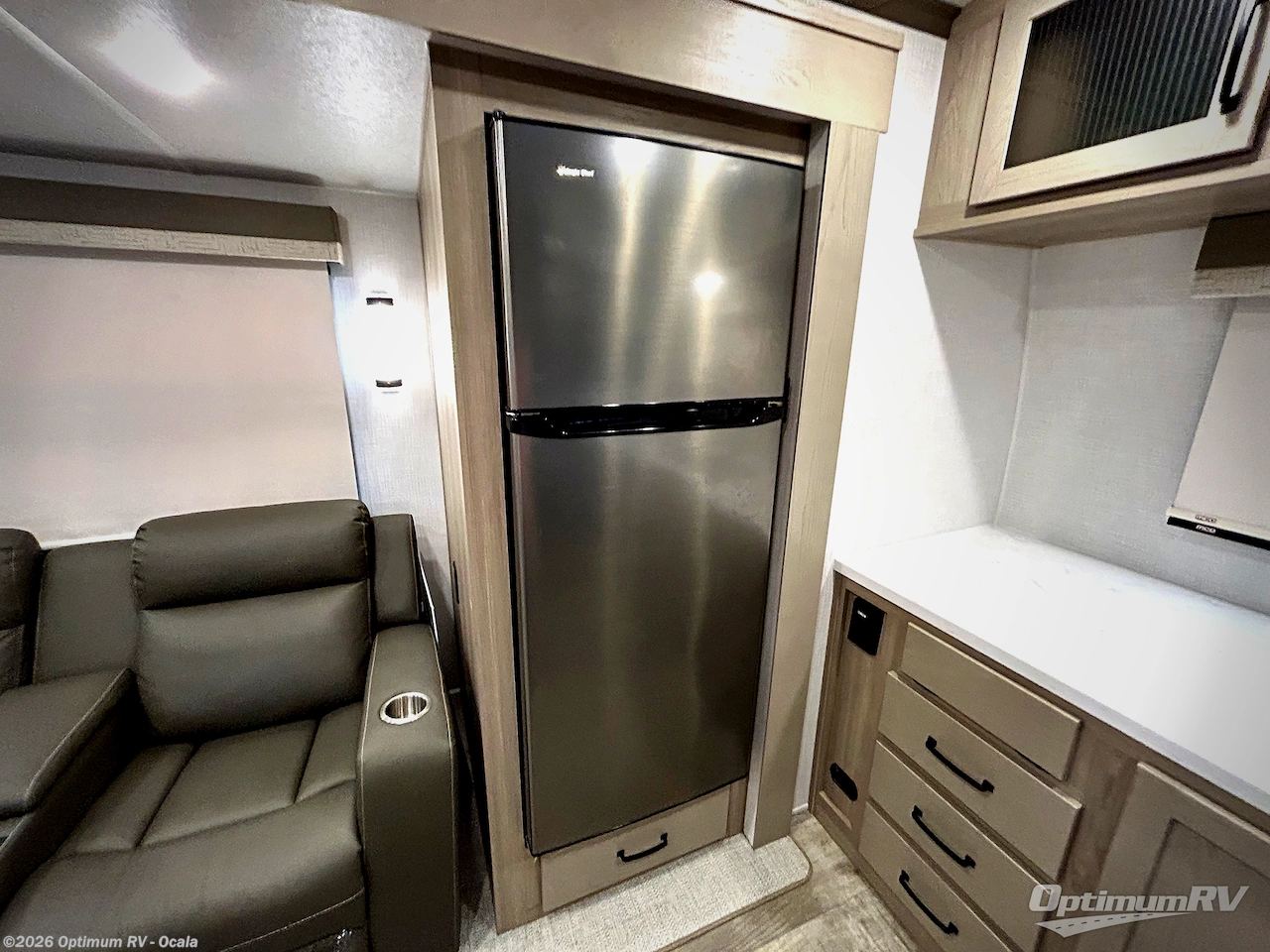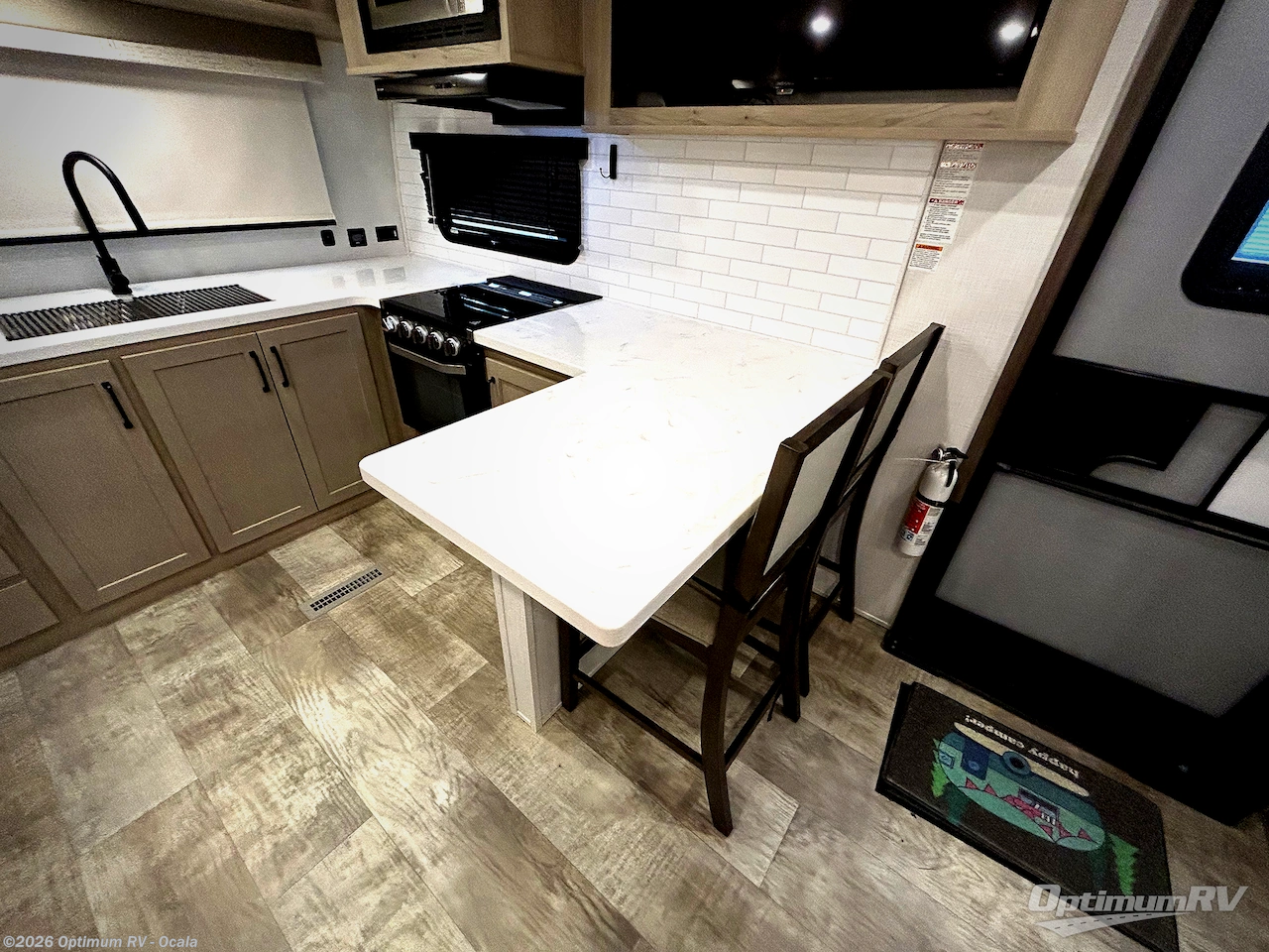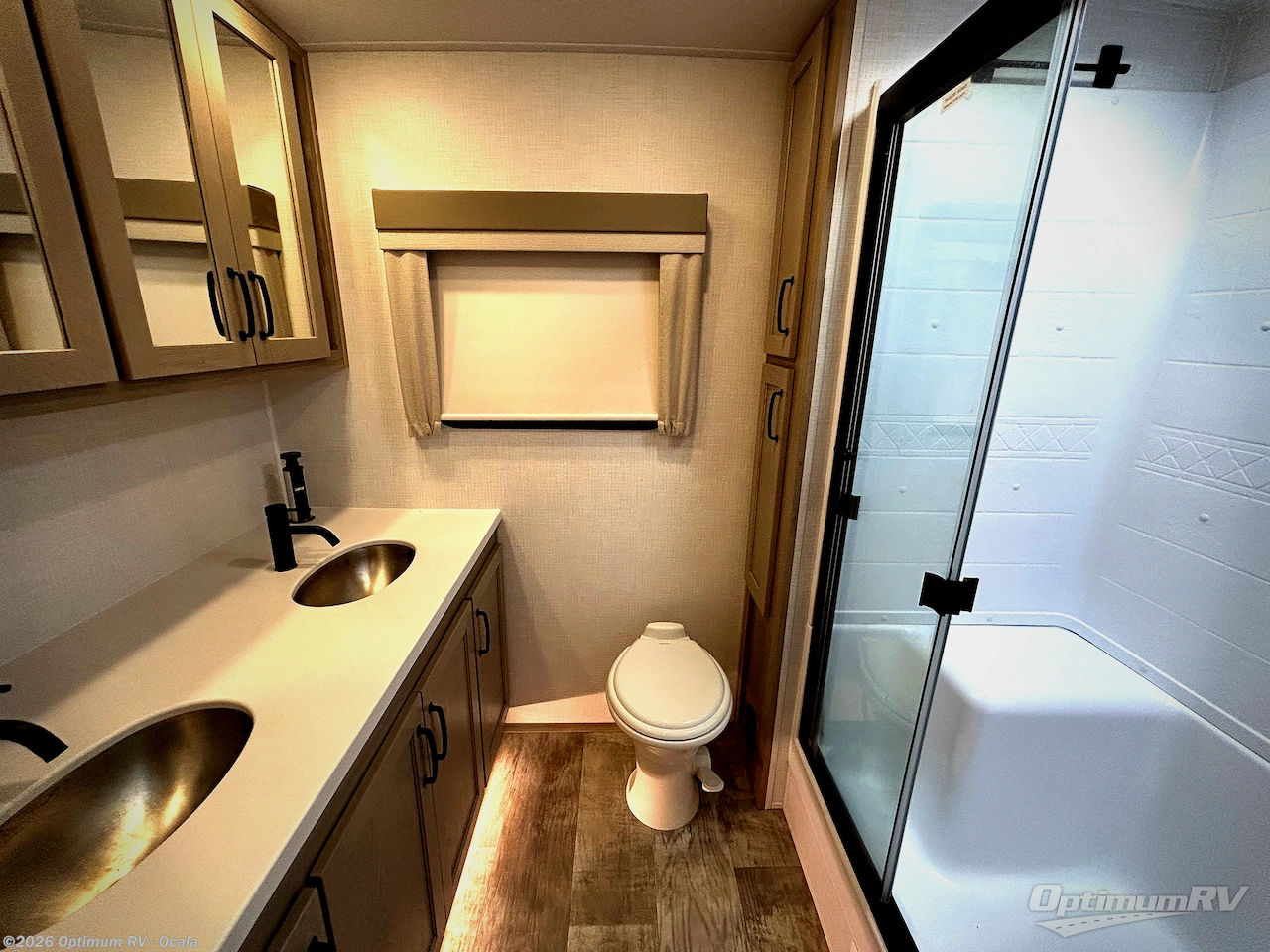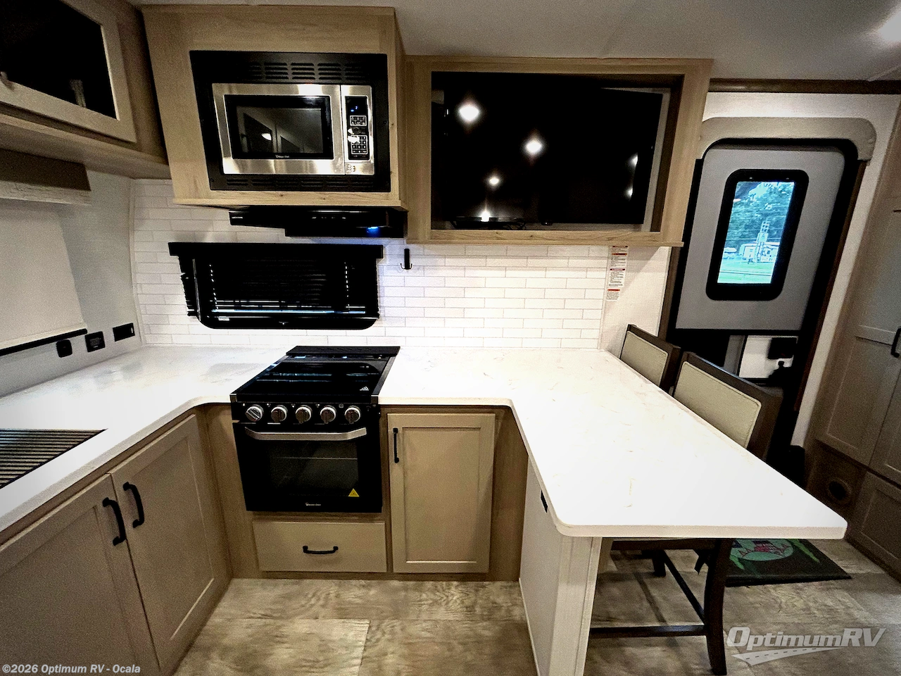 You will love how open this travel trailer will feel with the large front window that you can look out from the two-person bar top seating! The front kitchen has plenty of countertop space for you to prepare your best meals. Your nights will be spent in true relaxation with a 67" theater seating and king bed slide in the bedroom for a great night's rest. The full rear bathroom has a shower with a seat to take a nice, hot shower before bed, and a dual-sink vanity for two to get ready at once in the mornings!