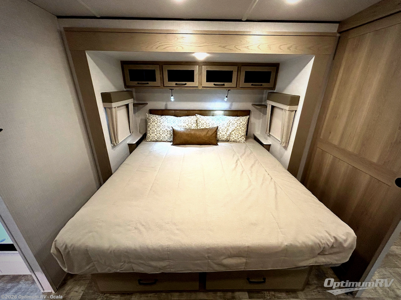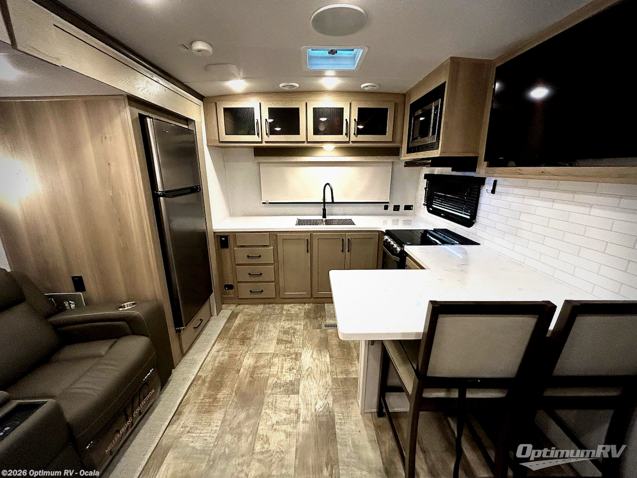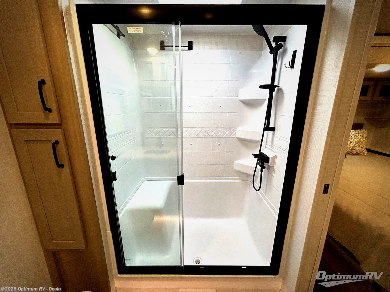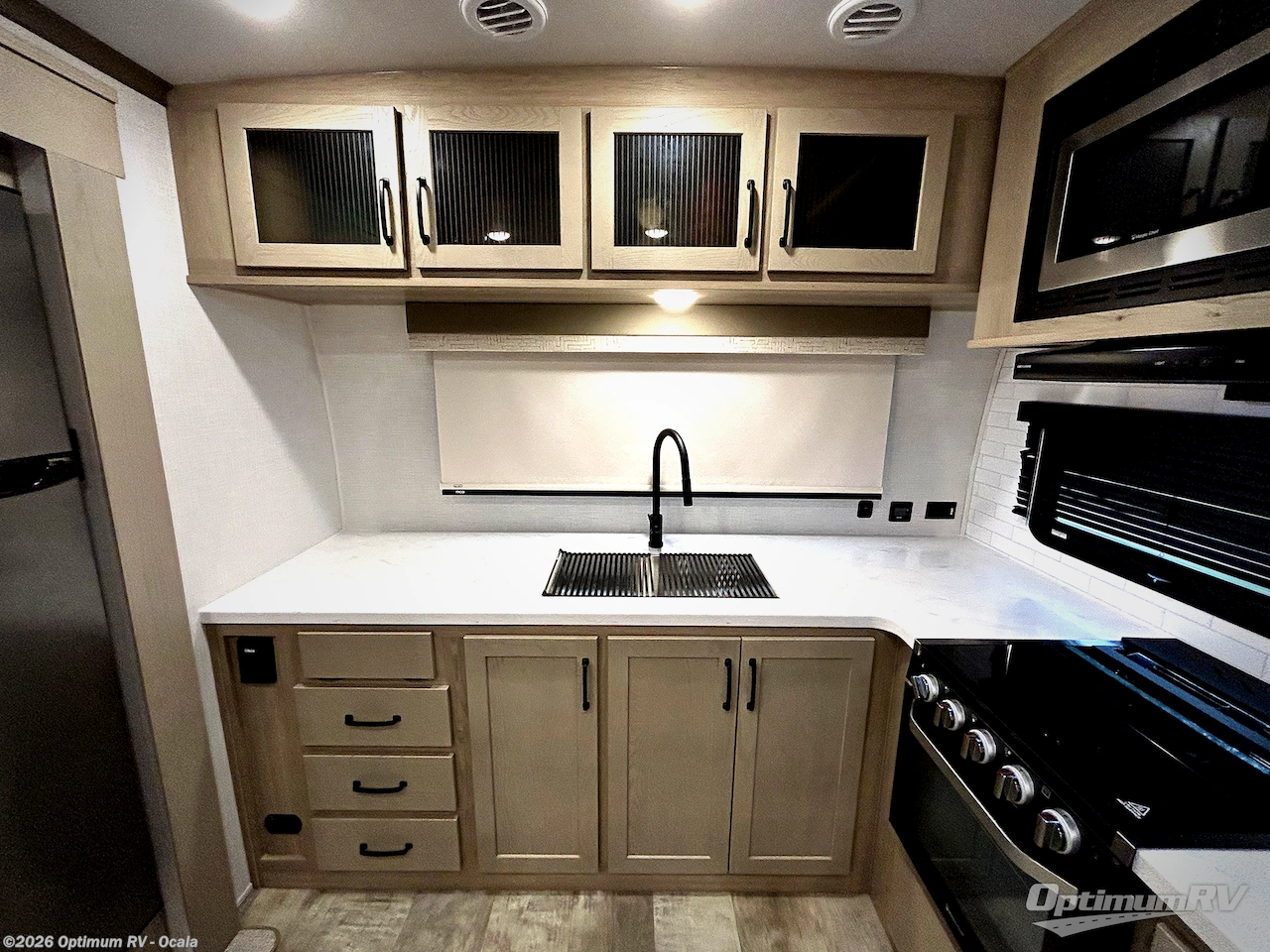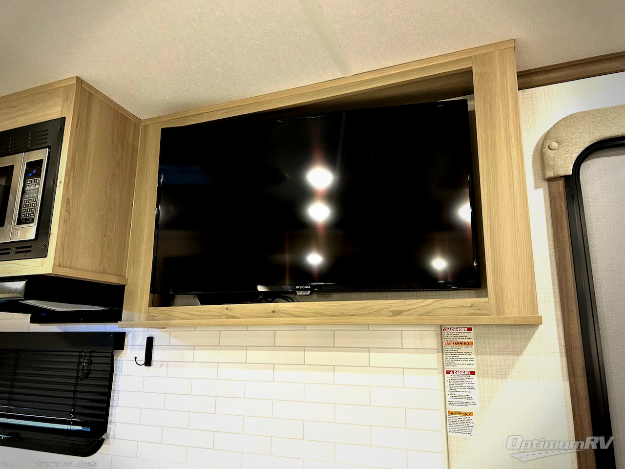 You will love how open this travel trailer will feel with the large front window that you can look out from the two-person bar top seating! The front kitchen has plenty of countertop space for you to prepare your best meals. Your nights will be spent in true relaxation with a 67" theater seating and king bed slide in the bedroom for a great night's rest. The full rear bathroom has a shower with a seat to take a nice, hot shower before bed, and a dual-sink vanity for two to get ready at once in the mornings!