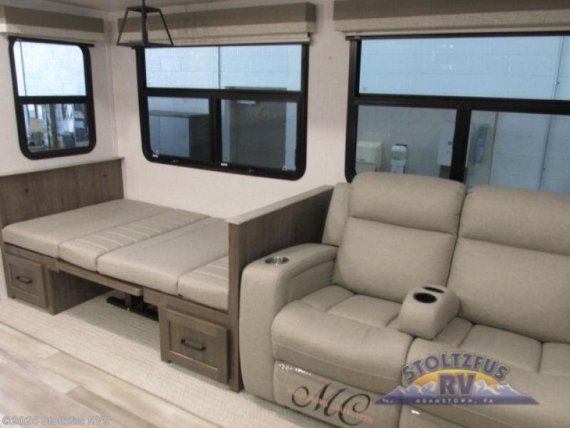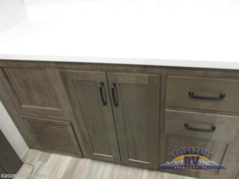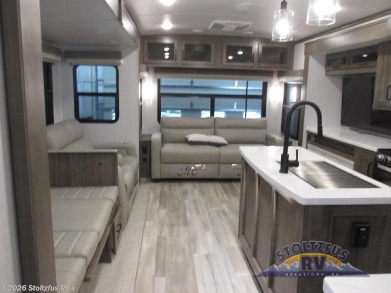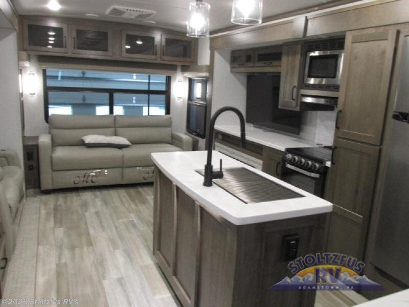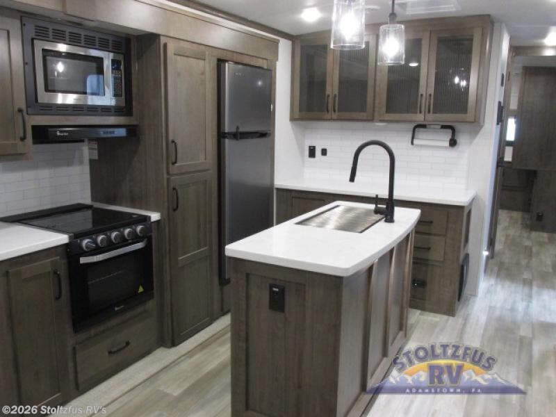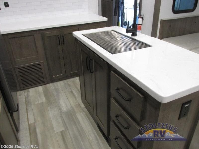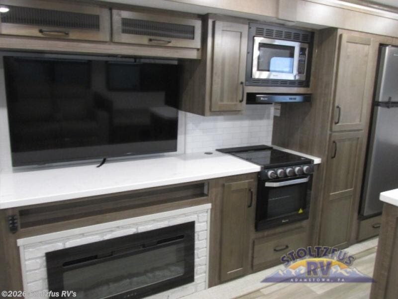 The large windows in the rear and door side slide will bring nature's scenery indoors with this travel trailer! Everyone can relax together in the rear living area featuring a 76" hide-a-bed sofa and 60" theater seating across from the entertainment center with a fireplace. Meal prepping will be even easier with the kitchen island, and the 39" booth dinette is a comfortable place to enjoy your meals. The full bathroom has a shower with a seat and a linen closet to keep your towels close. You will feel well rested each morning after sleeping on the king bed slide in the front private bedroom which also has a wardrobe with washer and dryer prep and an area to add an optional TV!