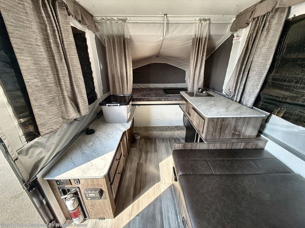 With any Limited Series folding pop-up campers by Forest River you will enjoy simple, yet convenient camping features. There are nitrogen filled tires and leaf spring axles to provide a smooth tow from home to campground, and the rear stabilizer jacks with sand pads add stability once you're all set up. There is also a one-piece screen door, an electric water pump, and a power lift system for added convenience. The interior includes LED lights, an inside/outside two burner stove, residential style cabinet doors, and a wood look floor you are sure to love.
