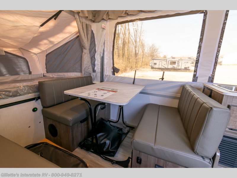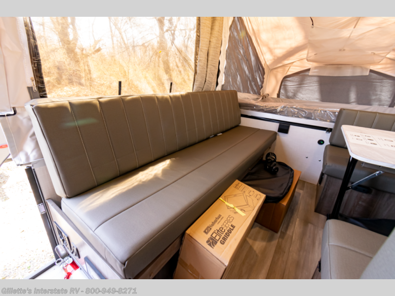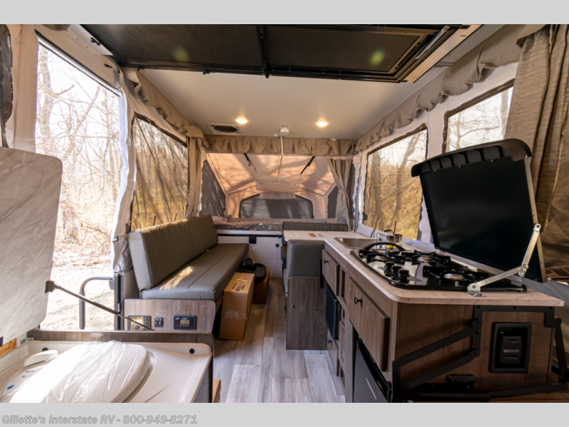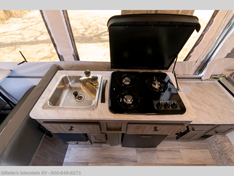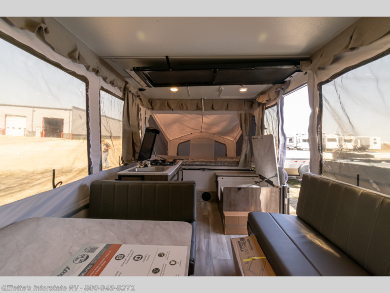 You will be so excited to get your hands on this Flagstaff SE folding pop-up camper! This camper is truly ready for the sports enthusiast because it comes with a 28" x 84" front deck storage with expanded metal decking, so you can bring along the sports equipment that best suits your taste. The exterior is even more useful with the outdoor griddle and 10' 6" awning, and once you step foot inside, you'll be met with a swing galley directly across from the entrance. There are two cabinets that can be used for interior storage, and the two tent beds on either side of this camper stay out of the way of your interior living space. For relaxing, there is a booth dinette and gaucho bed with a table extension in between, and the shower/cassette toilet is sure to be a big convenience!
