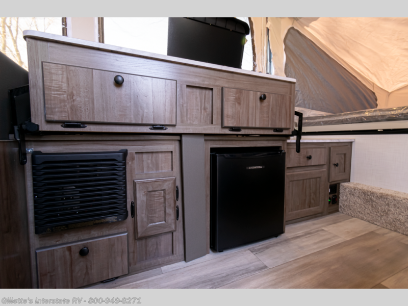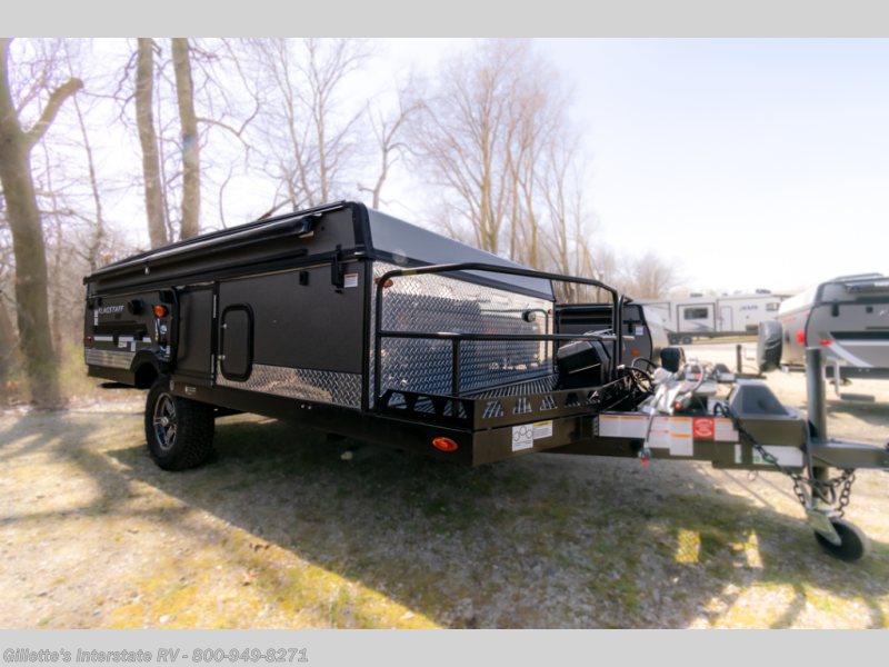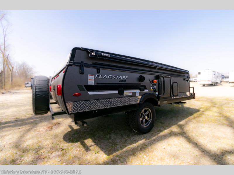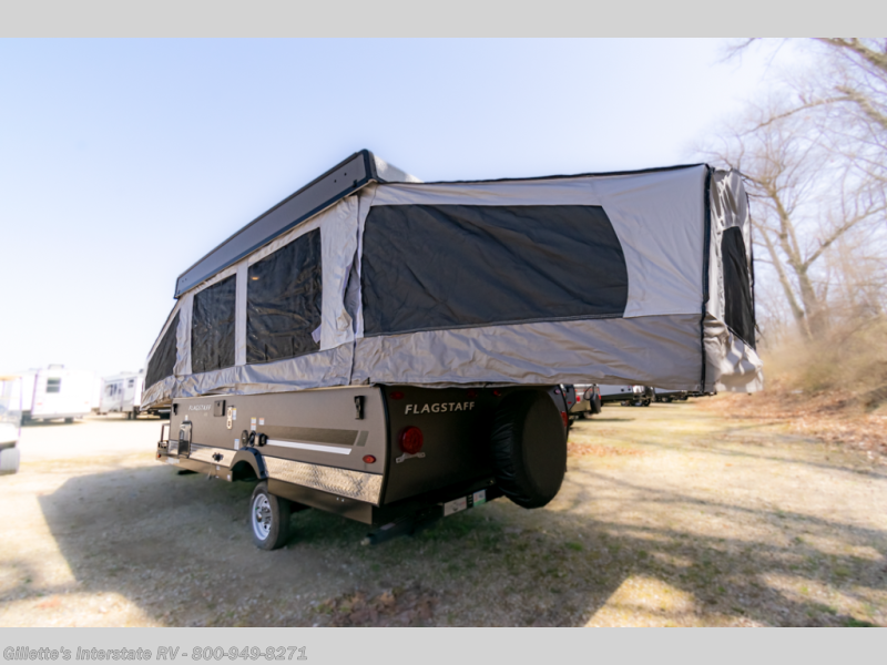 If outdoor sports are the reason you want to get away, then the Forest River Flagstaff SE folding pop-up camper is precisely what you need! These Sports Enthusiast Package (SE) campers have proven that they are sports-friendly and camping-approved. Built with a gray sport exterior, autumn wood interior, and wood plank flooring, the Flagstaff SE is ready for all sorts of outdoor experiences. There are also electric brakes, a black diamond plate, and aluminum wheels with 15" Mud Rover tires. There is a power roof lift to make set-up more effortless, and don't overlook the 200W roof-mount solar panel that can be used to provide you with power as you search for a new secluded destination.