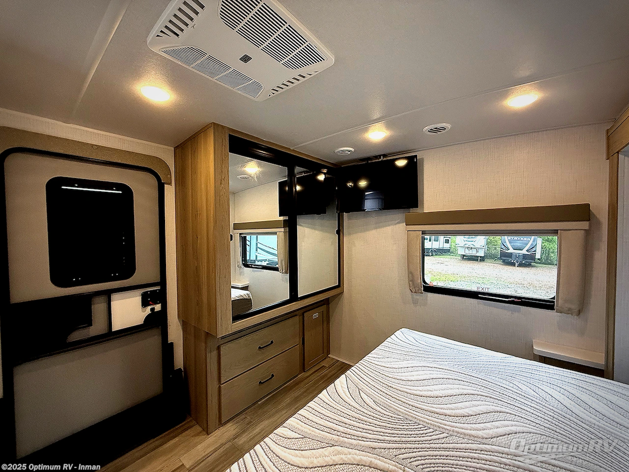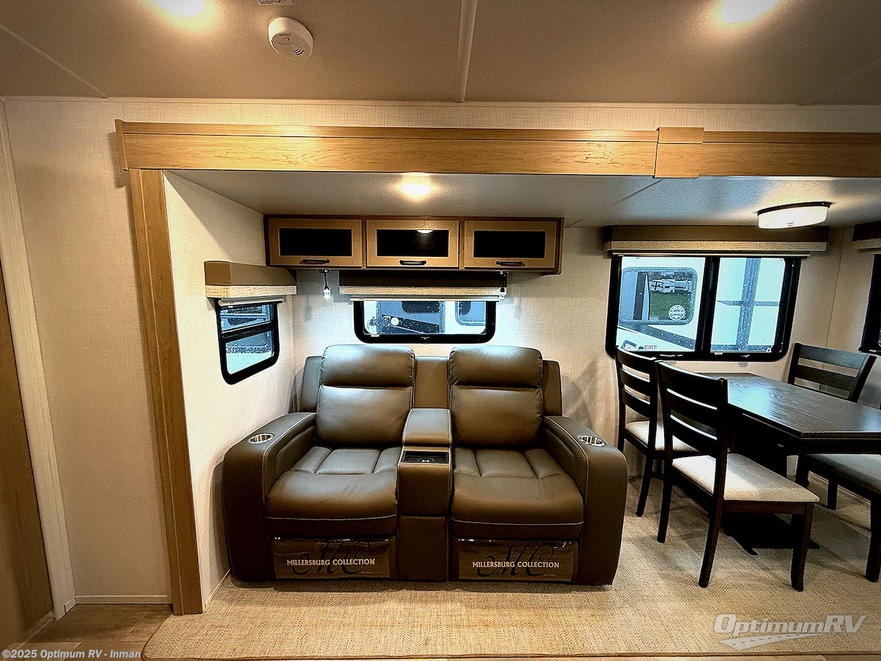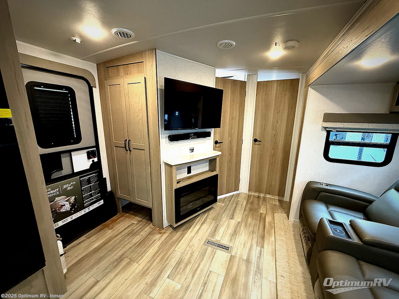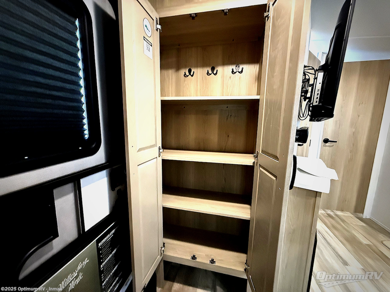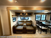 This is the perfect couples trailer with a spacious living and kitchen area and a rear bedroom which includes the second exterior entry/exit door! The bedroom also provides a slide out queen bed, a wardrobe and an optional TV, plus windows for great views and access to the double entry bathroom. The front kitchen gives the cook counter space and cabinetry for dishes and such, plus all the appliances needed to make warm meals and store leftovers. You can dine at the booth dinette, relax on the 67" theater seating and watch the Smart TV while enjoying the fireplace.