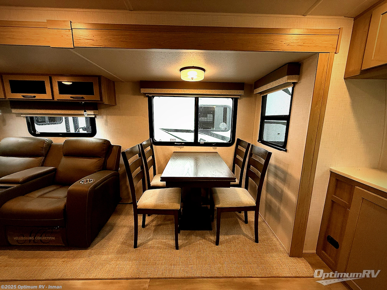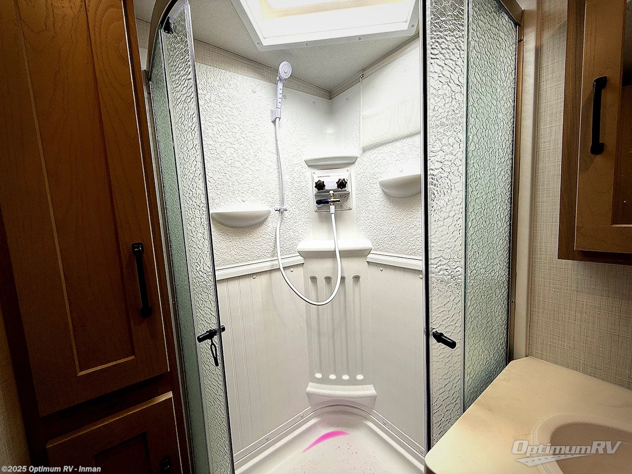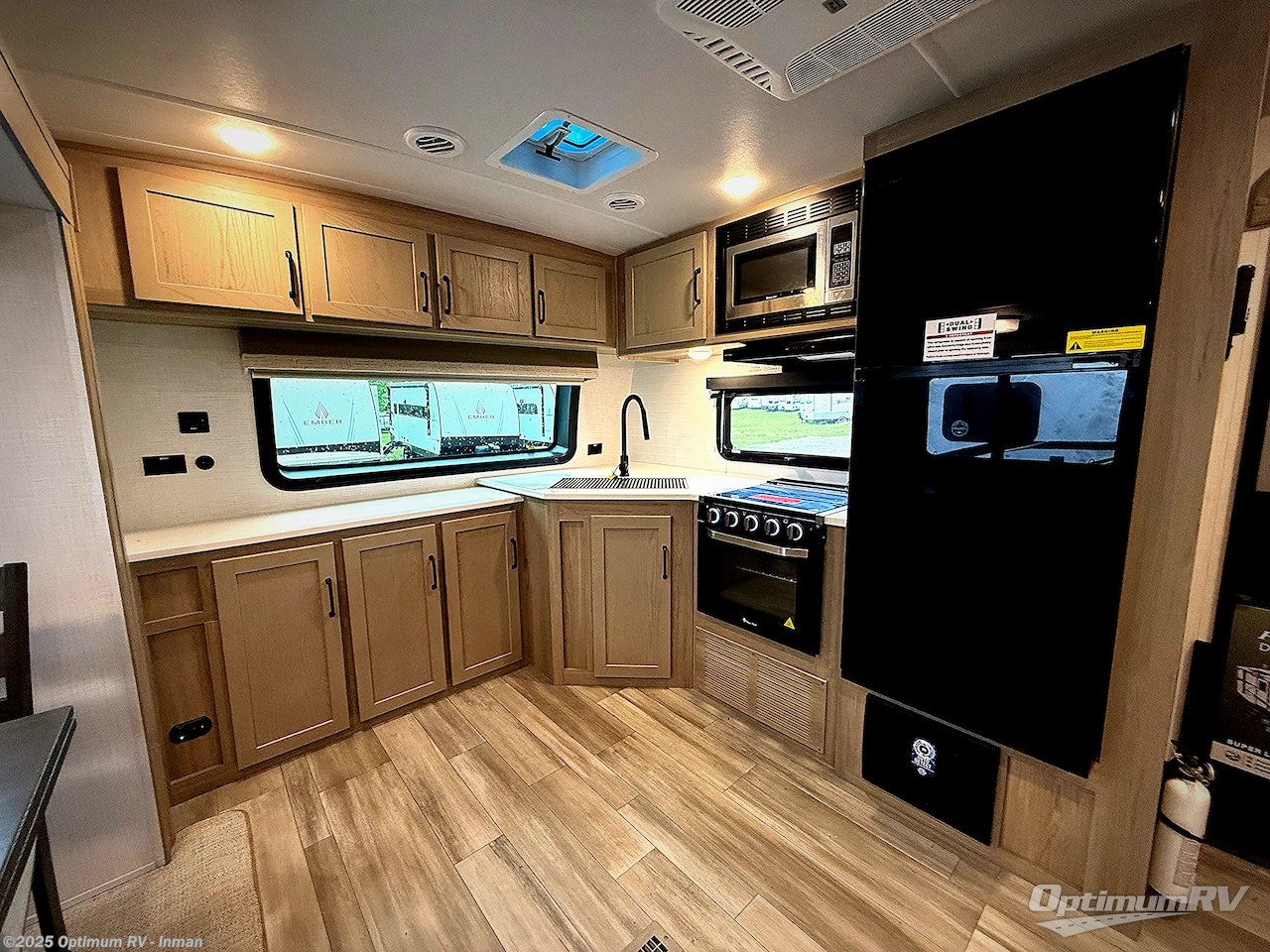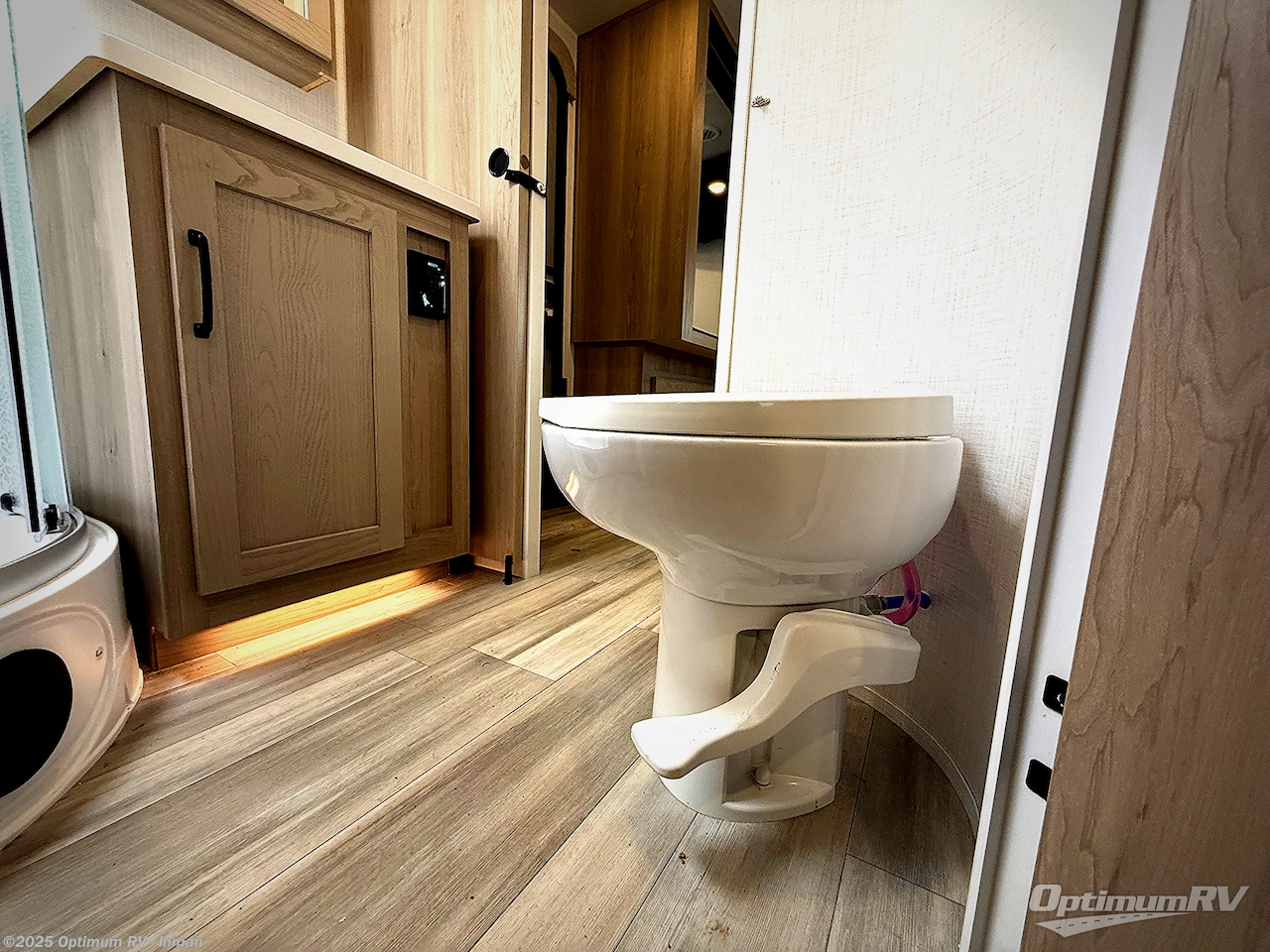 This is the perfect couples trailer with a spacious living and kitchen area and a rear bedroom which includes the second exterior entry/exit door! The bedroom also provides a slide out queen bed, a wardrobe and an optional TV, plus windows for great views and access to the double entry bathroom. The front kitchen gives the cook counter space and cabinetry for dishes and such, plus all the appliances needed to make warm meals and store leftovers. You can dine at the booth dinette, relax on the 67" theater seating and watch the Smart TV while enjoying the fireplace.