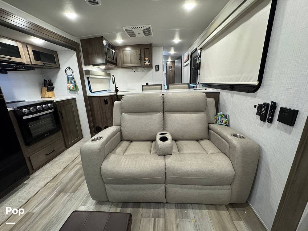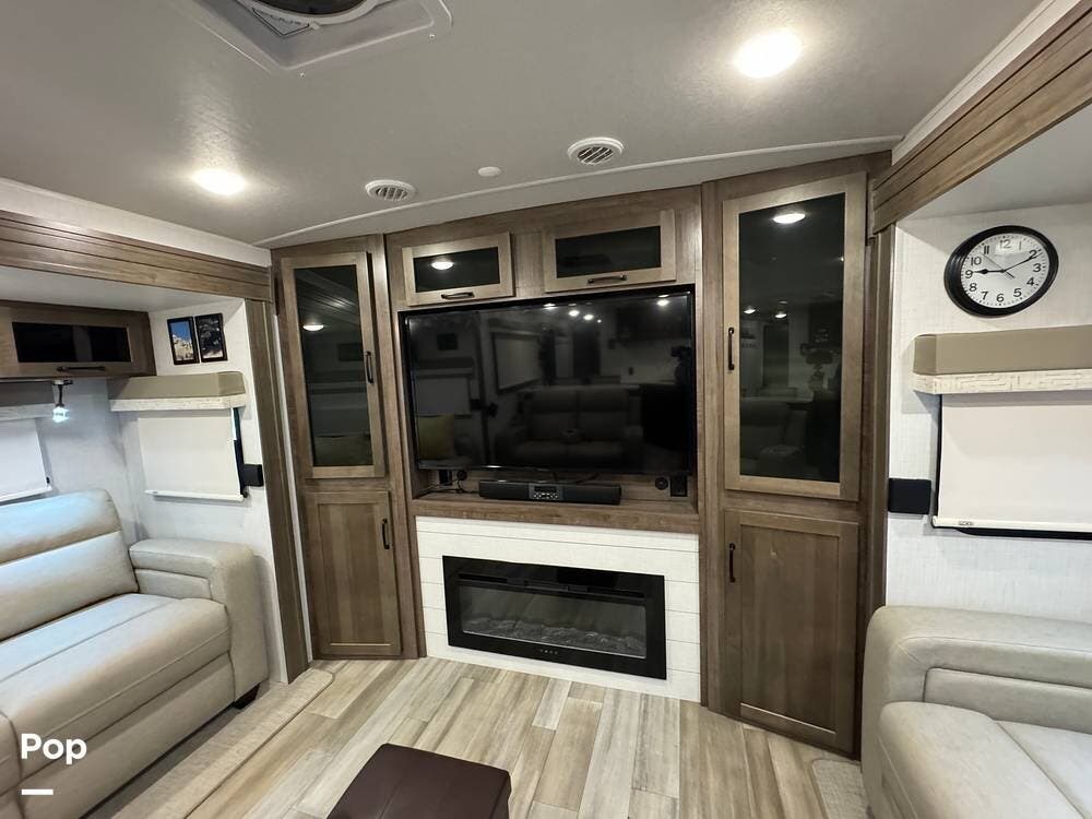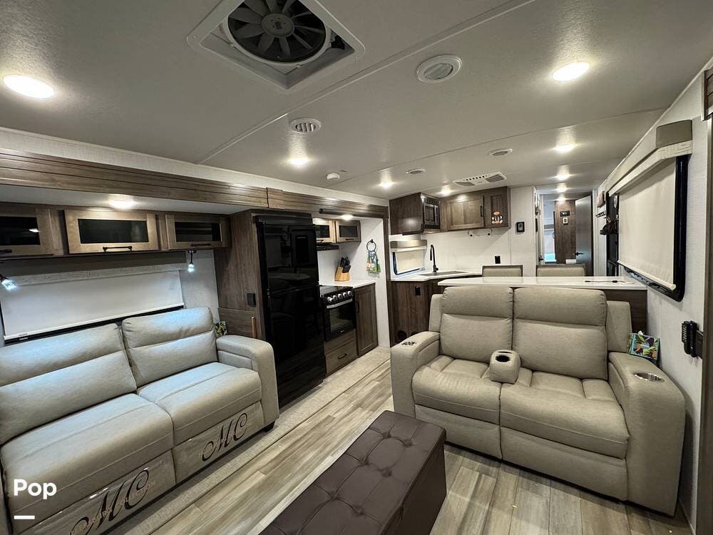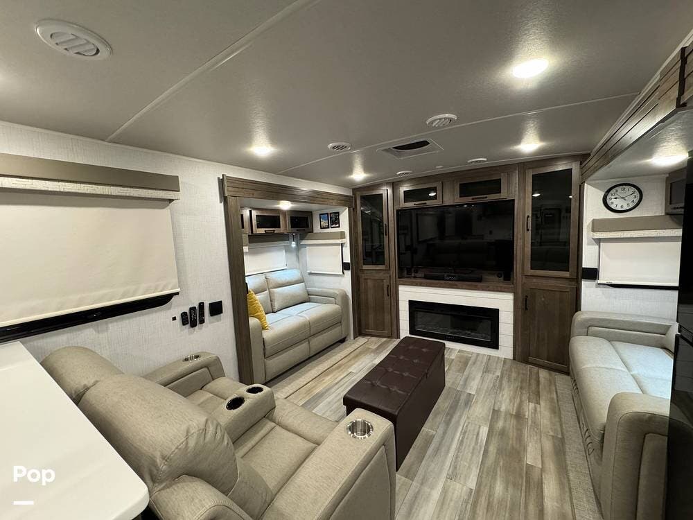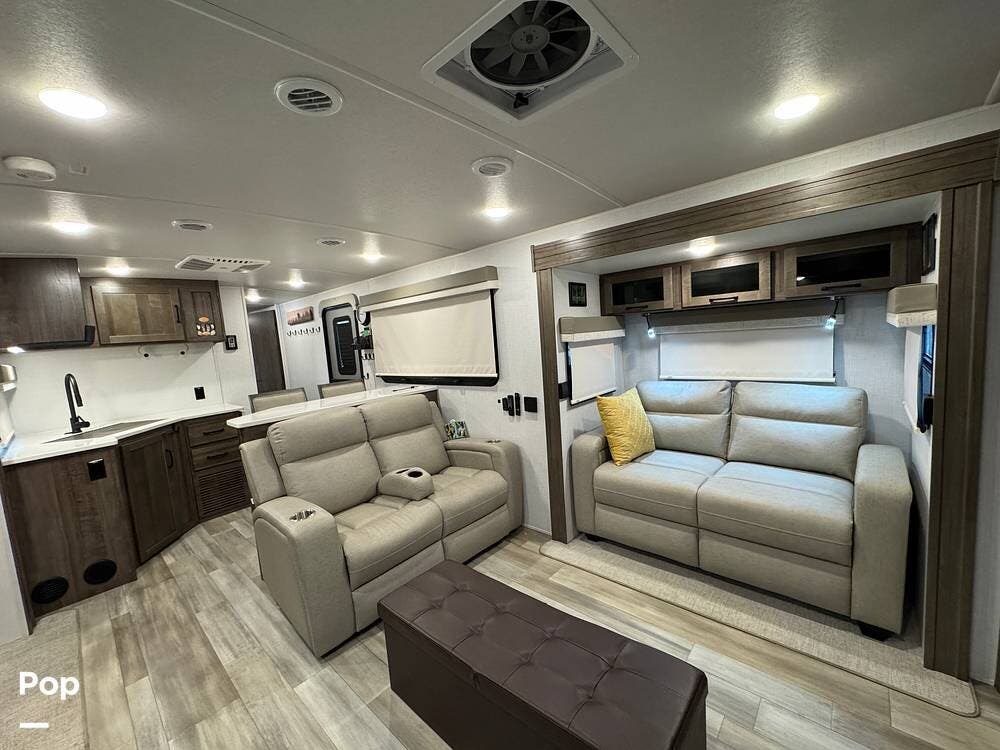 The rear living area is perfect for relaxing or entertaining, featuring a 60" TV, twin theater seating, and two sofa sleepers for guests.