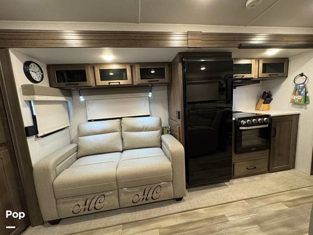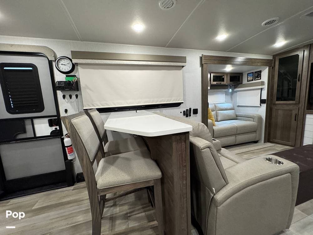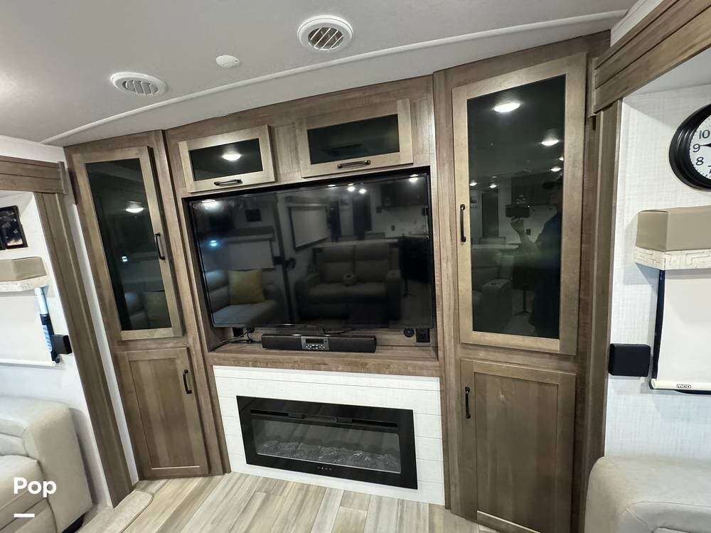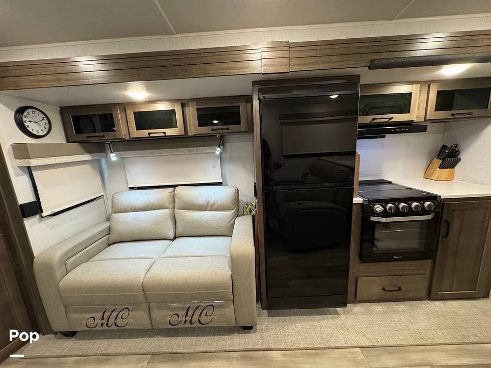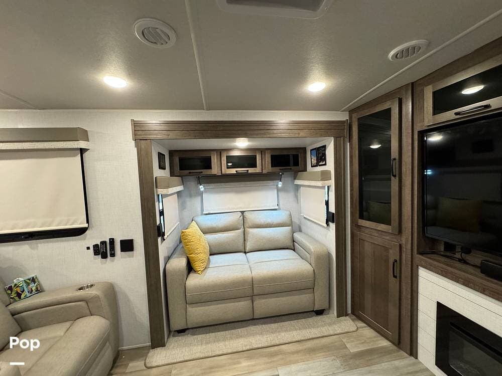 The rear living area is perfect for relaxing or entertaining, featuring a 60" TV, twin theater seating, and two sofa sleepers for guests.
