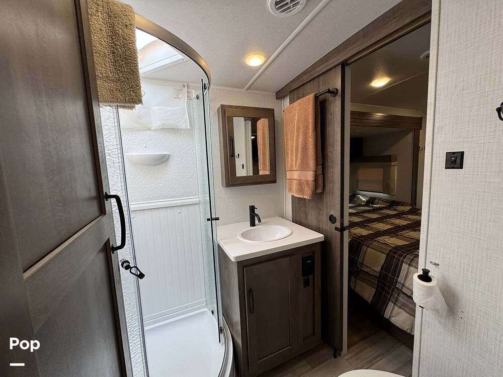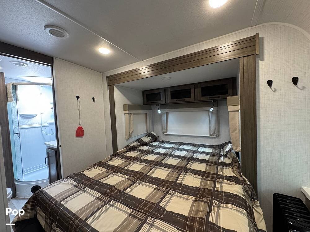 The private bedroom offers a comfortable queen bed, while the spacious bathroom includes a large shower for added comfort on the road.