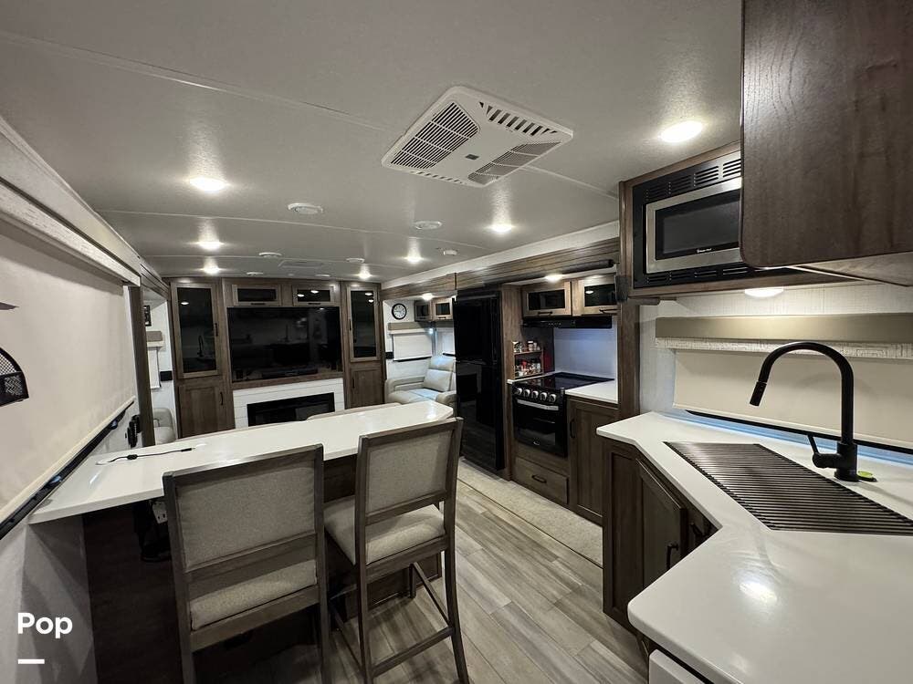 The kitchen is fully equipped with an island counter and two bar stools, a 14.5 cu. ft. refrigerator/freezer, microwave, oven, and 3-burner stove.