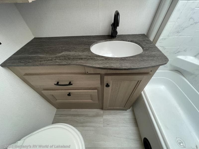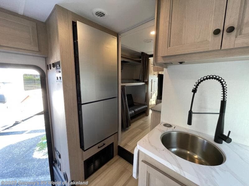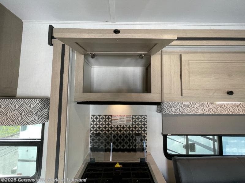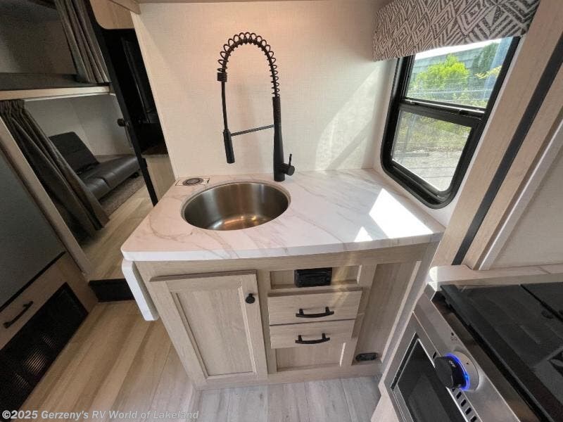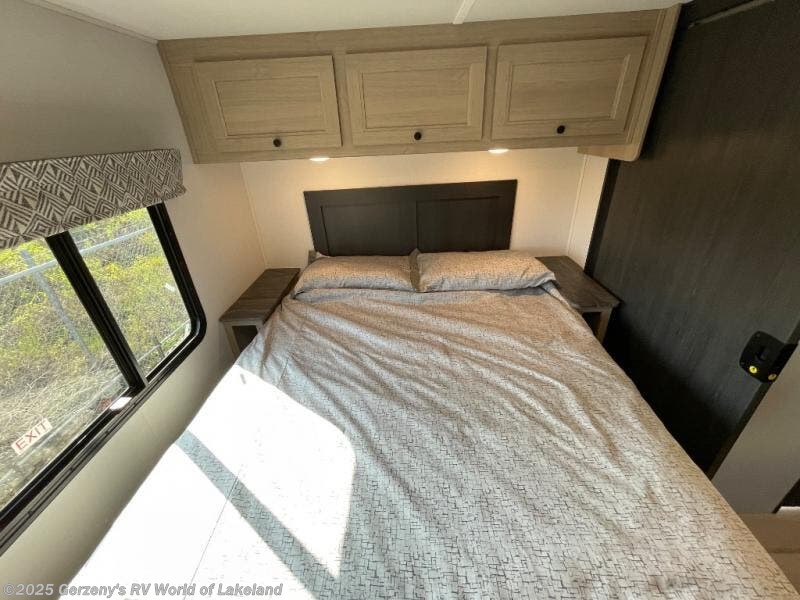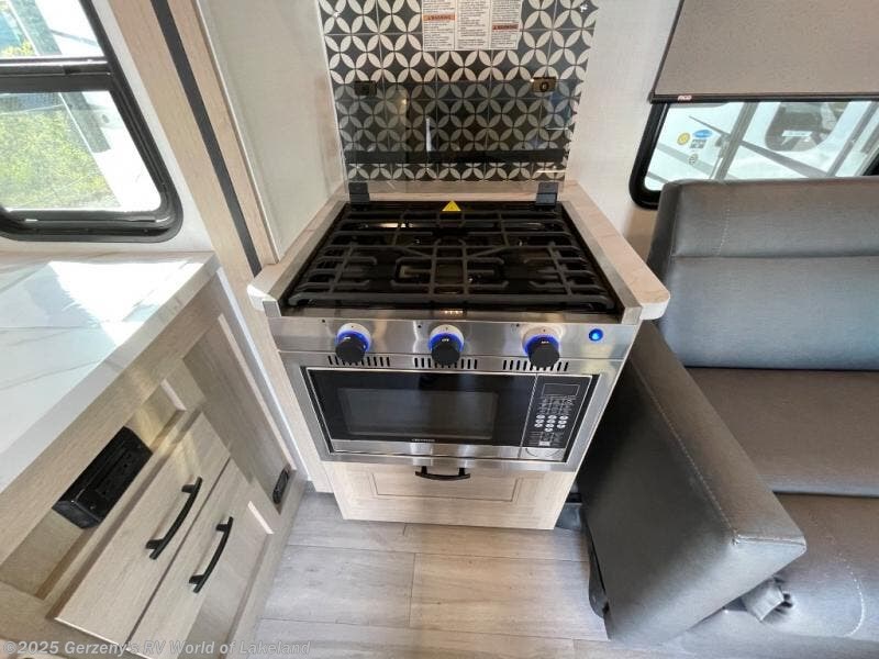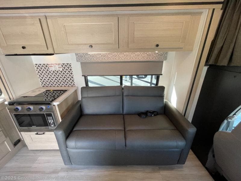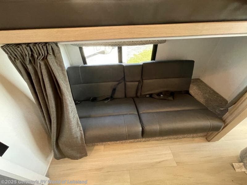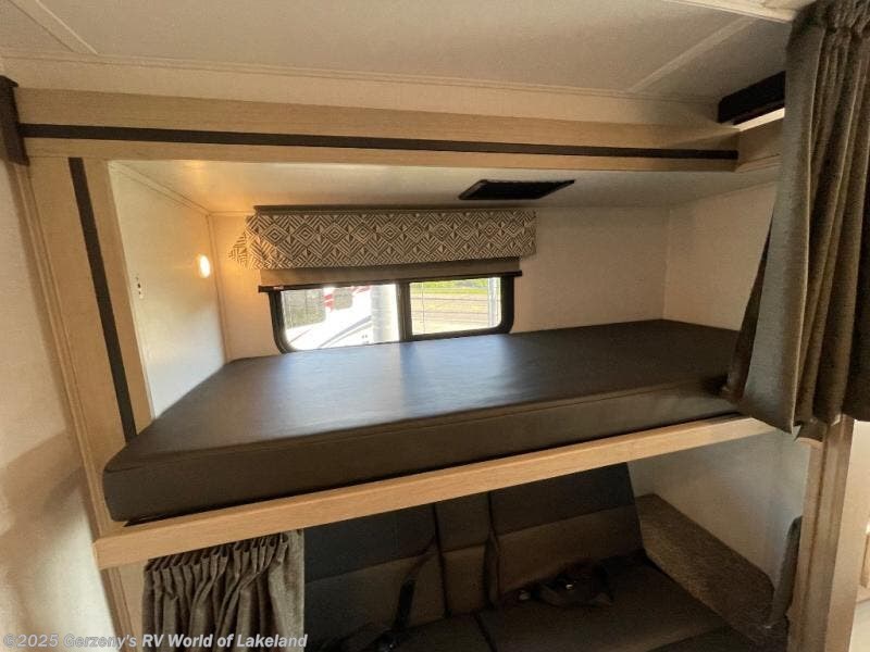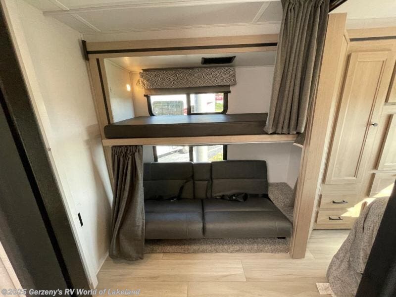 This family friendly coach allows the kids to have their own space either on the flip-down bunk above the kid's sofa sleeper that is across from the full bathroom or on the cab-over bunk. You will have the rear bedroom all to yourselves with a queen bed and a large wardrobe for your things. Everyone can visit while relaxing on the sofa and booth dinette while watching the LED TV or even while sitting under the 11' power awning outside when you add your camping chairs. The kitchen offers a corner area to make meals with a convection microwave and recessed three-burner range, plus a round sink and flip-up counter extension, and you can store cold items in the 10.7 cu. ft. 12V refrigerator near the entry, and the soft touch self-closing drawer guides and cordless 12V charging plate are features you will love.