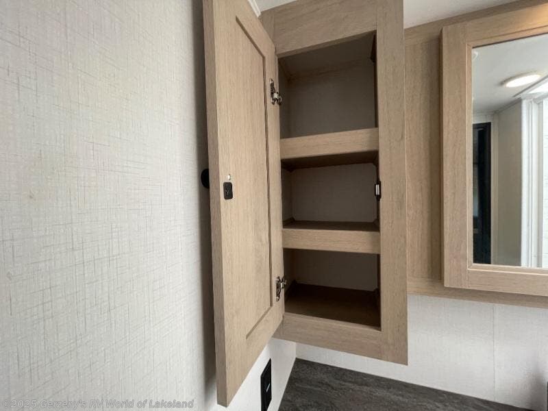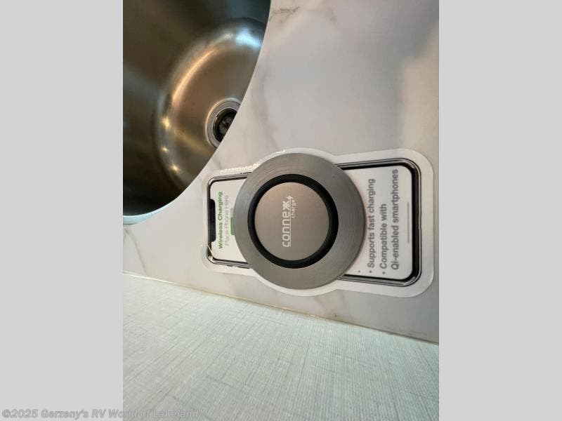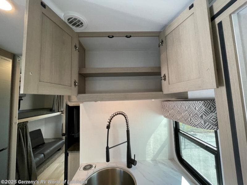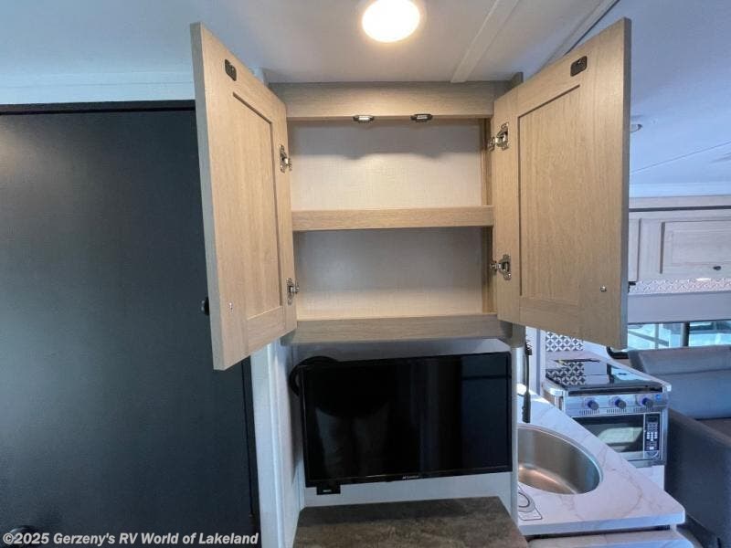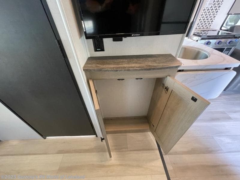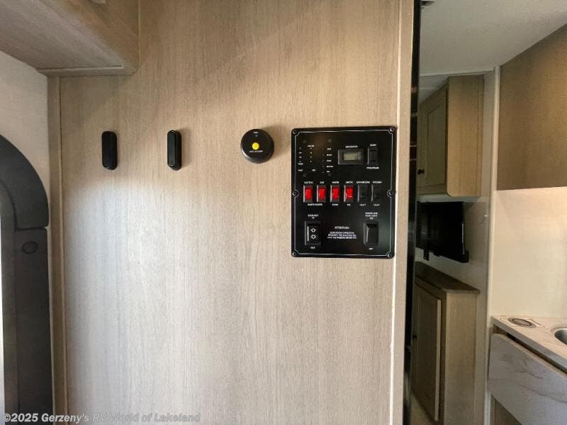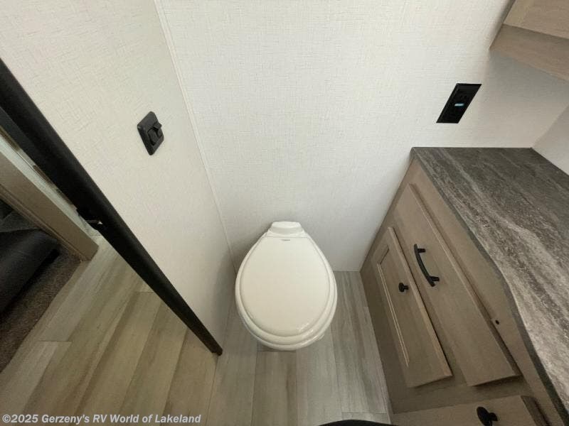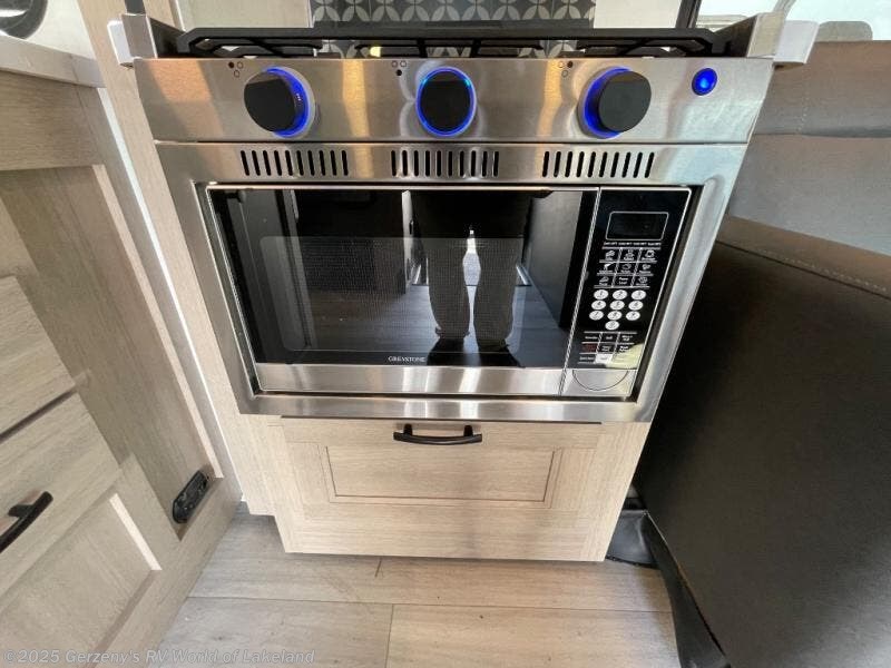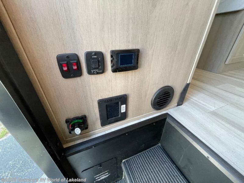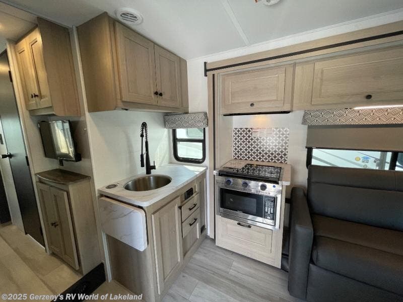 This family friendly coach allows the kids to have their own space either on the flip-down bunk above the kid's sofa sleeper that is across from the full bathroom or on the cab-over bunk. You will have the rear bedroom all to yourselves with a queen bed and a large wardrobe for your things. Everyone can visit while relaxing on the sofa and booth dinette while watching the LED TV or even while sitting under the 11' power awning outside when you add your camping chairs. The kitchen offers a corner area to make meals with a convection microwave and recessed three-burner range, plus a round sink and flip-up counter extension, and you can store cold items in the 10.7 cu. ft. 12V refrigerator near the entry, and the soft touch self-closing drawer guides and cordless 12V charging plate are features you will love.