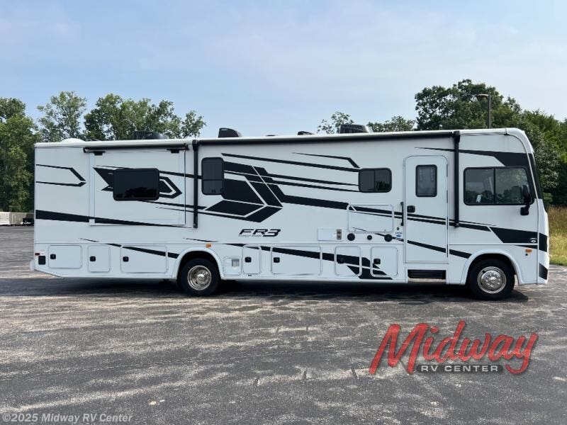 With each FR3 Class A gas motorhome by Forest River, you will find an easy-to-drive coach with a spacious interior allowing you to gather with friends and family with convenience and style found throughout! Each is built with vacuum-bonded construction, a one-piece fiberglass roof with extended rain spouts, a steel firewall and A-pillar extension, Bi-LED headlamps and lower LED fog lights, and grey Rotocast storage boxes with drains. Inside, you will enjoy black hardware, appliances, plumbing fixtures, and a glass shower door frame. You will also find a stainless steel kitchen sink with a bamboo cutting board and roll-up dryer, heavy-duty full-extension ball bearing drawer guides, dual-access dinette storage with doors, and nightstands with charging stations to keep your cellphones ready for whatever is next. Make your selection today!