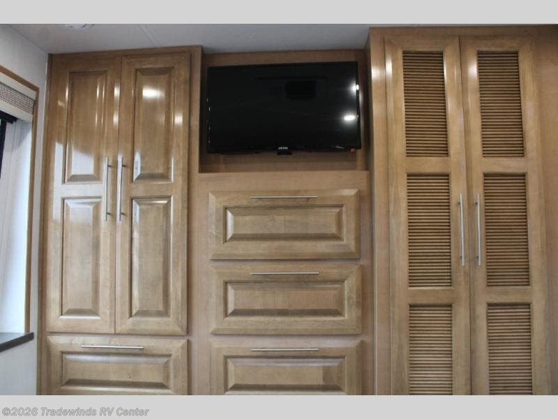 Comfort is found throughout this spacious coach for six! Once you arrive at the campground, the swivel captain's seats can become a part of the living area, and your guests can sit on the theater seating or booth dinette. The full kitchen includes a recessed three burner LP cooktop, a stainless steel convection microwave, plus an 18 cu. ft. three door residential refrigerator with water and ice. You will find a private sink and toilet, with the shower across the hall so two people can freshen up at once, and the rear bedroom will have you feeling at home. Here, you'll find a king bed slide out, a wardrobe, a second wardrobe with an optional washer and dryer, plus a dresser and 32" LED TV!