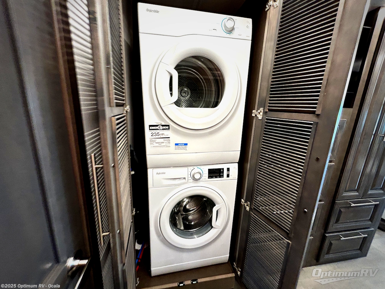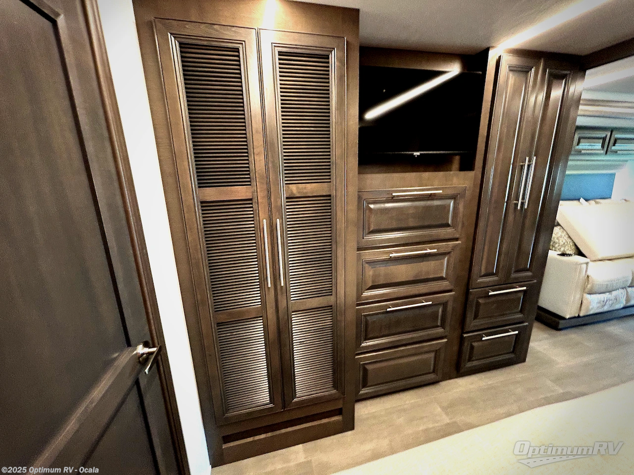 Comfort and convenience is found all throughout this motorhome! Starting with the full rear master bath that has a shower with a seat and a dual sink vanity, plus it leads into the private bedroom. Inside the bedroom is a 72" x 80" Power Tilt king bed slide with overhead cabinets across from a dresser with overhead cabinets and a 32" LED TV, a wardrobe, and another wardrobe that is prepped to add an optional stackable washer and dryer. The half bathroom is conveniently near the fully equipped kitchen so you can get back to creating your best home cooked meals fast. Relax in true comfort each night by either playing games at the booth dinette or on the theater seating that comes with power recline, heat, and massage!